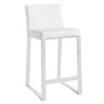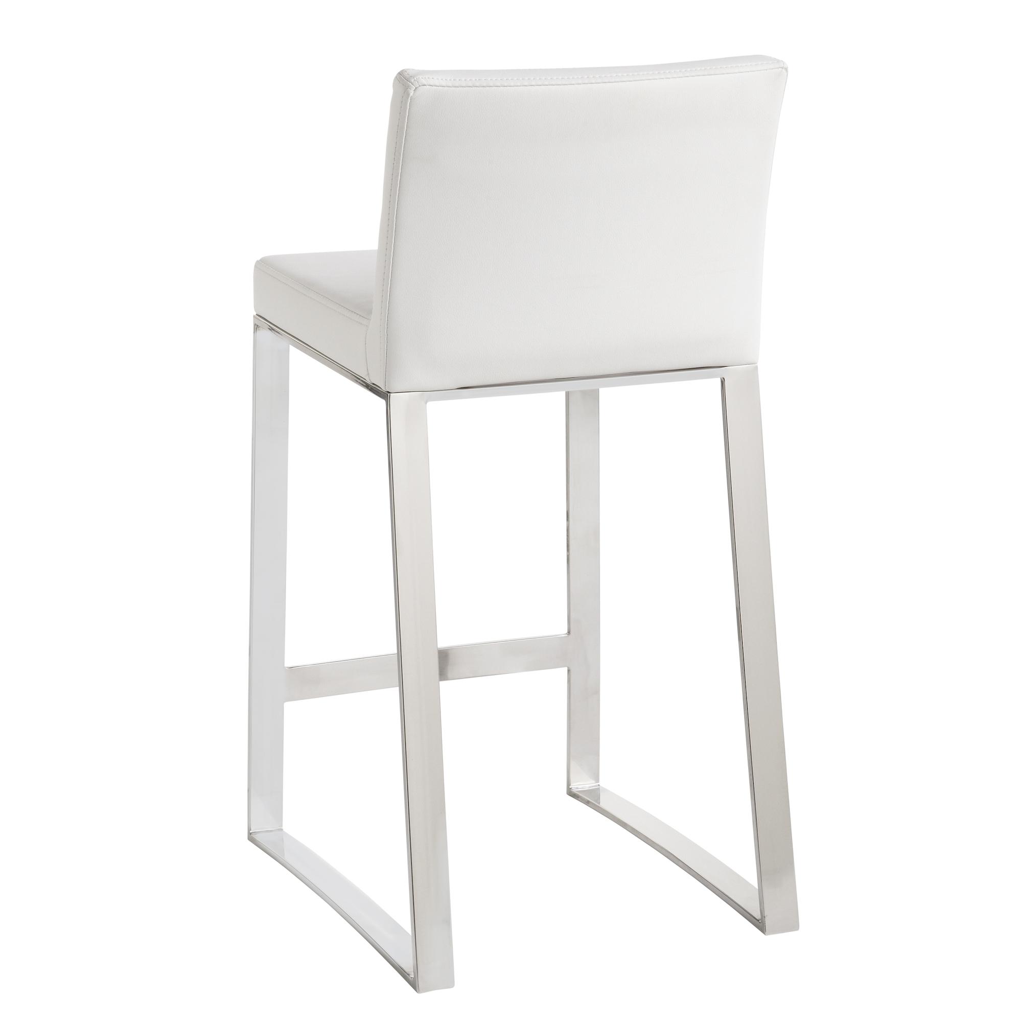Contemporary counter stool designed for urban kitchens and all types of contract environments. Features a polished stainless steel base. Stocked in white faux leather. Suitable for various dining, kitchen and bar spaces of all sizes.
