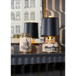 Inspired by architectural tours in European travels, this 19″ table lamp is crafted of a cream glazed ceramic canister with gold trim. The black shade directs light throughout the room while also highlighting the detailed building design. Display in a den, library or home office.