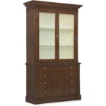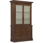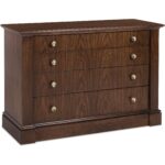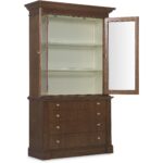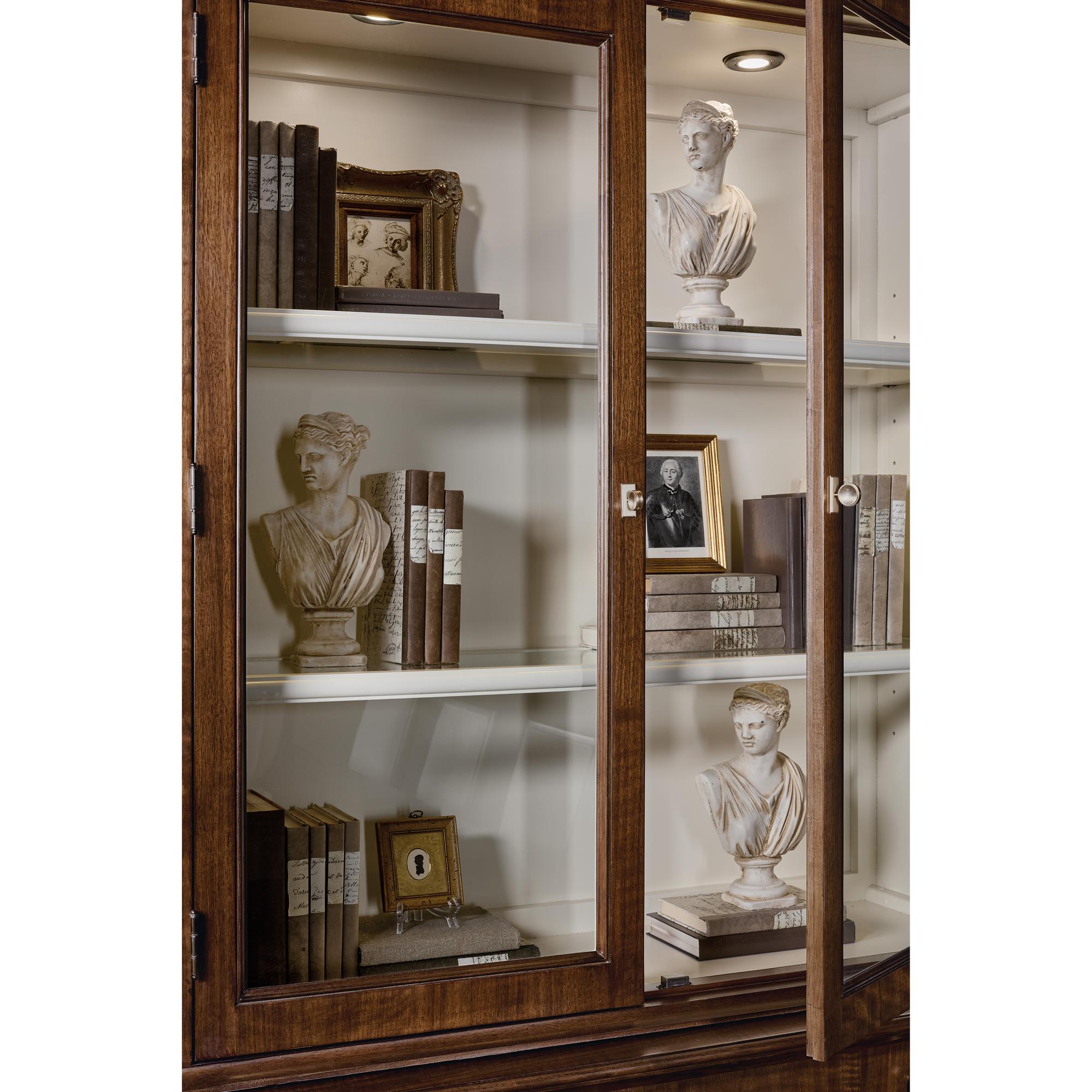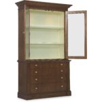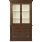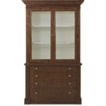 Finish: The high clarity Classic Walnut finish over cathedral figured walnut veneers adds richness and depth. Contrasting cream colored interior back panel. Custom knob and pull hardware in Satin Brass finish.