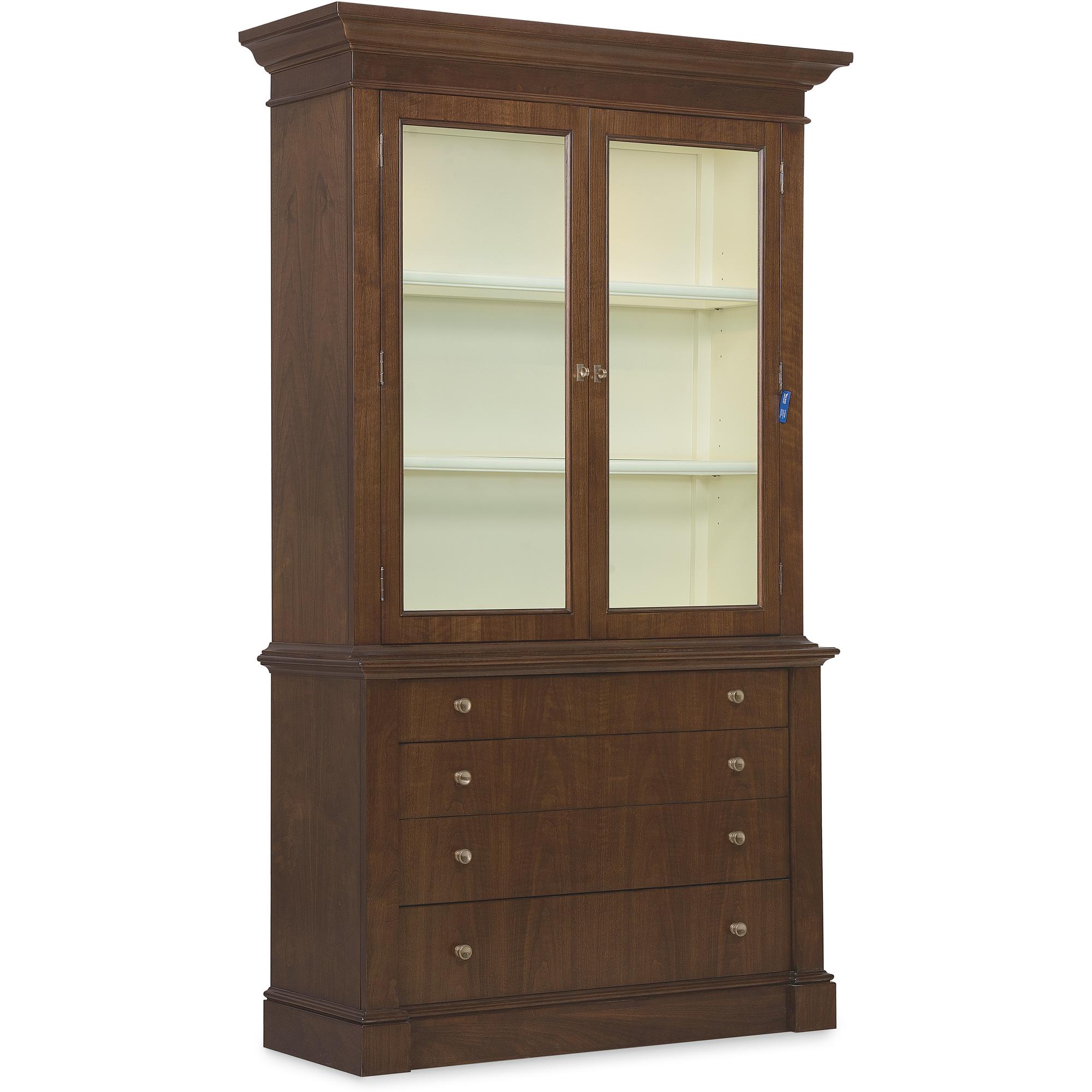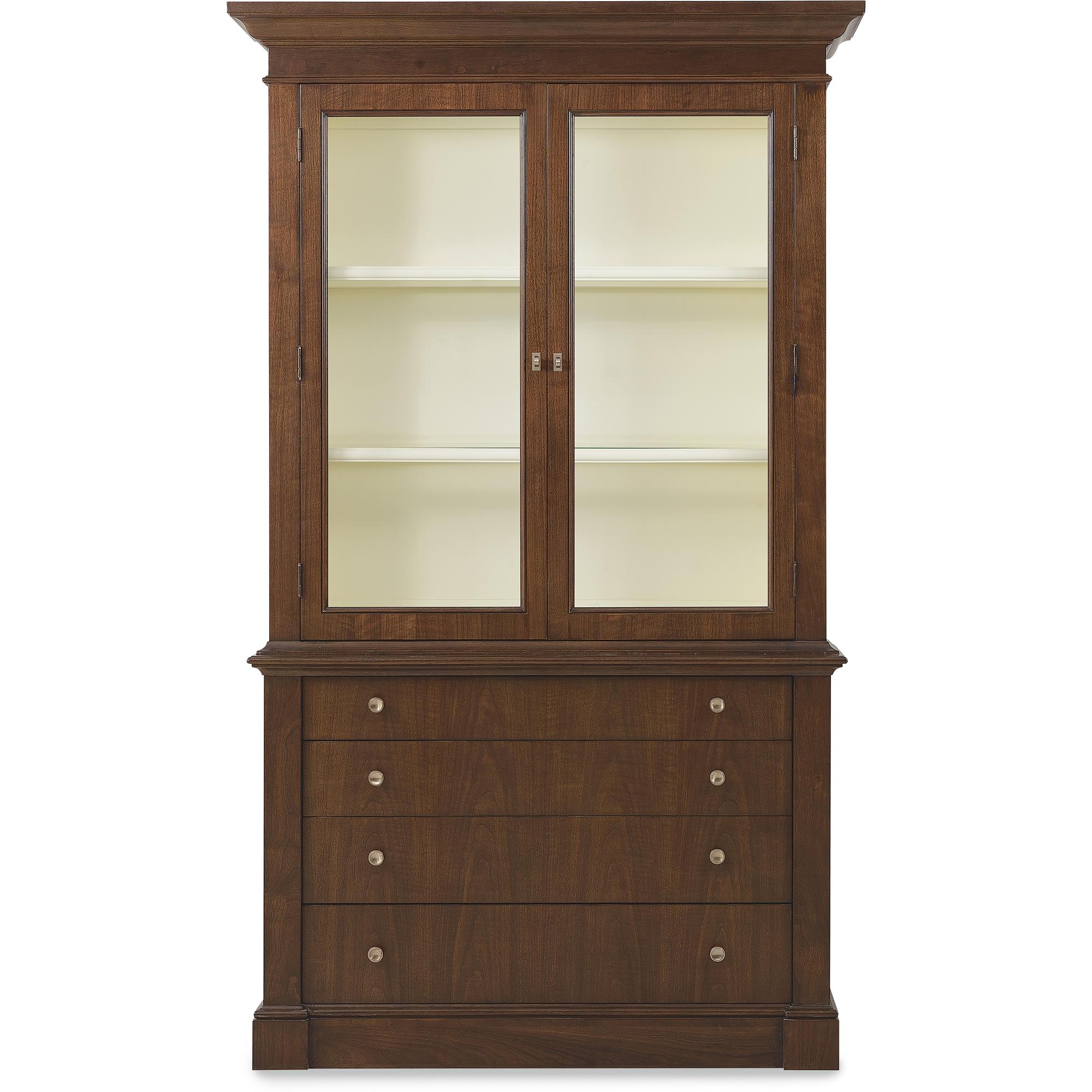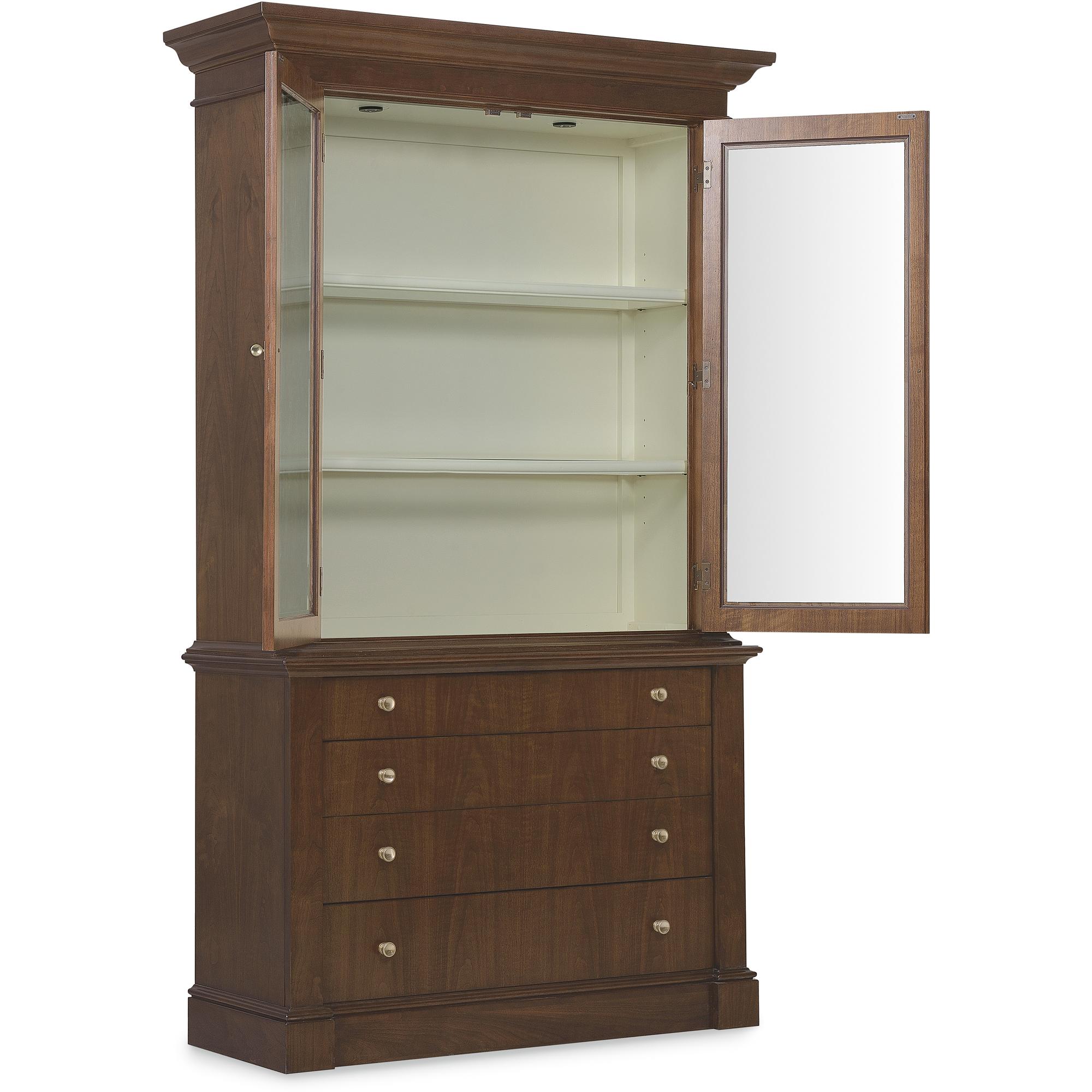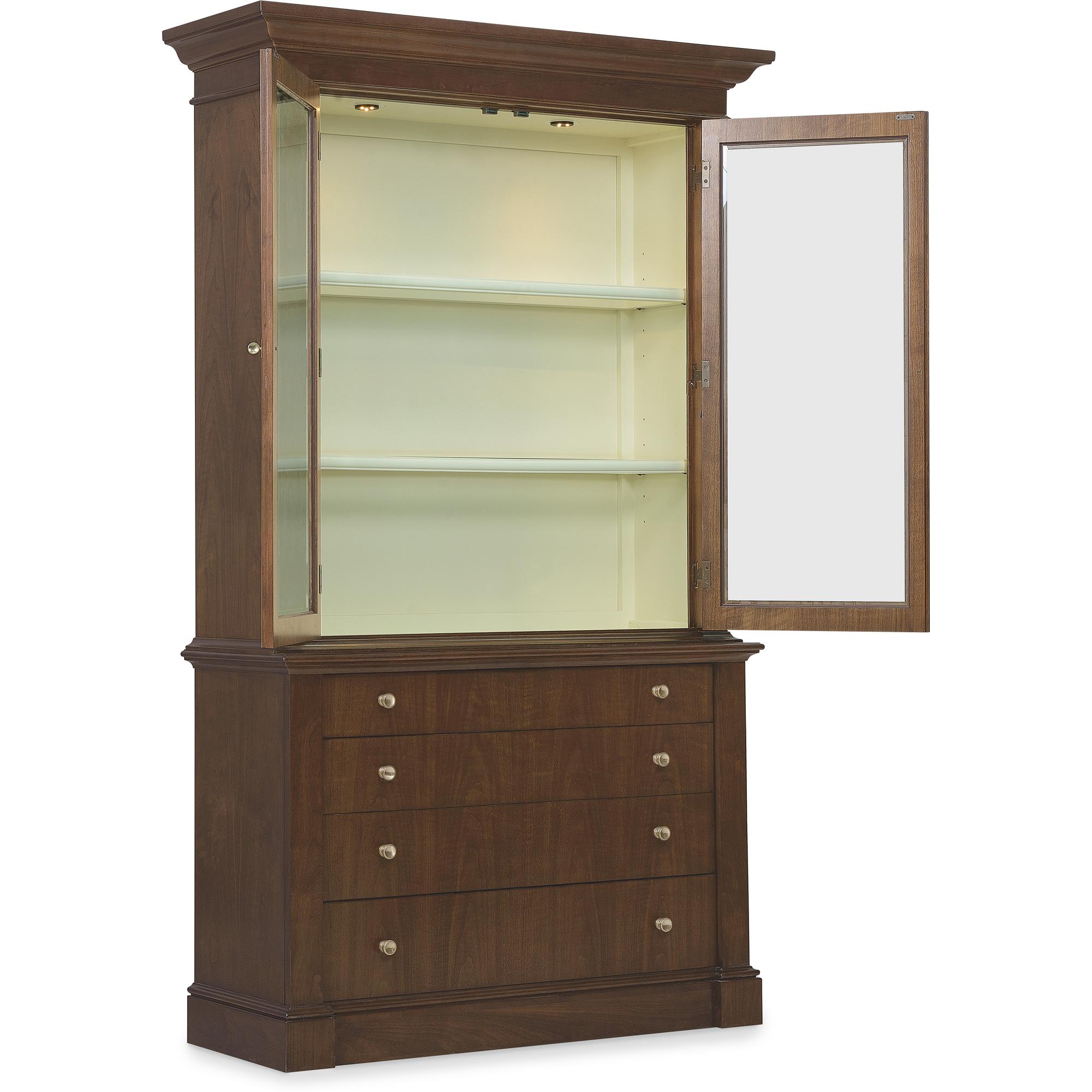 Features: Includes base and top Two wood-framed glass doors Touch-activated LED lights in top Two adjustable wood-framed glass shelves Painted cream contrasting interior Base has fully finished top and can be used alone Four drawers for added storage