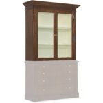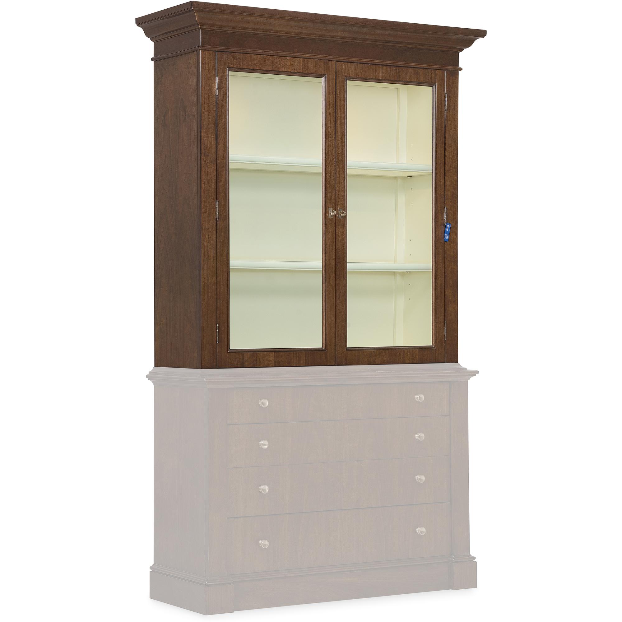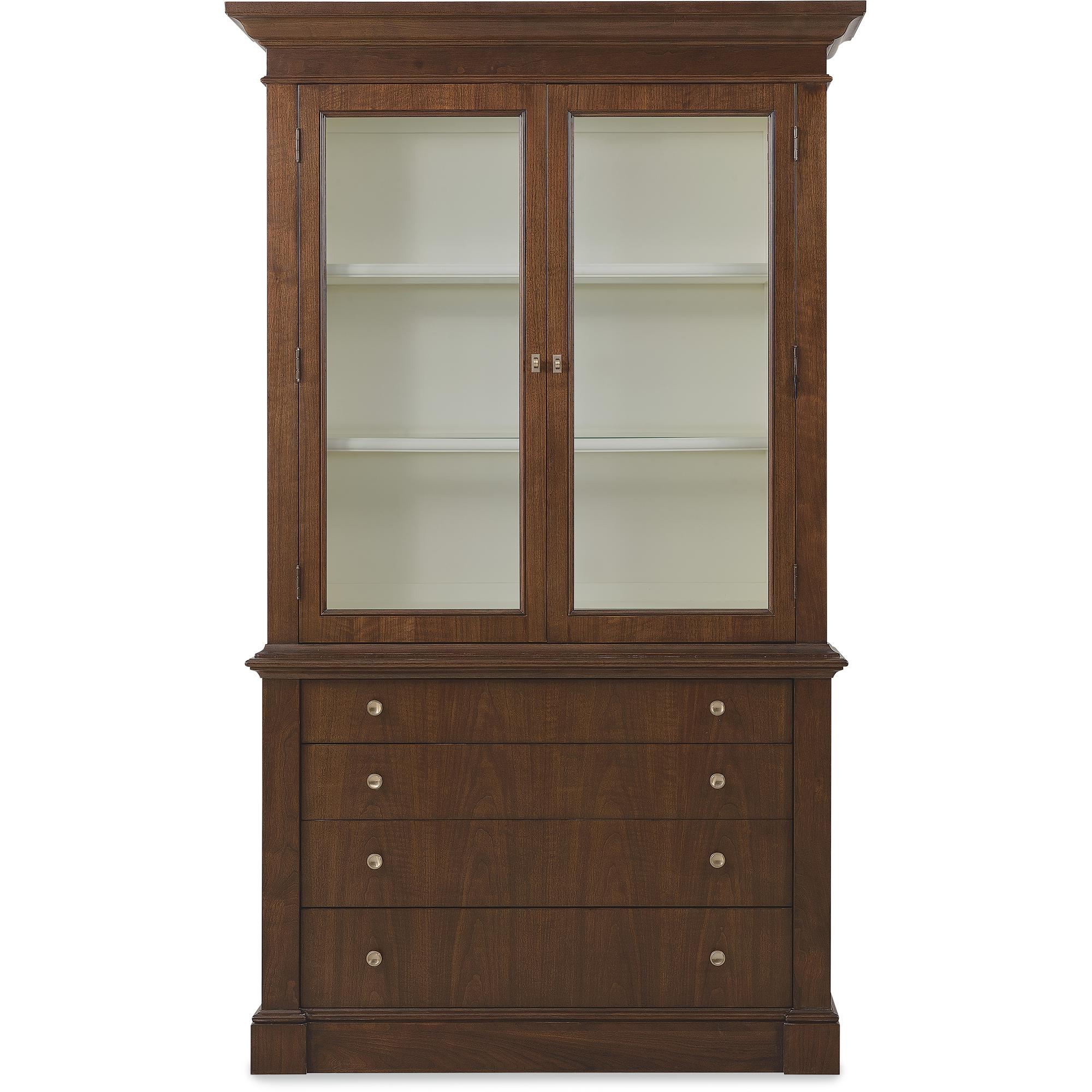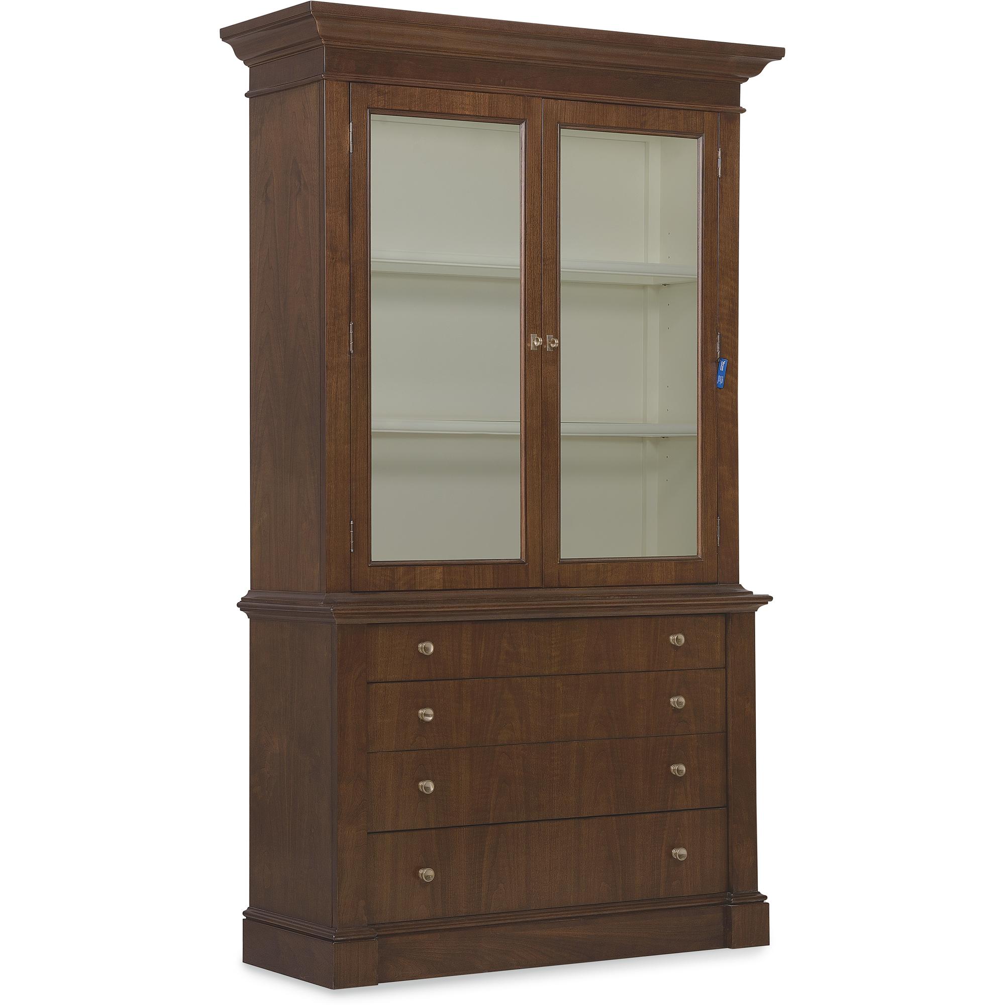 Features: Includes base and top Two wood-framed glass doors Touch-activated LED lights in top Two adjustable wood-framed glass shelves Painted cream contrasting interior Base has fully finished top and can be used alone Four drawers for added storage