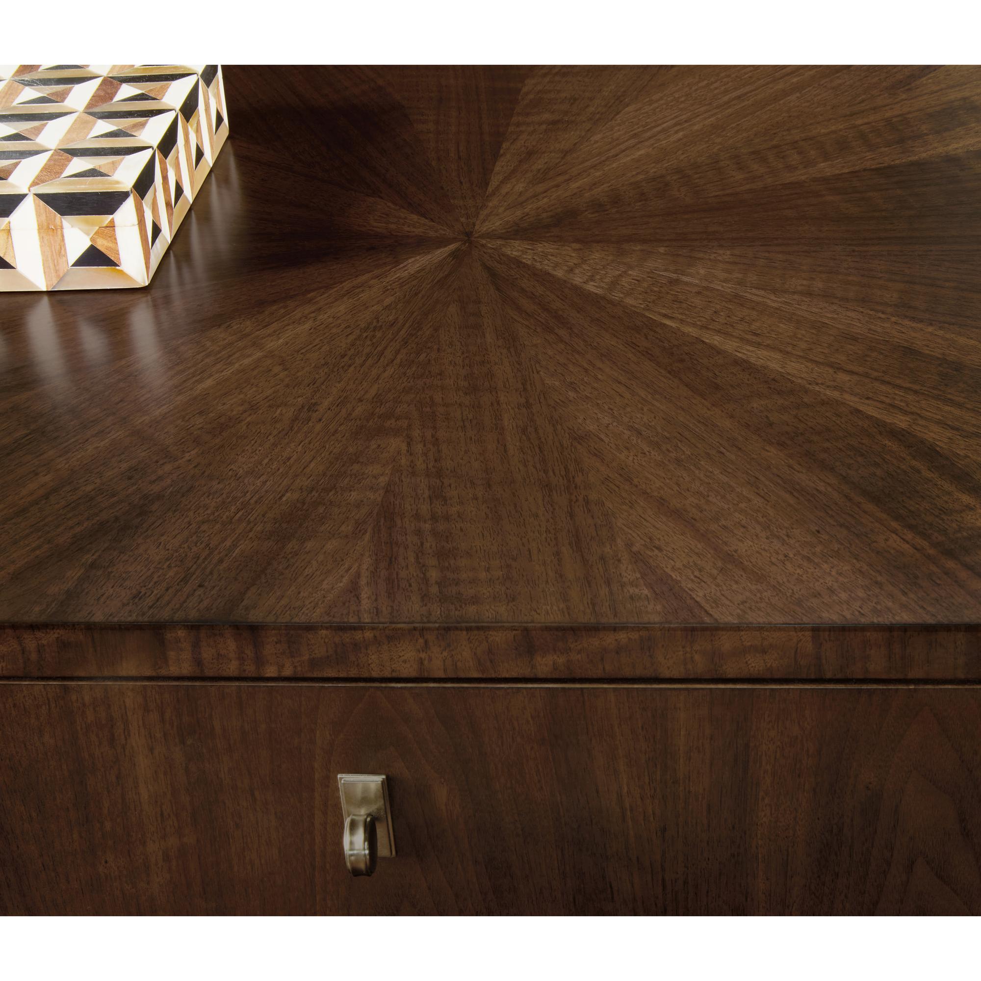 Finish: The high clarity Classic Walnut finish over figured quartered walnut veneers adds richness and depth. Custom knob hardware in Satin Brass finish.