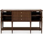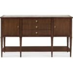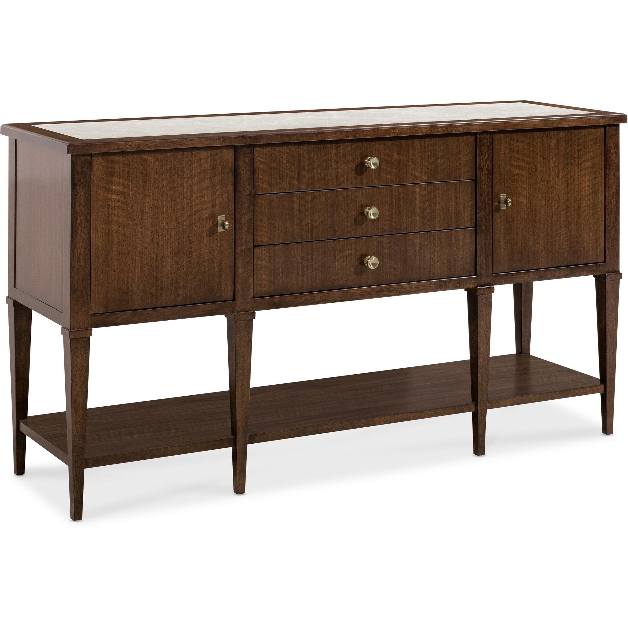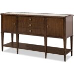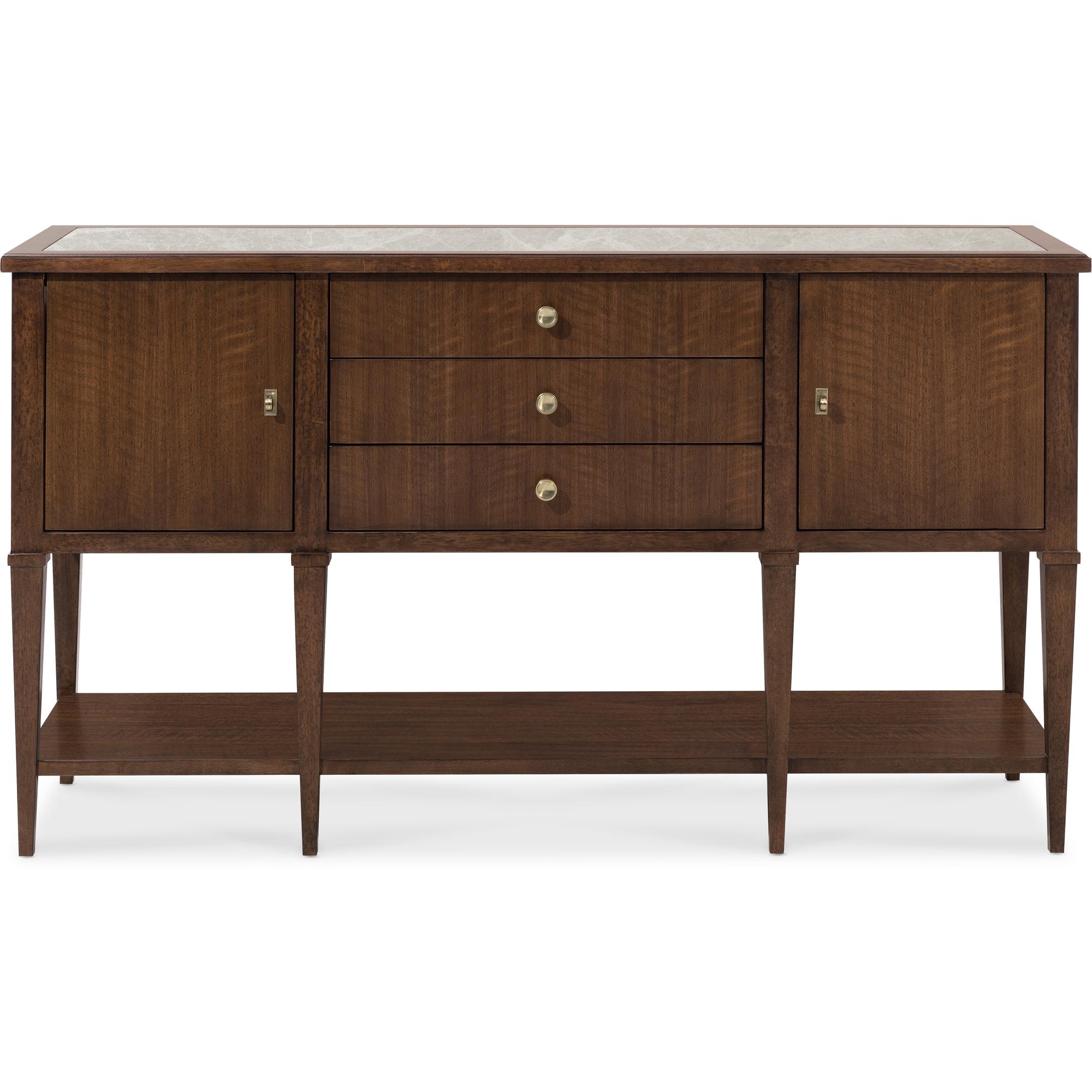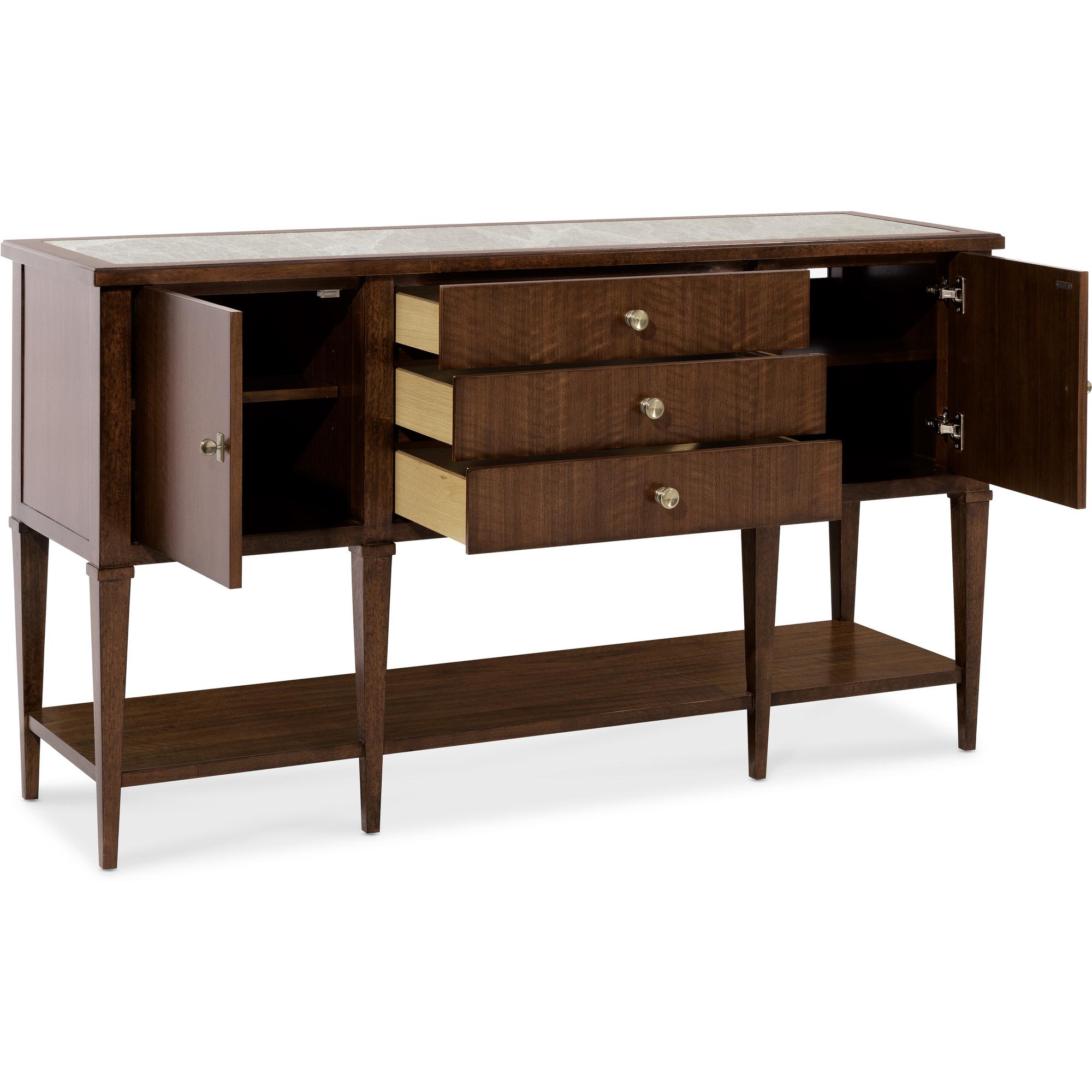 Features: Two doors with an adjustable shelf inside each Three center drawers Silverware tray One fixed shelf Castle Grey marble top Six tapered legs