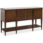 Finish: The high clarity Classic Walnut finish over figured quartered walnut veneers adds richness and depth. Custom knob and pull hardware in Satin Brass finish. Castle Grey marble top features gray, beige, cream and white colorations.