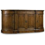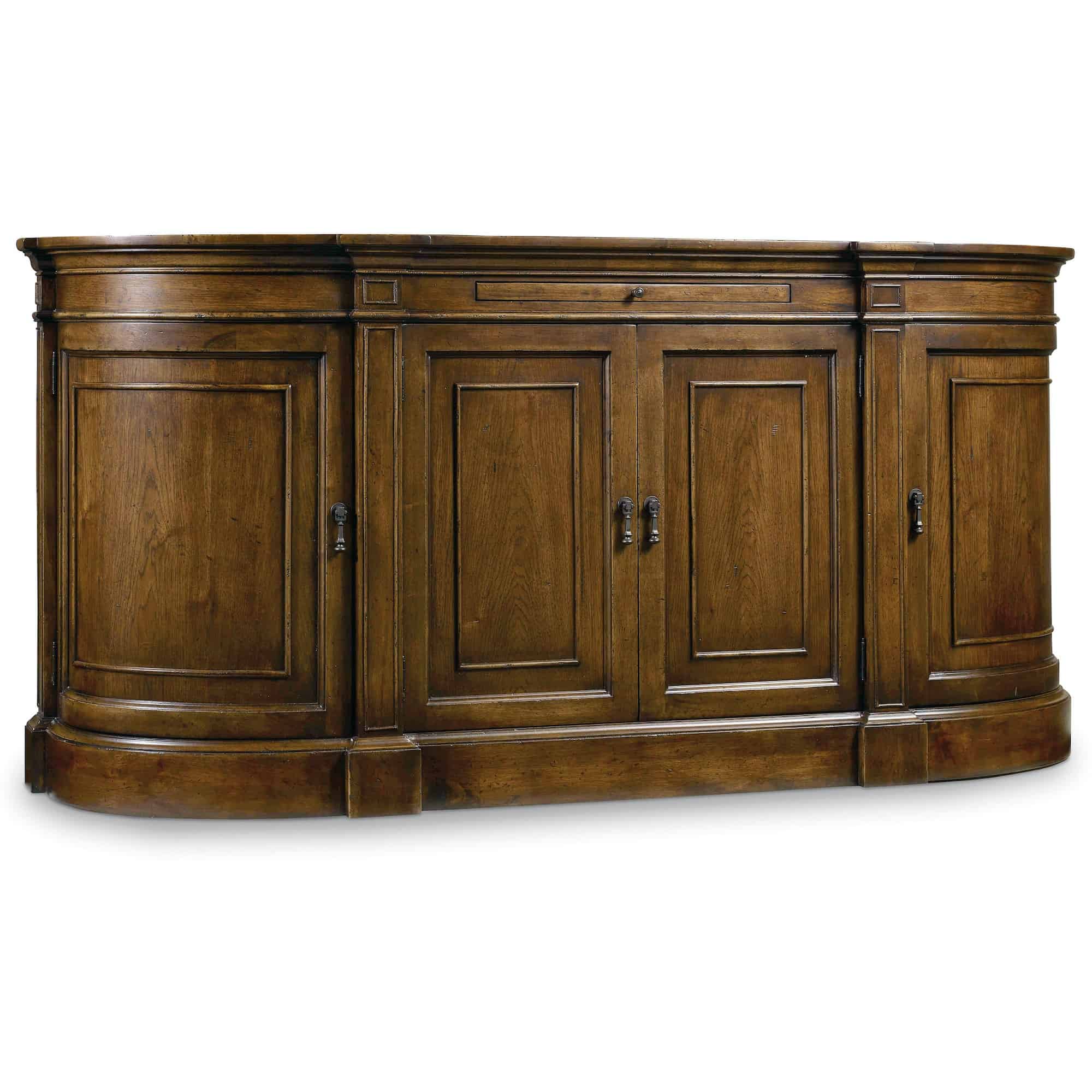 Finish: A soft casual finish over Pecky Pecan gives a rustic, character-filled and authentic look. The finish is complemented by antique-inspired hardware including kick plates, tear-drop-shaped pendants and ring pulls with back-plates in a time-worn bronze finish. Distressing includes rasping, chiseling, chain and cow-tailing.