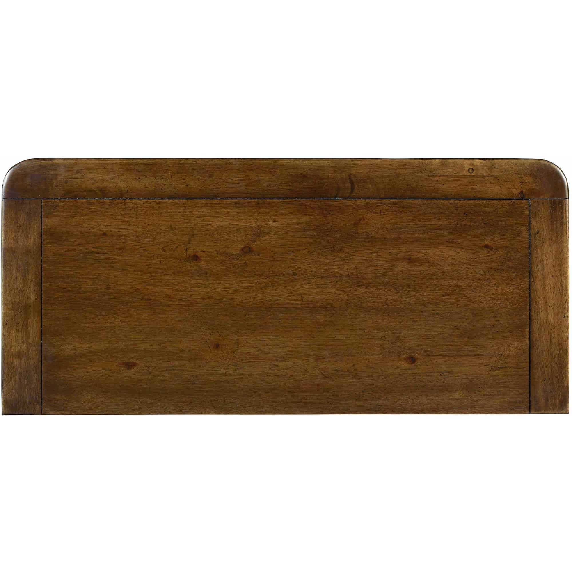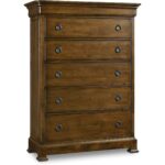 Finish: A soft casual finish over Pecky Pecan gives a rustic, character-filled and authentic look. The finish is complemented by antique-inspired hardware including kick plates, tear-drop-shaped pendants and ring pulls with back-plates in a time-worn bronze finish. Distressing includes rasping, chiseling, chain and cow-tailing.
