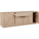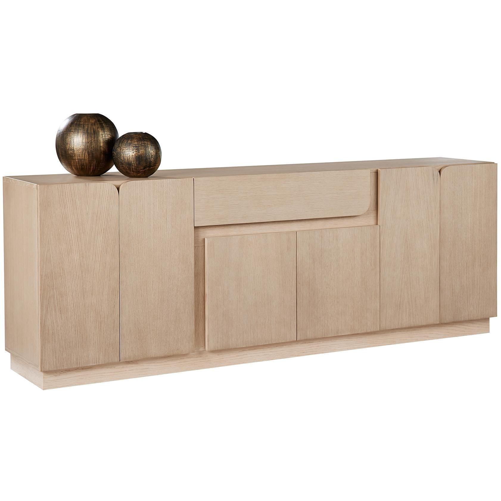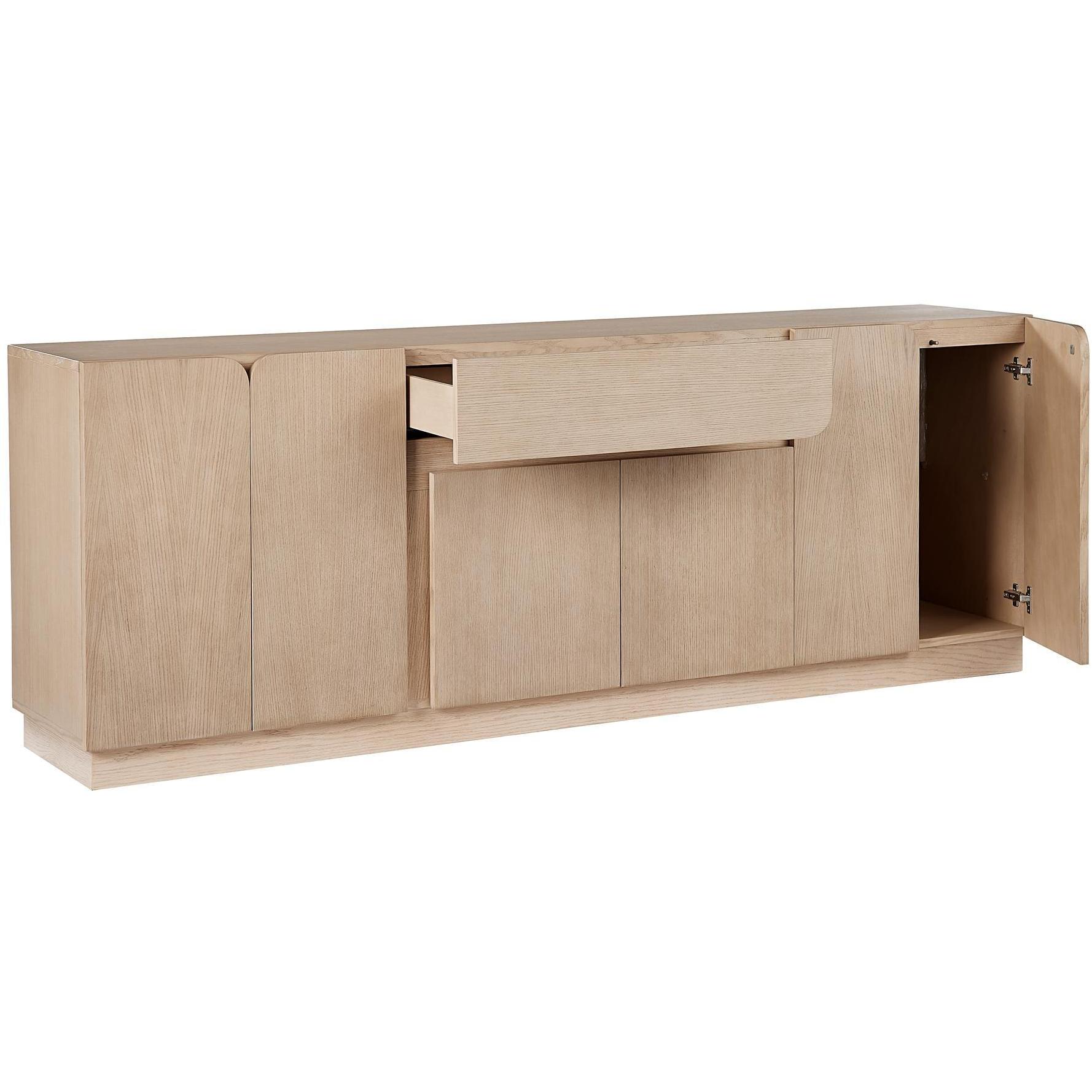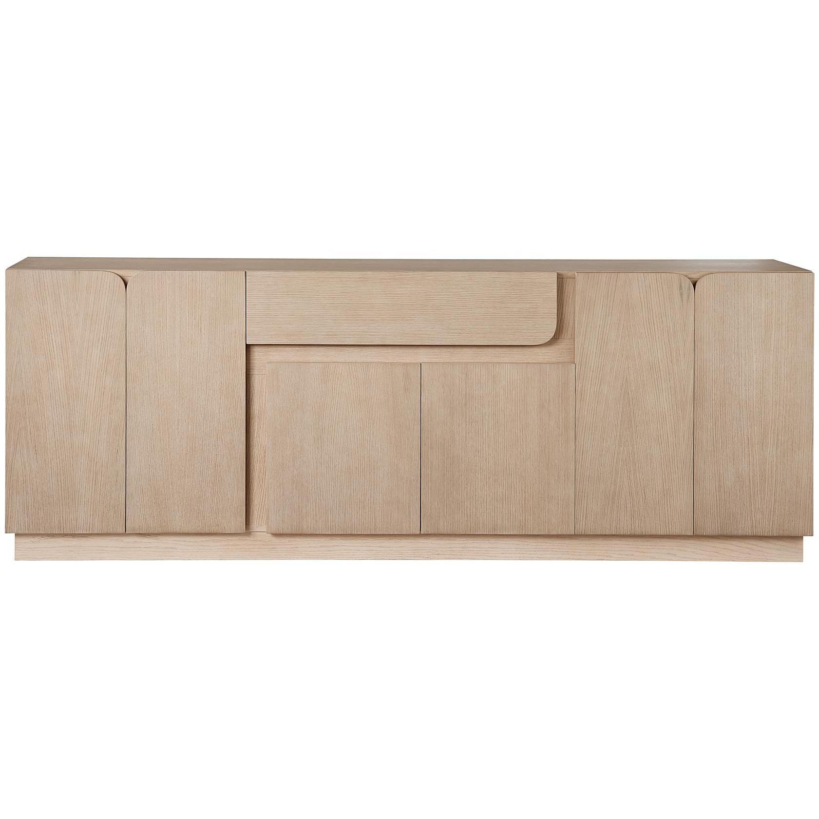 A refreshing take on Scandinavian design, this sideboard is a great addition to any dining or living space. Features a coveted light wash oak wood frame with visible graining and complementing straight and curved edge cabinet fronts. Pairs well with the Arezza dining table. As wood is an organic, porous material, these pieces will contain natural variation of texture and may also exhibit fine indentations and cracks. Wood pieces will also display a disparity of colour and grain, and visible knots and burls that add to the character of each piece.