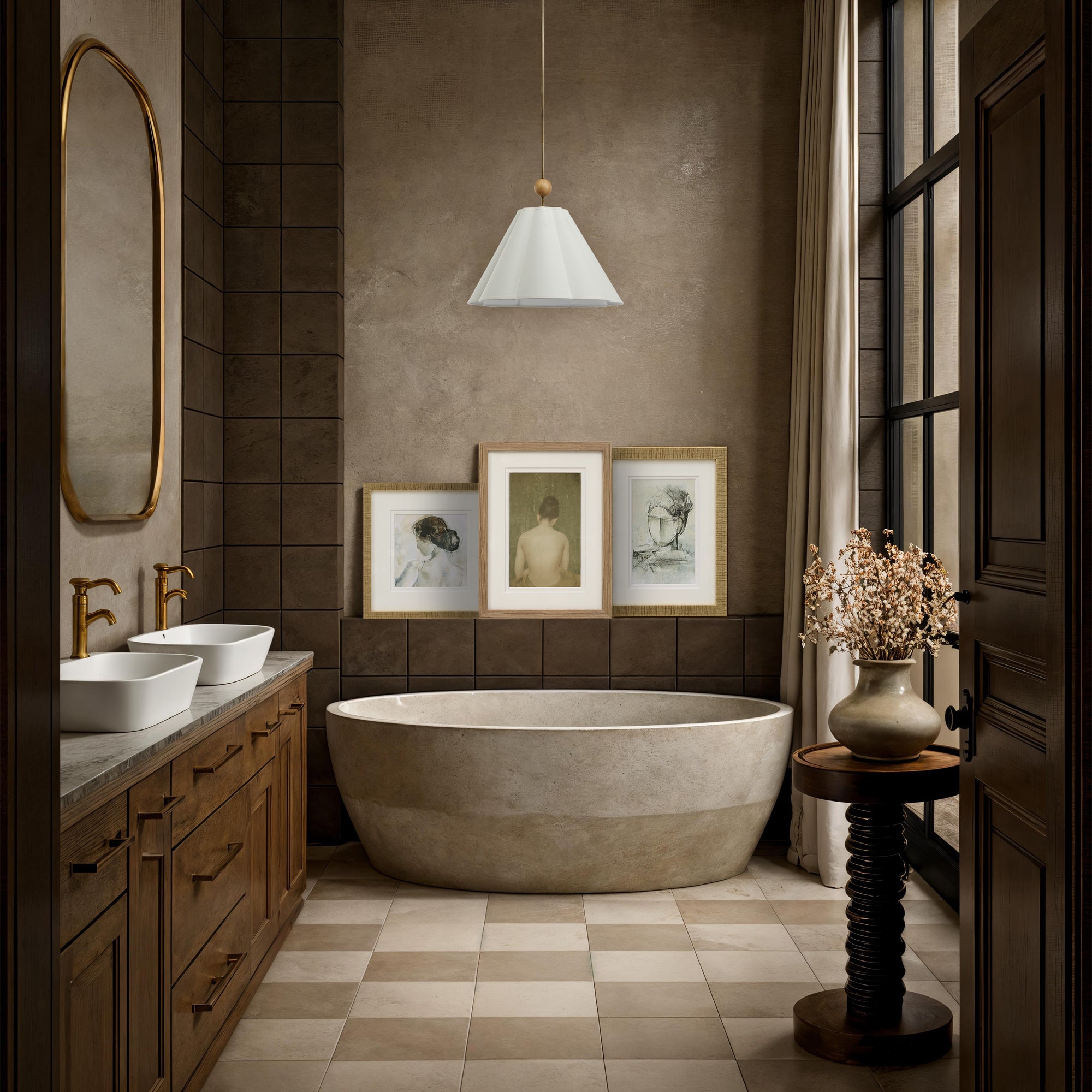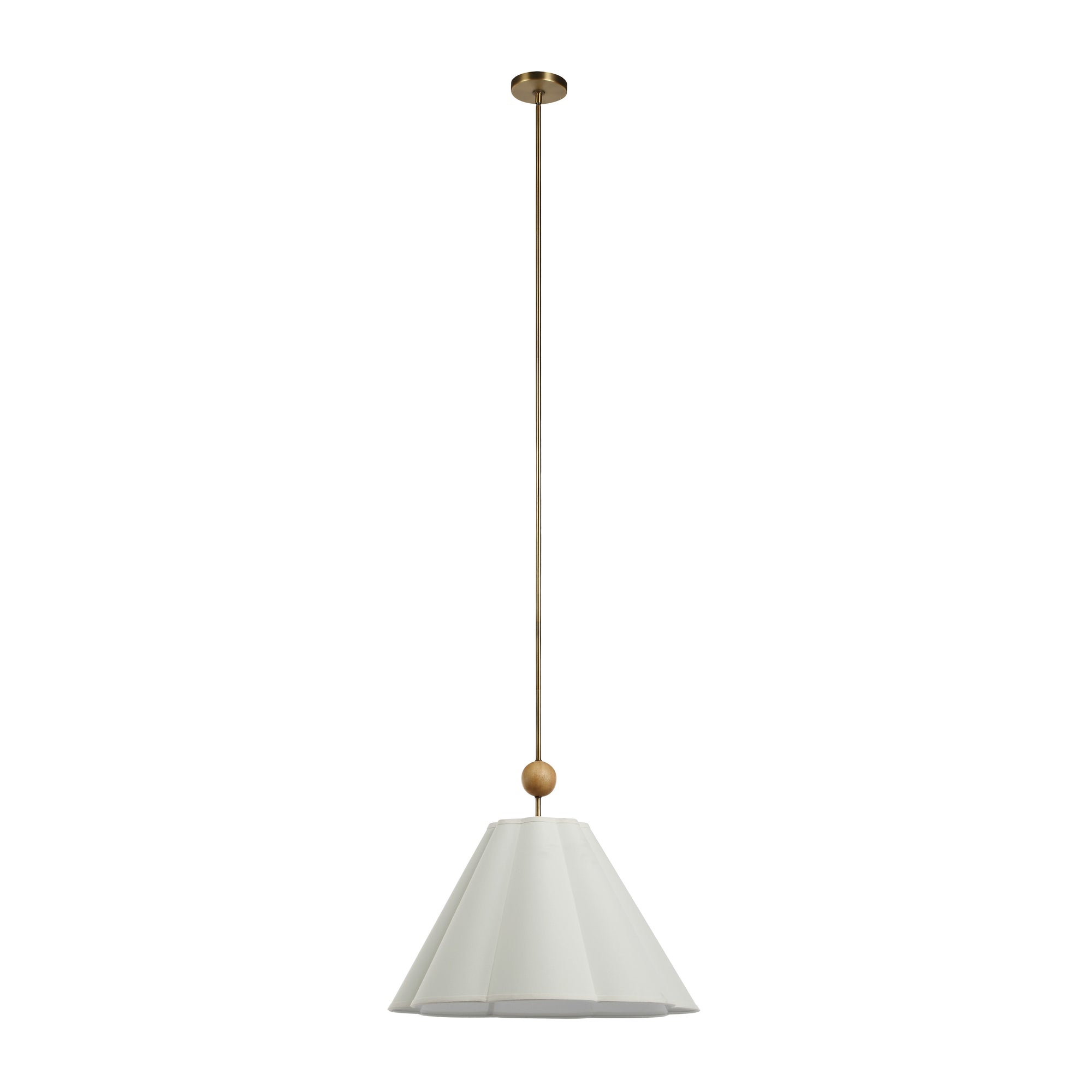 The Arielle ceiling pendant brings sculptural presence to a room, offering a refined take on lighting statements. Its flared matte off-white shade feels modern, intentional and a little bit dainty, while oak and dark antique brass accents add earthy sophistication. At 25 inches wide, it commands attention either as a standalone centerpiece or in multiples.