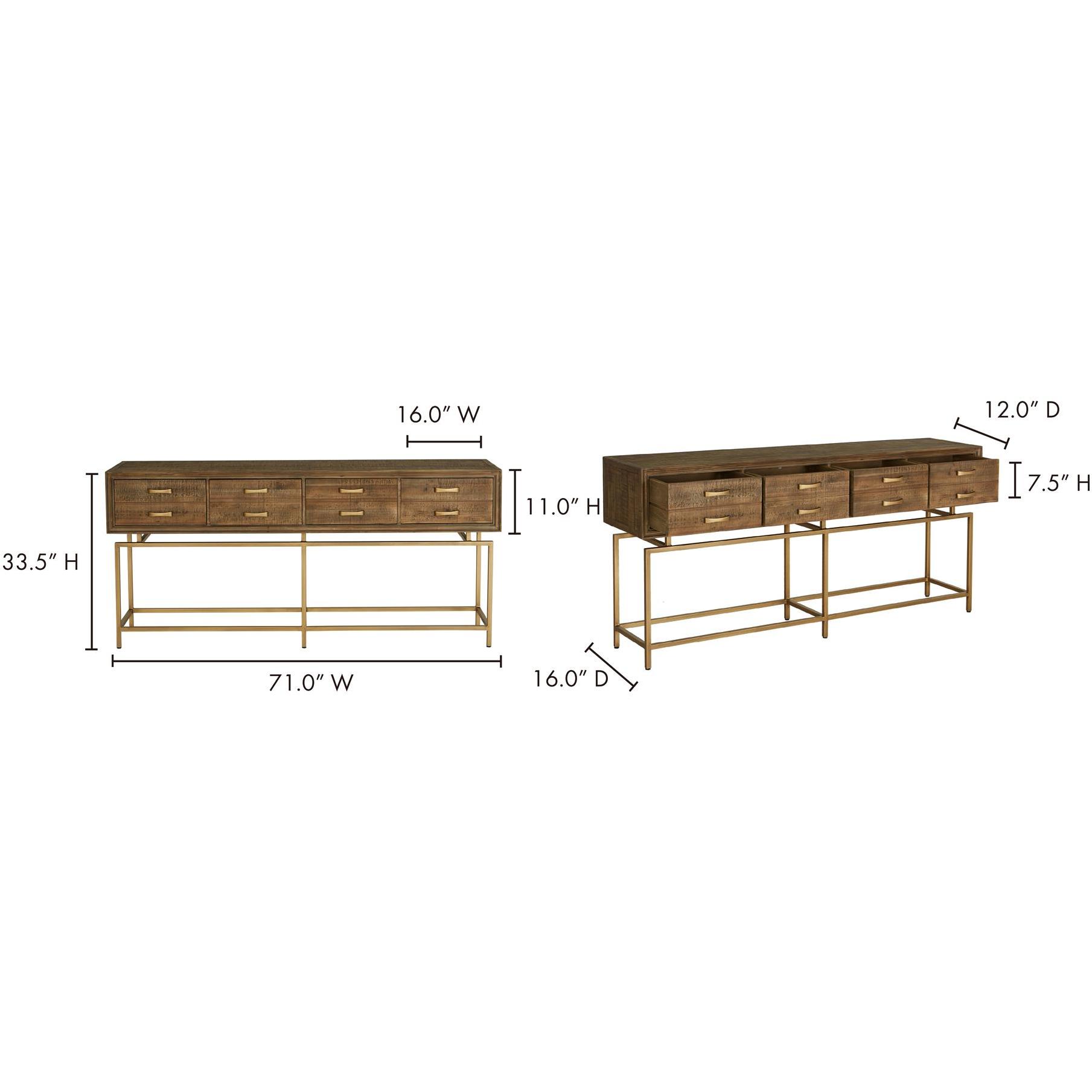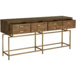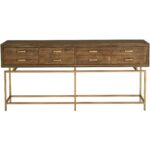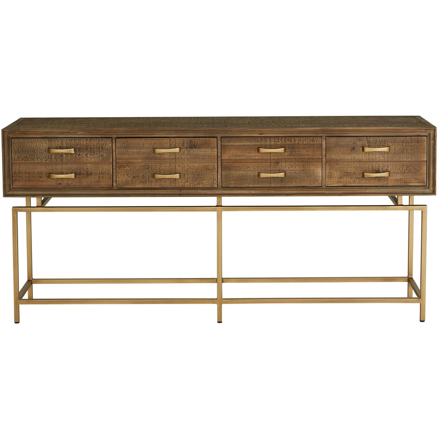 Best describe as a show stopper, the Annecy console table features an art-deco inspired aesthetic with a rustic twist. Made from reclaimed fir wood, it will withstand major wear and tear. Four deep drawers that seem to float above the brass finished frame makes it practical to keep essentials handy and airy at your entry way.