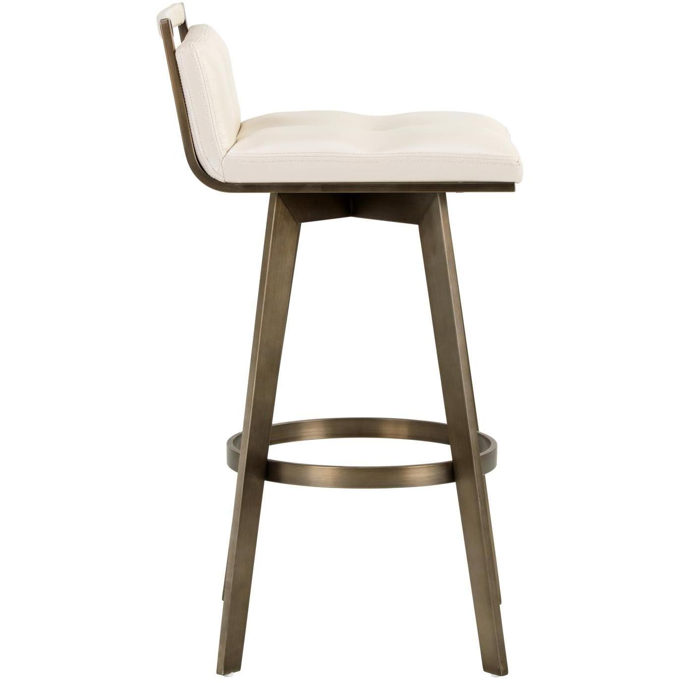 A stylish Art Deco inspired swivel barstool with a low profile seatback. Features a partially exposed frame and legs made of stainless steel with an antique brass finish. Swivel features 360 degree swivel with 180 degree return. Suitable for residential and commercial environments. Suitable for various dining, kitchen and bar spaces of all sizes. Handle With Care: This design has been crafted with faux leather. Faux leather is manufactured to reflect the natural characteristics of leather; as such, colour variations, markings wrinkles, grooves, and light scratches are appreciated characteristics. No two pieces will be alike.