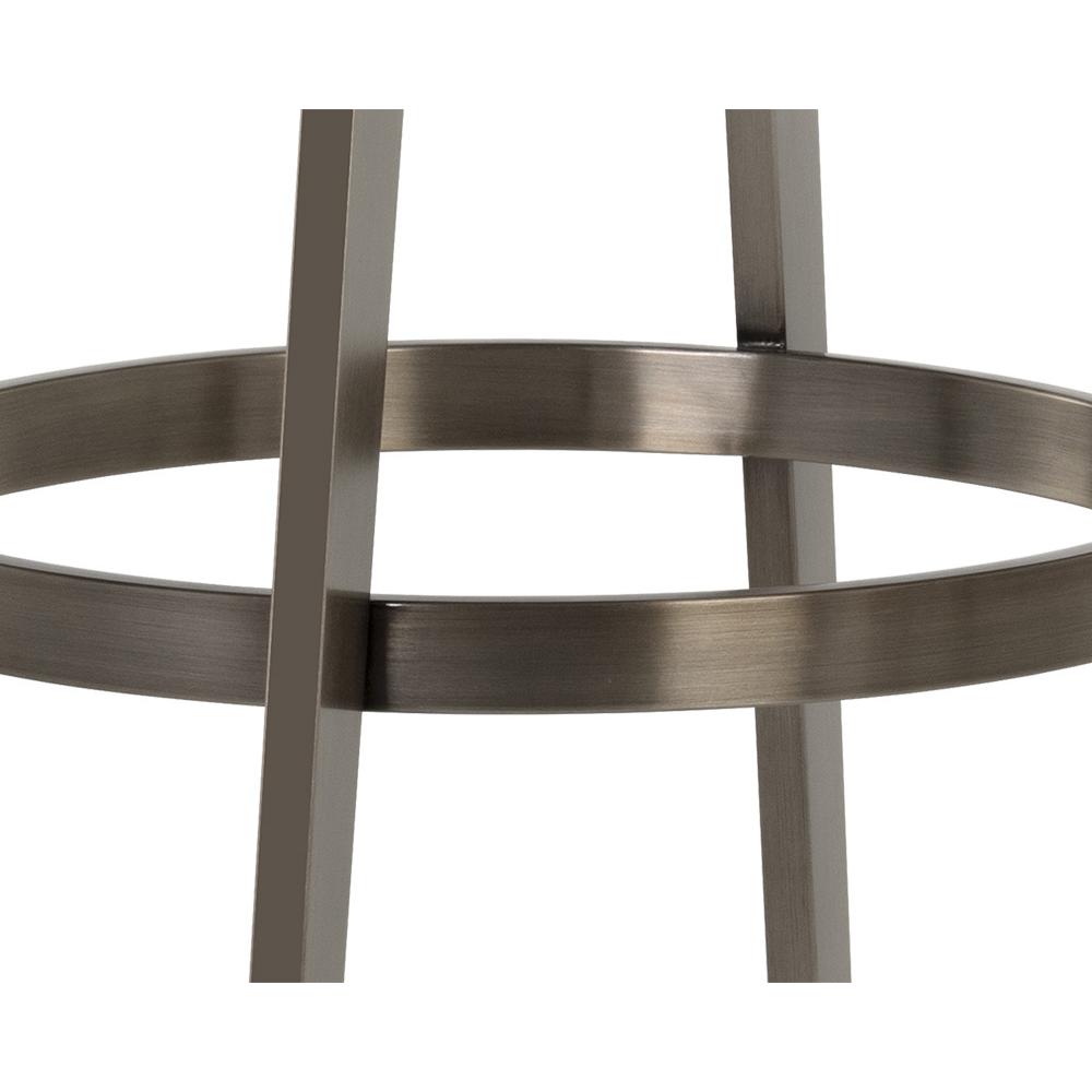 A stylish Art Deco inspired swivel counter stool with a low profile seatback. Features a partially exposed frame and legs made of stainless steel with an antique brass finish. Swivel features 360 degree swivel with 180 degree return. Suitable for residential and commercial environments. Handle With Care: This design has been crafted with faux leather. Faux leather is manufactured to reflect the natural characteristics of leather; as such, colour variations, markings wrinkles, grooves, and light scratches are appreciated characteristics. No two pieces will be alike.