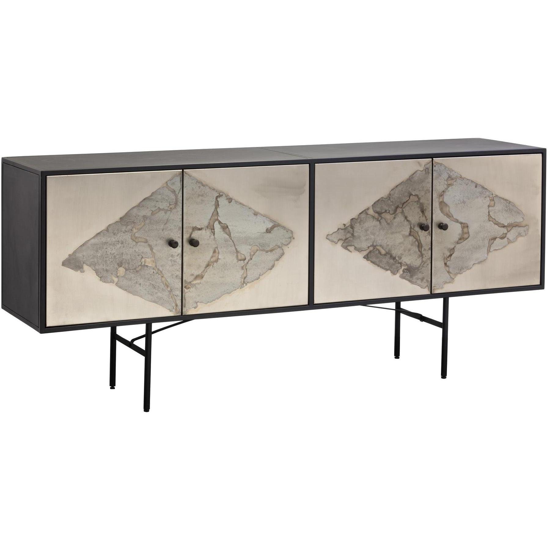Make a bold statement with this unique sideboard. Cabinets feature a one-of-a-kind patina finish, boldly contrasted with a black iron frame. Available in small and large sizes. Made in India. With refined craftsmanship, this design was brought to life by skilled local artisans. By nature, these materials develop unique imperfections such as markings and colour variations for a truly one-of-a-kind piece. Pictures shown reflect the lightest and darkest variations of our Arlington patina finish. Actual product may range between these finishes.