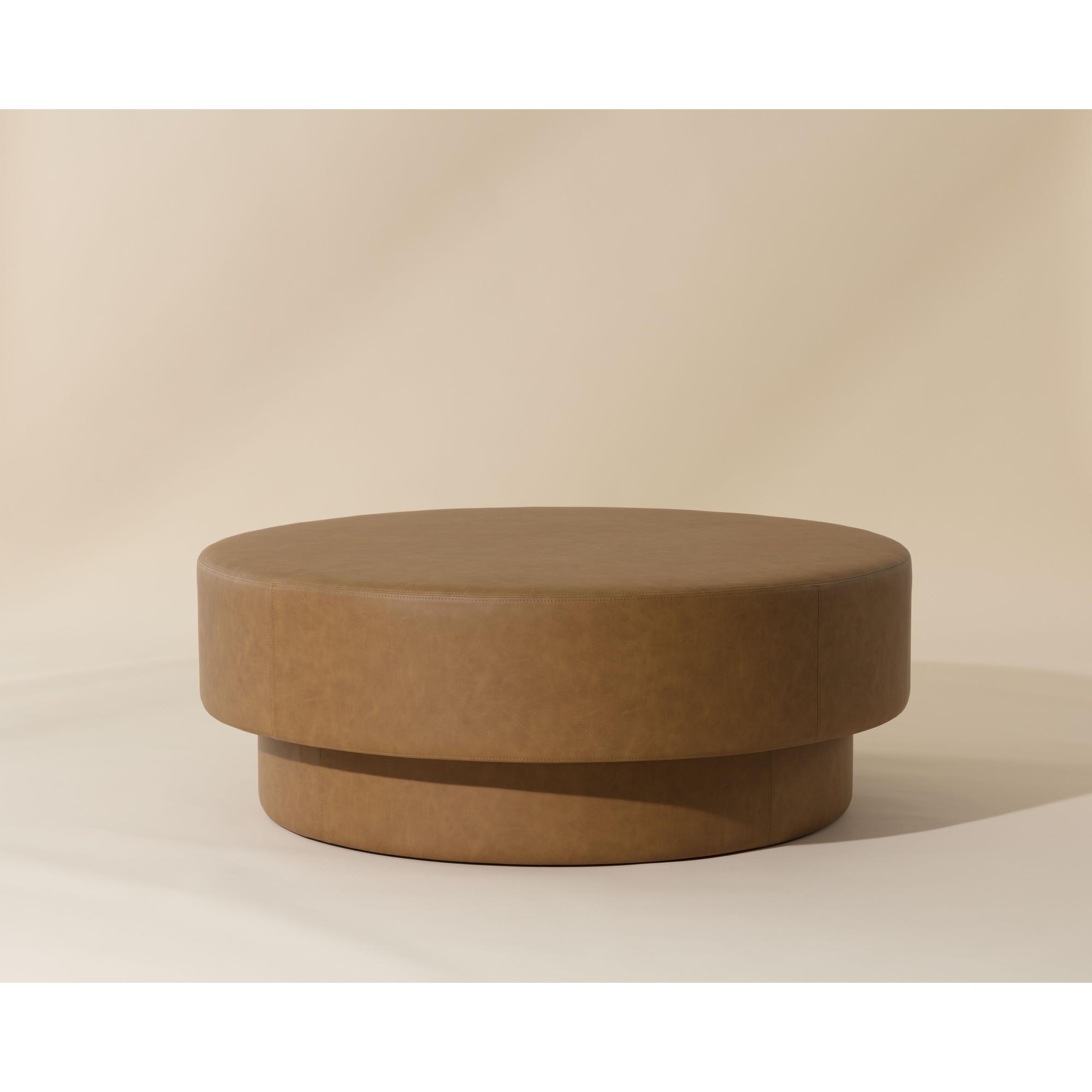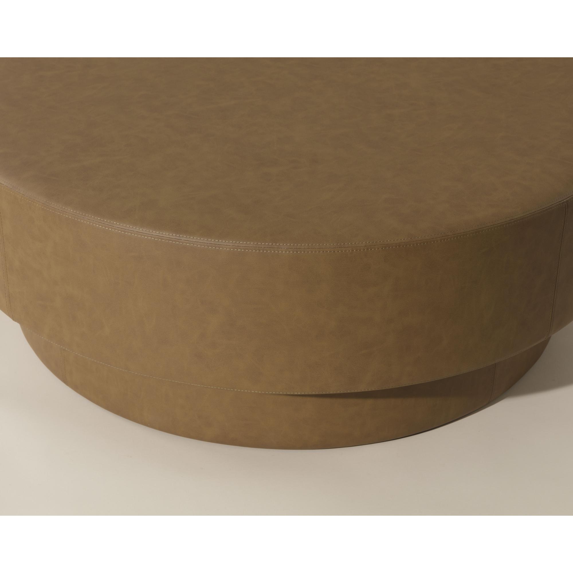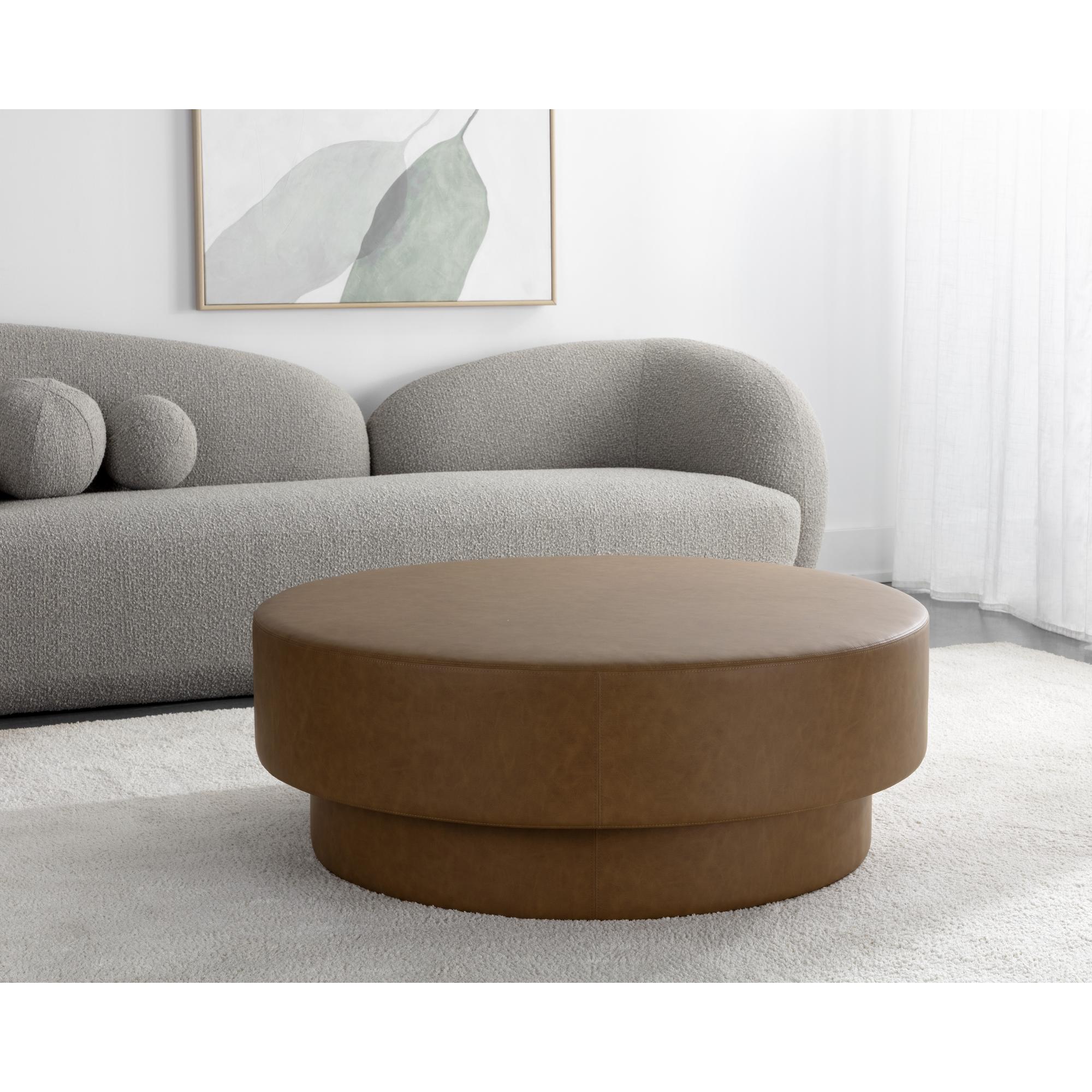 Clean contours and smooth faux leather upholstery lend a sophisticated air to the Arlo Ottoman. Its multifunctional design, characterized by its grand round shape, allows for endless possibilities.