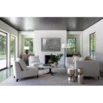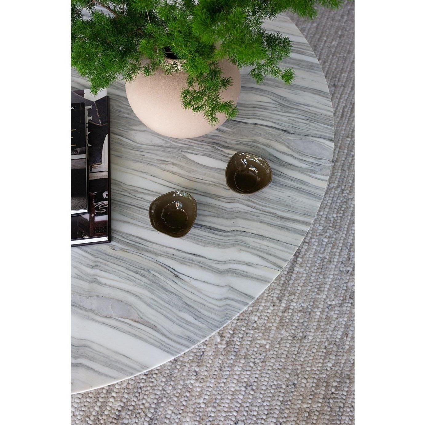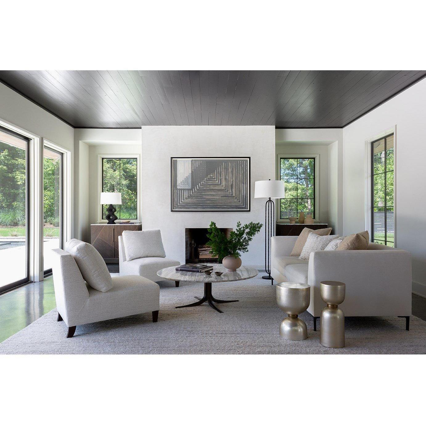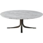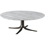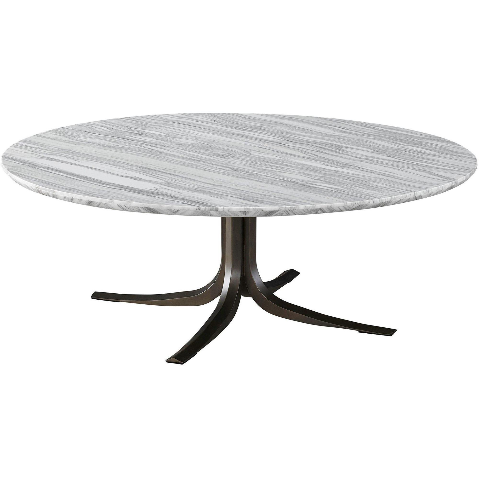Cast aluminum legs are the sturdy base for this cocktail table’s beautifully polished Calacatta marble top.