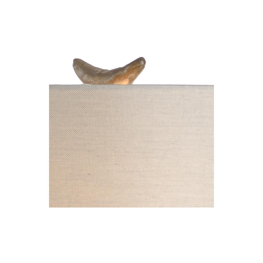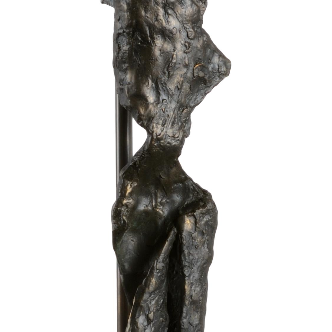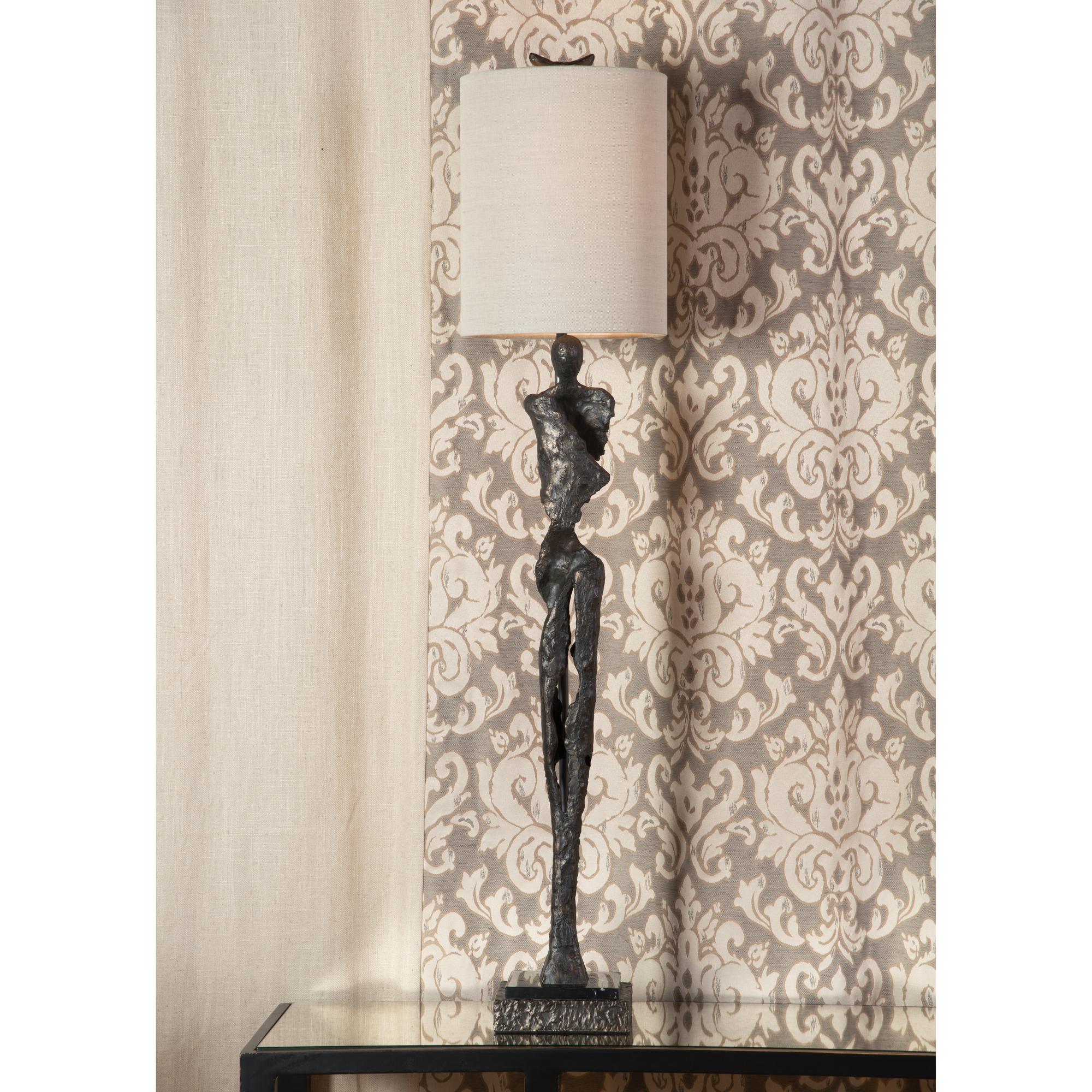 Bring a piece of museum quality art to your home. This aged dark bronze elongated sculpture with simple modern lines is crafted of cast composite and stands on a natural black marble base. The neutral light taupe linen drum shade directs light down to reflect off of the textured sculpture creating a light feature worthy of a console or buffet in any modern design scheme.