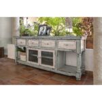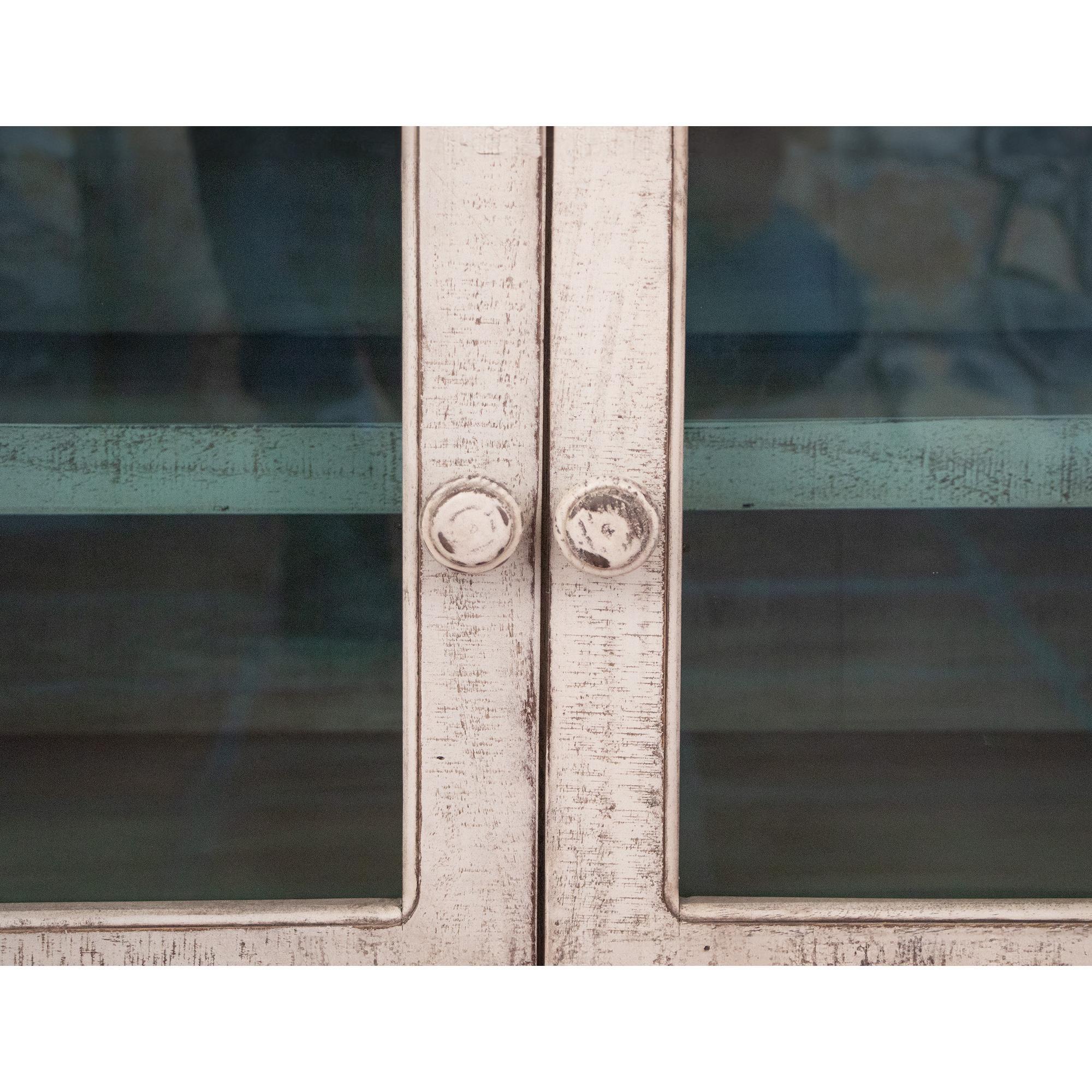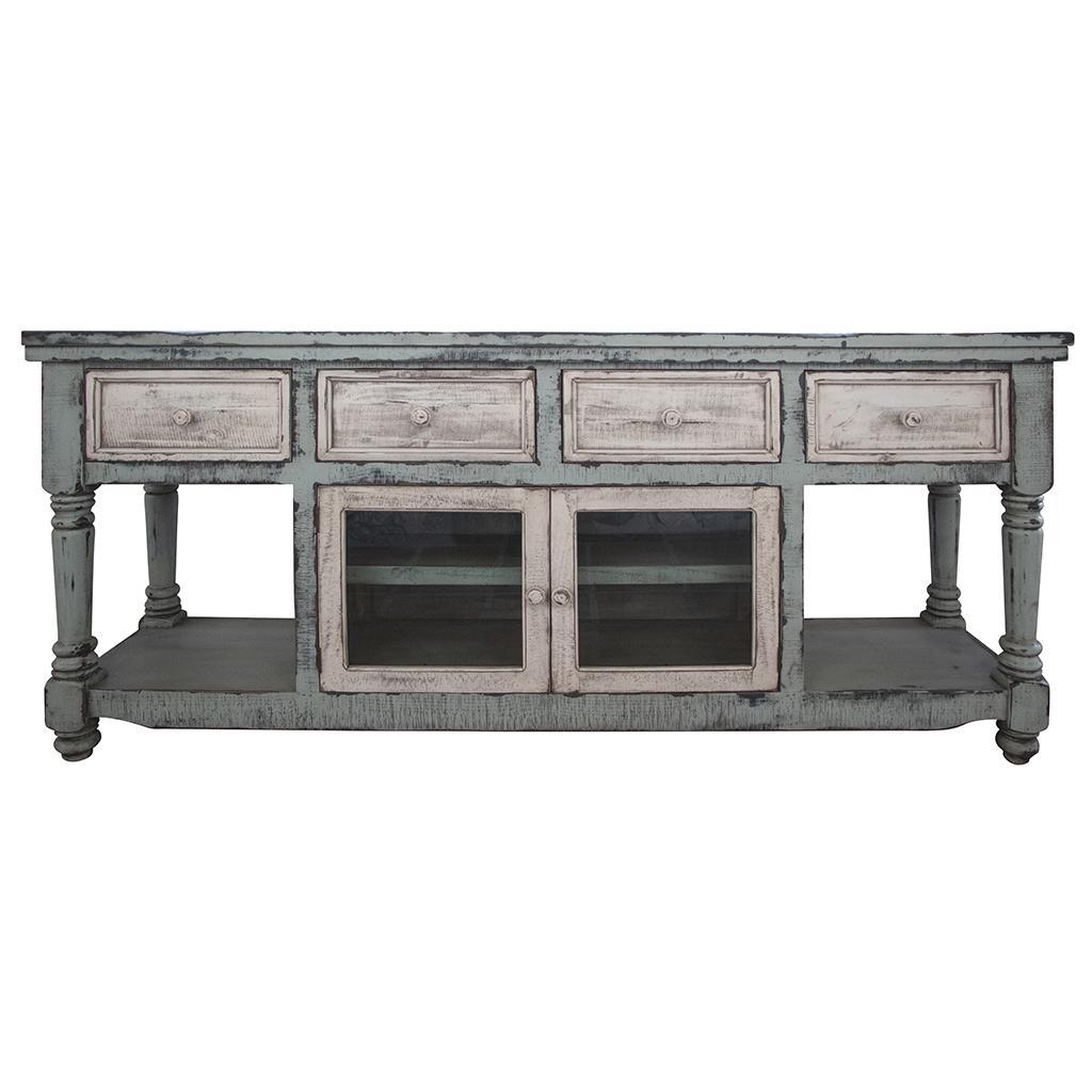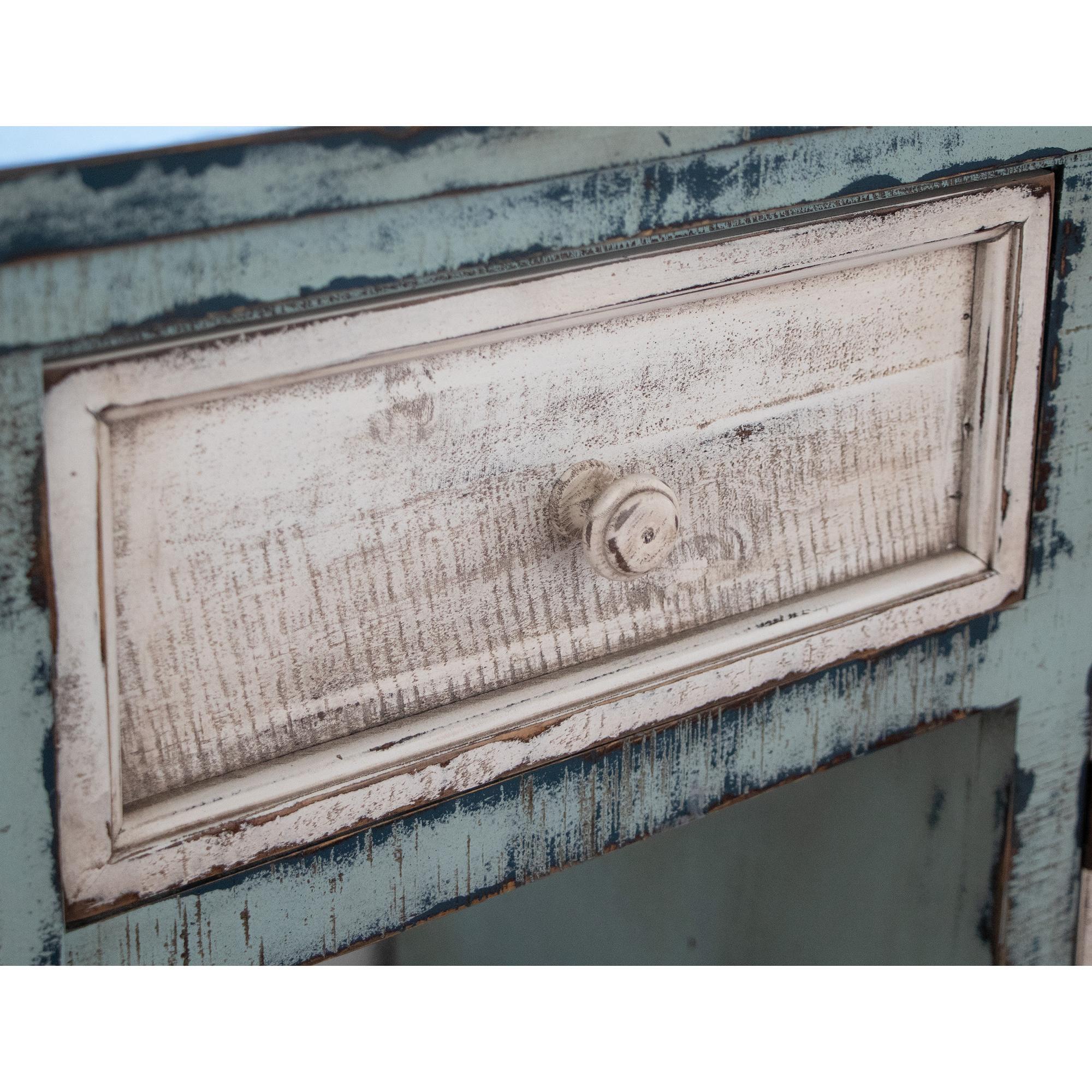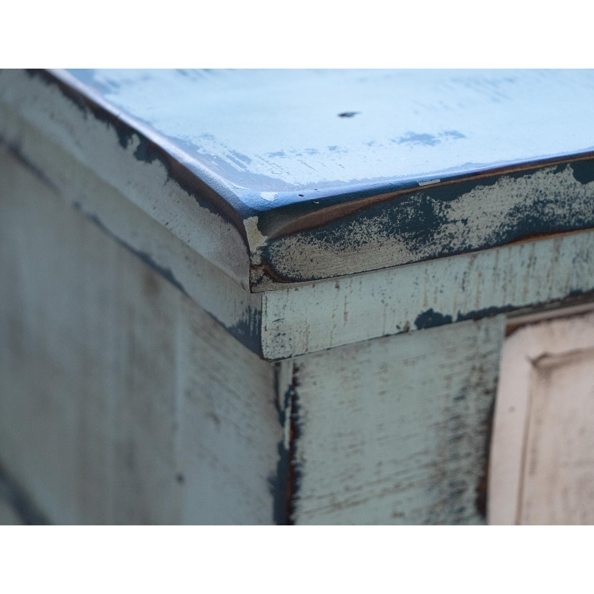 - A sky blue antiqued finish is applied using a hand-rubbed technique in a multi-step process. Doors and drawers feature a white tone.