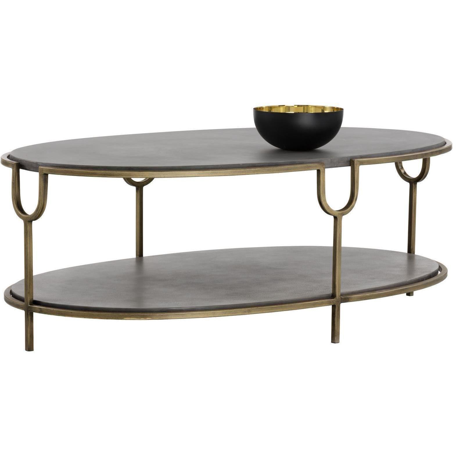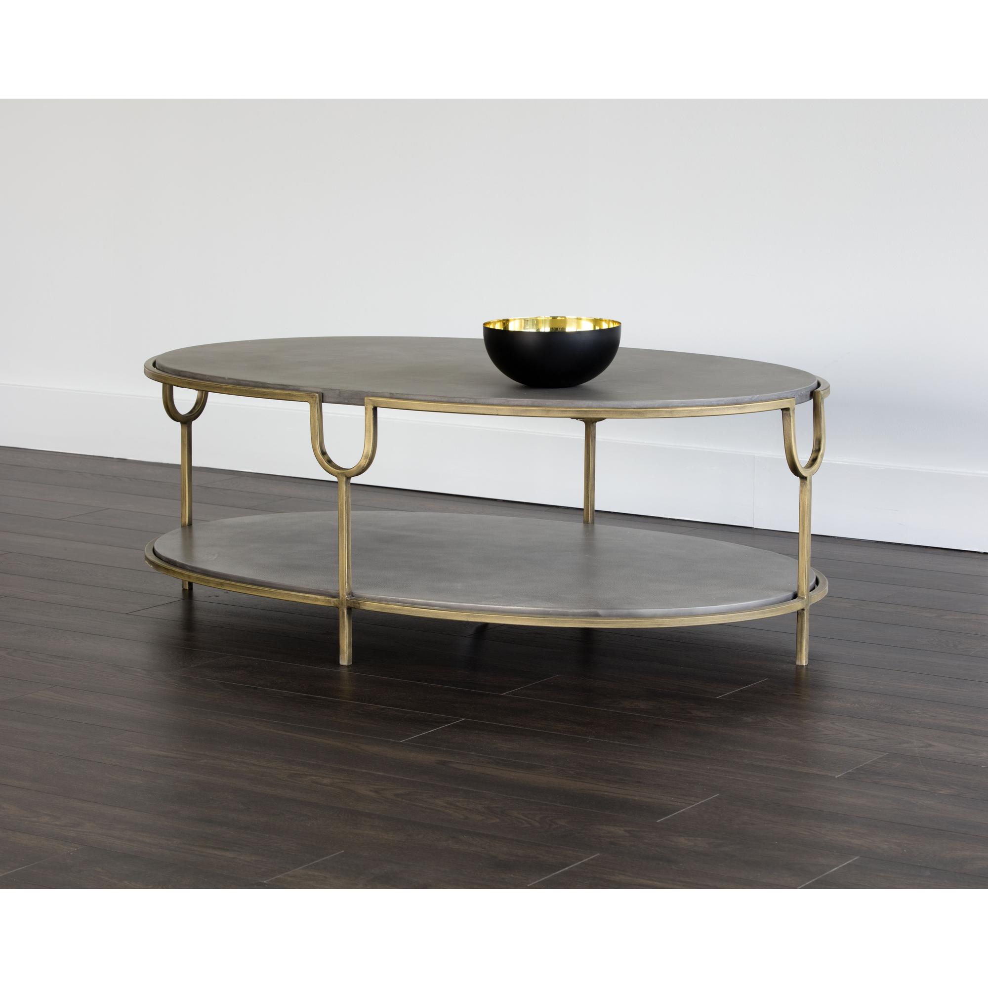 This oval shaped coffee table features a beautifully structured antique brass iron frame with a concrete top and shelf. A dramatic yet refined contemporary piece. Crafted from a natural concrete mix, each piece will look different. Variations in colour, texture, imperfections, surface scratches and non-structural hairline cracks are considered inherent and valued qualities of the material.