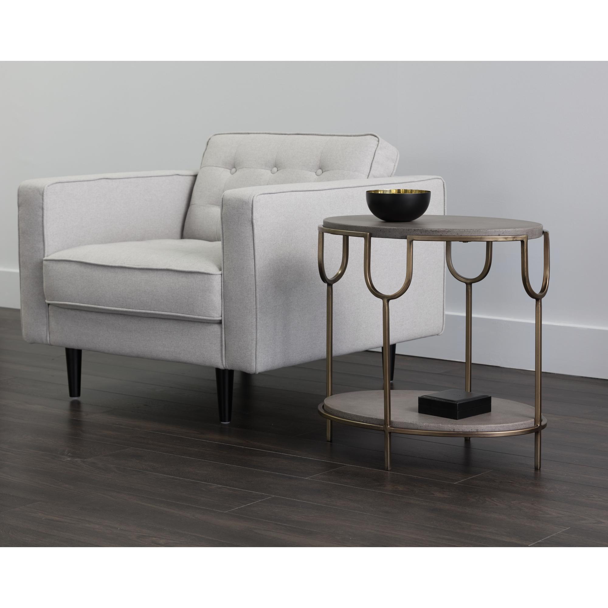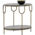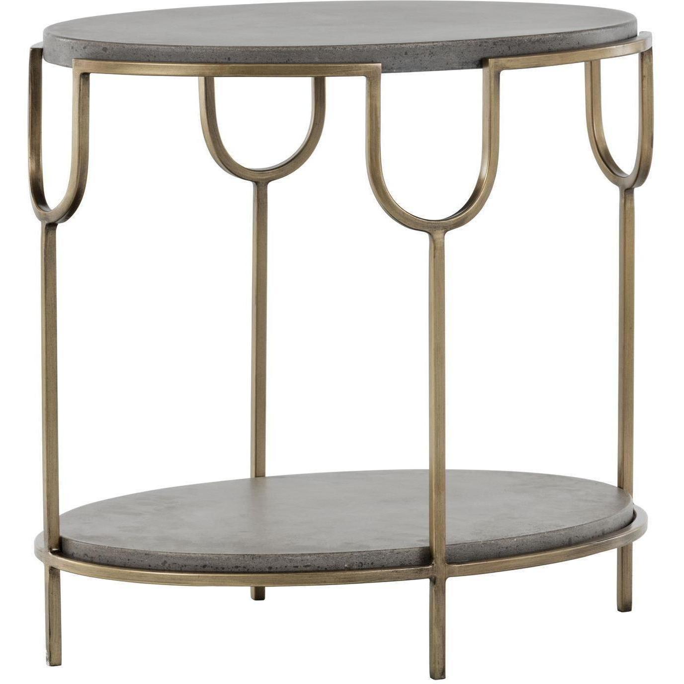 This oval shaped end table features a beautifully structured antique brass iron frame with a concrete top and shelf. A dramatic yet refined contemporary piece. Crafted from a natural concrete mix, each piece will look different. Variations in colour, texture, imperfections, surface scratches and non-structural hairline cracks are considered inherent and valued qualities of the material.