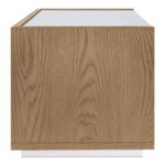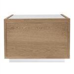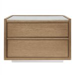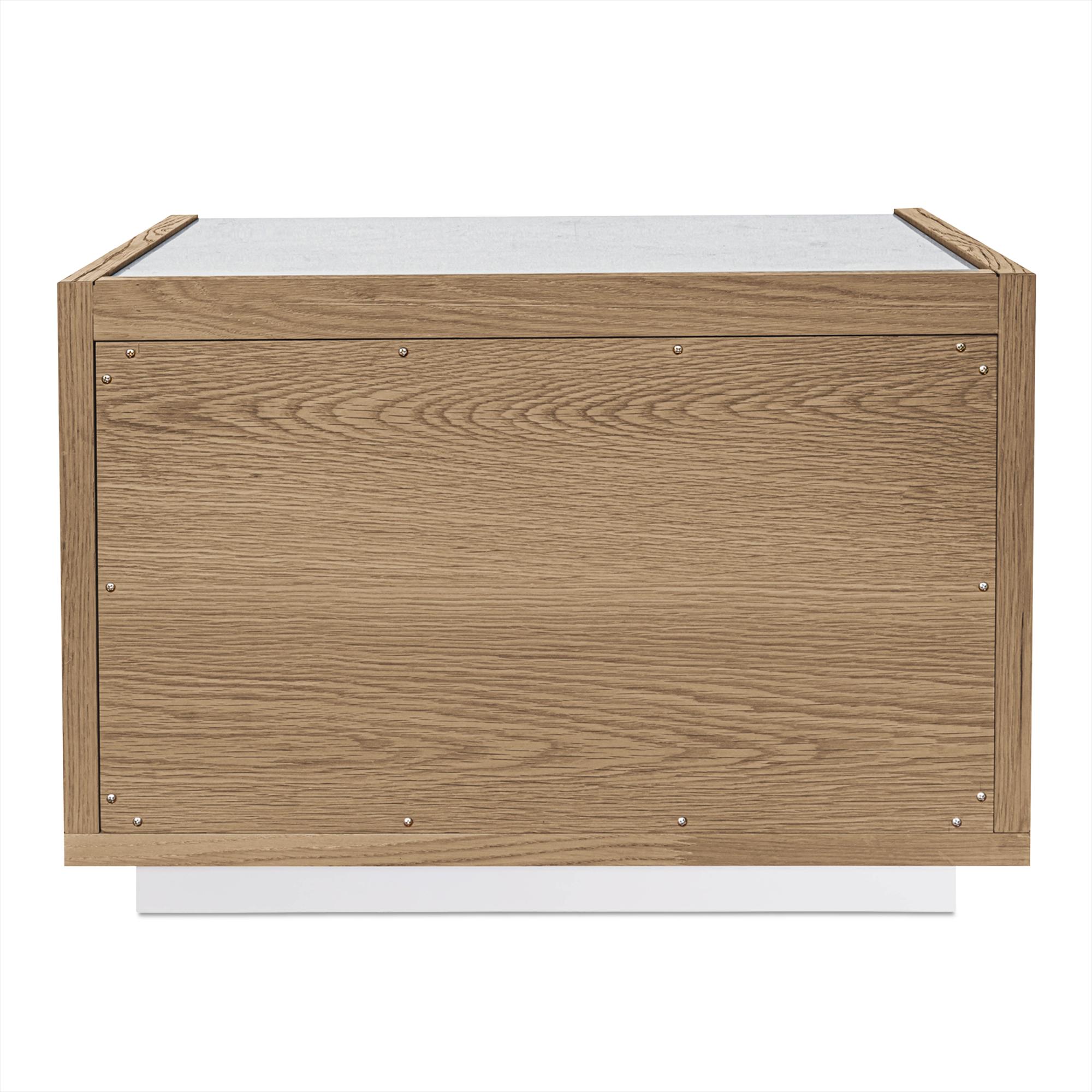 The perfect bedroom companion. A light rosa marble tabletop lies firmly over solid oak frame and oak veneer drawers. Its two soft-close compartments provide ample space for bedside needs.