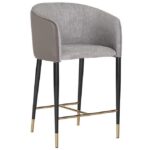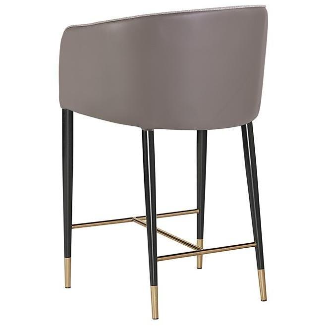 A modern barrel back counter stool upholstered in our flint grey fabric and contrasting napa taupe faux leather. Finished with black steel legs and brushed gold foot caps. Suitable for various dining, kitchen and bar spaces of all sizes. Handle With Care: This design has been crafted with faux leather. Faux leather is manufactured to reflect the natural characteristics of leather; as such, colour variations, markings wrinkles, grooves, and light scratches are appreciated characteristics. No two pieces will be alike. Visit our Product Care page for more information on how to ensure the lasting beauty of this piece.
