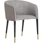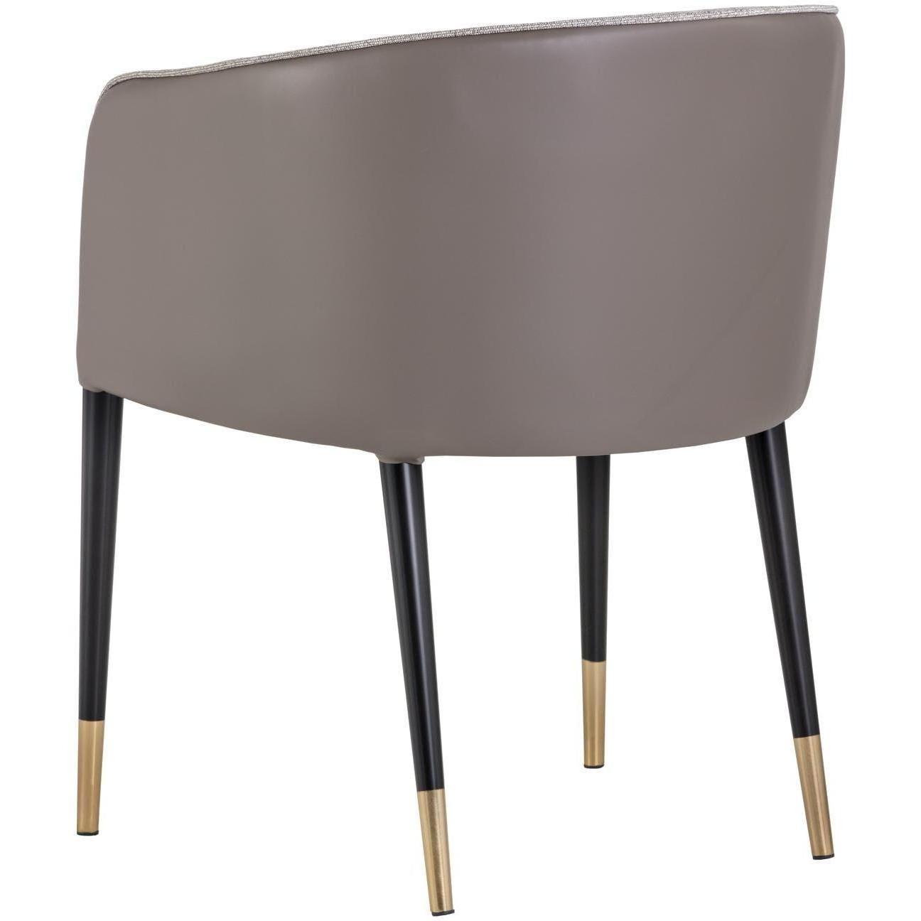 A modern barrel back dining armchair upholstered in our flint grey fabric and contrasting napa taupe faux leather. Finished with black steel legs and brushed gold foot caps. Handle With Care: This design has been crafted with faux leather. Faux leather is manufactured to reflect the natural characteristics of leather; as such, colour variations, markings wrinkles, grooves, and light scratches are appreciated characteristics. No two pieces will be alike. Visit our Product Care page for more information on how to ensure the lasting beauty of this piece.