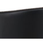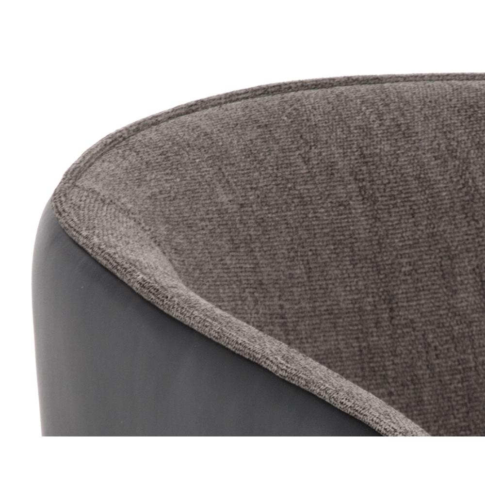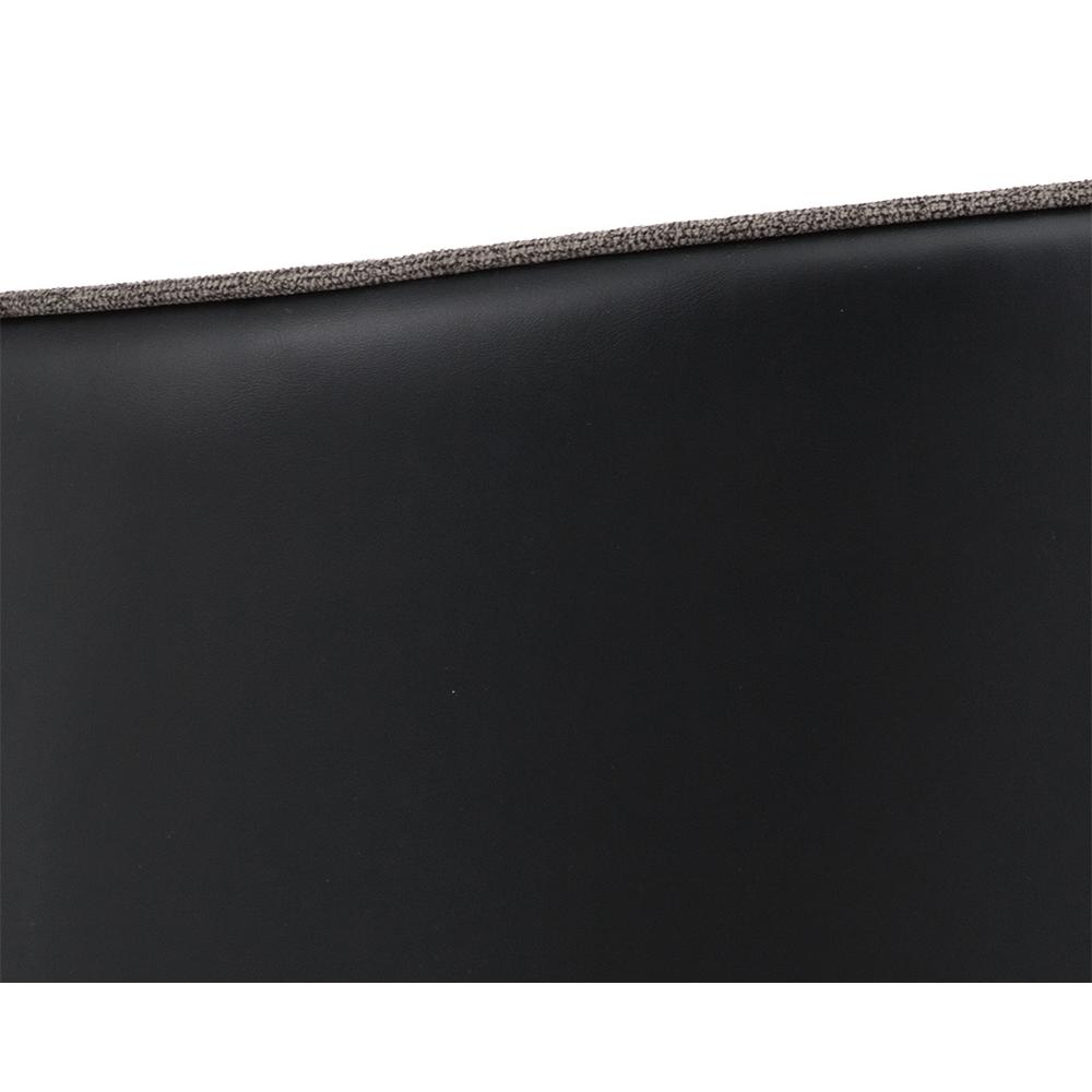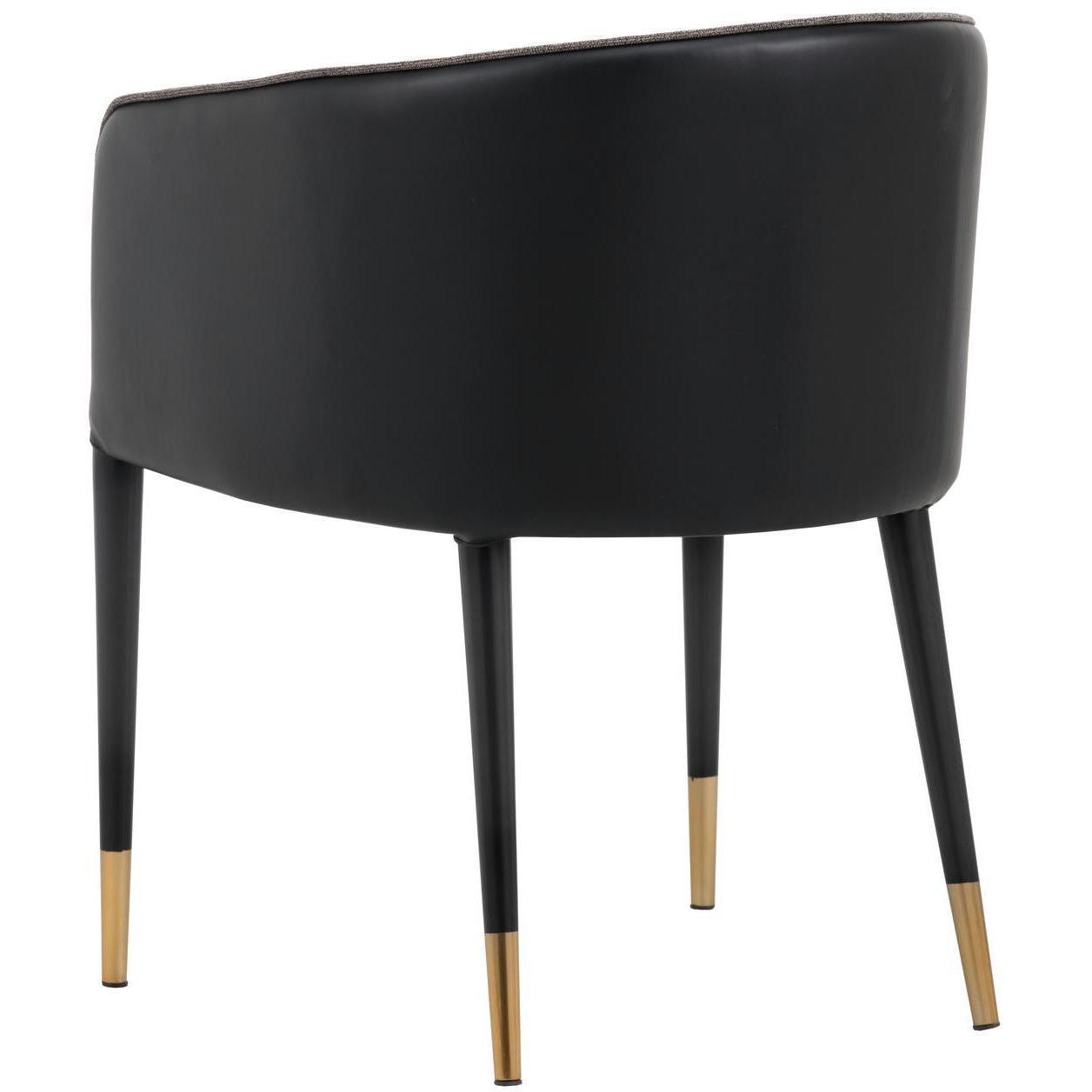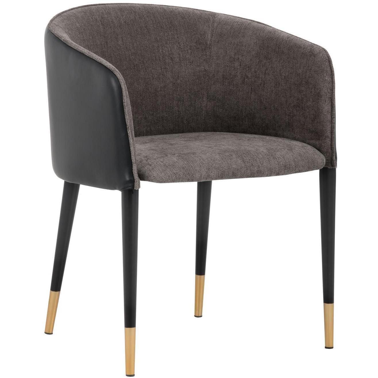 A modern barrel back dining armchair upholstered in our soft sparrow grey fabric and contrasting napa black faux leather. Finished with black steel legs and brushed gold foot caps. Handle With Care: This design has been crafted with faux leather. Faux leather is manufactured to reflect the natural characteristics of leather; as such, colour variations, markings wrinkles, grooves, and light scratches are appreciated characteristics. No two pieces will be alike.
