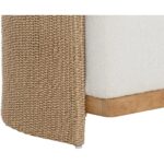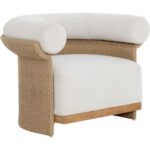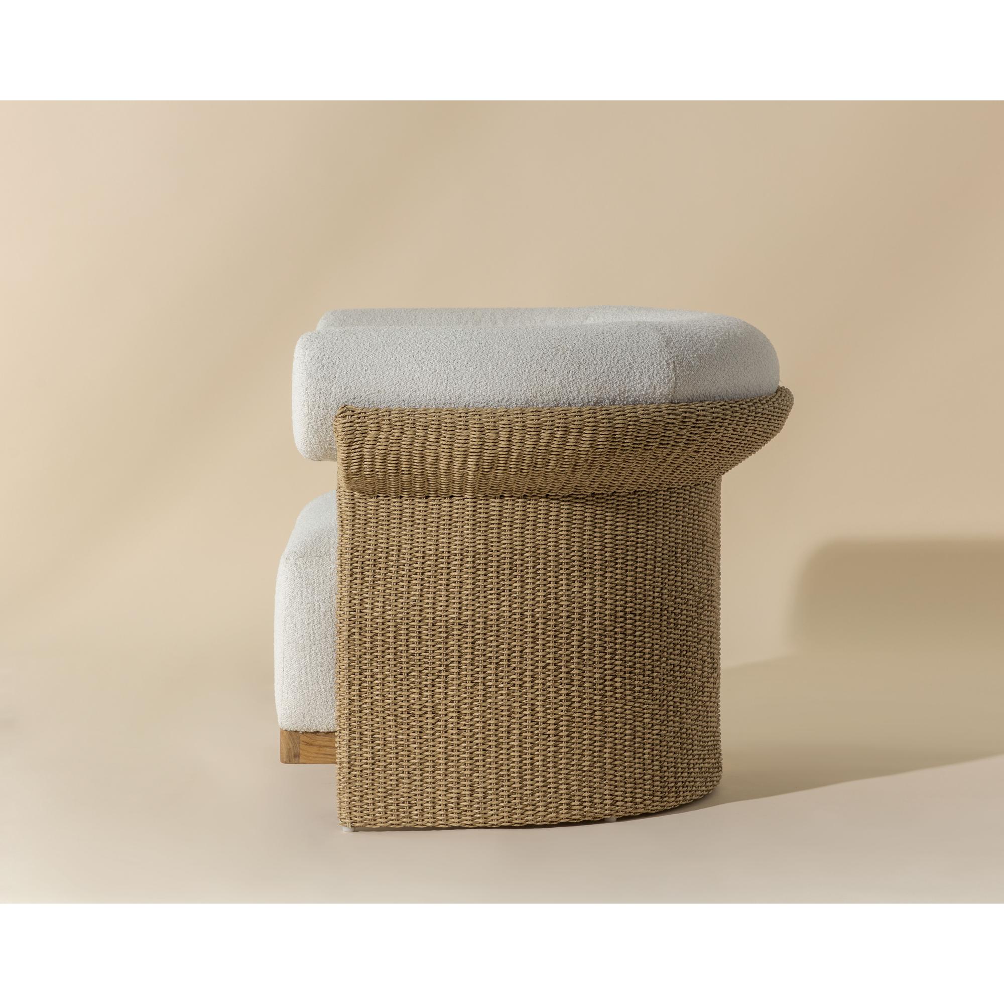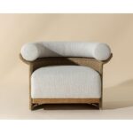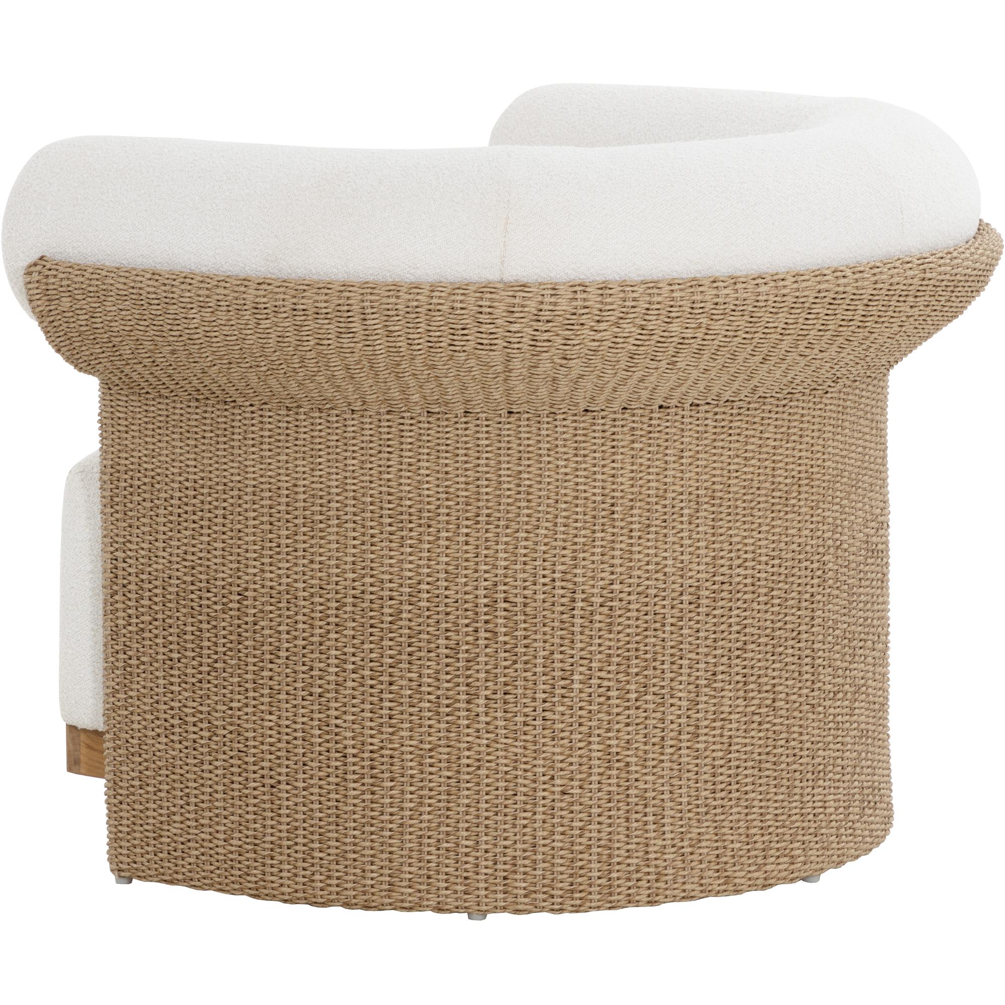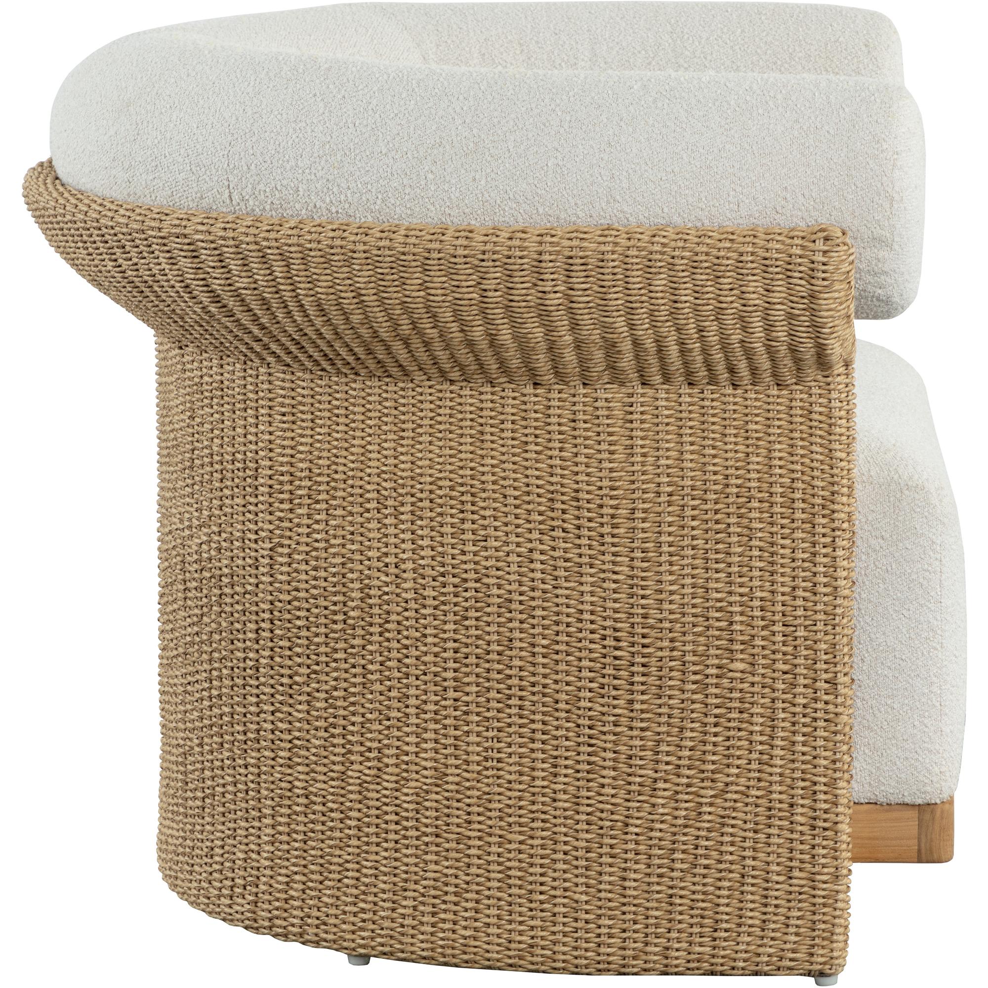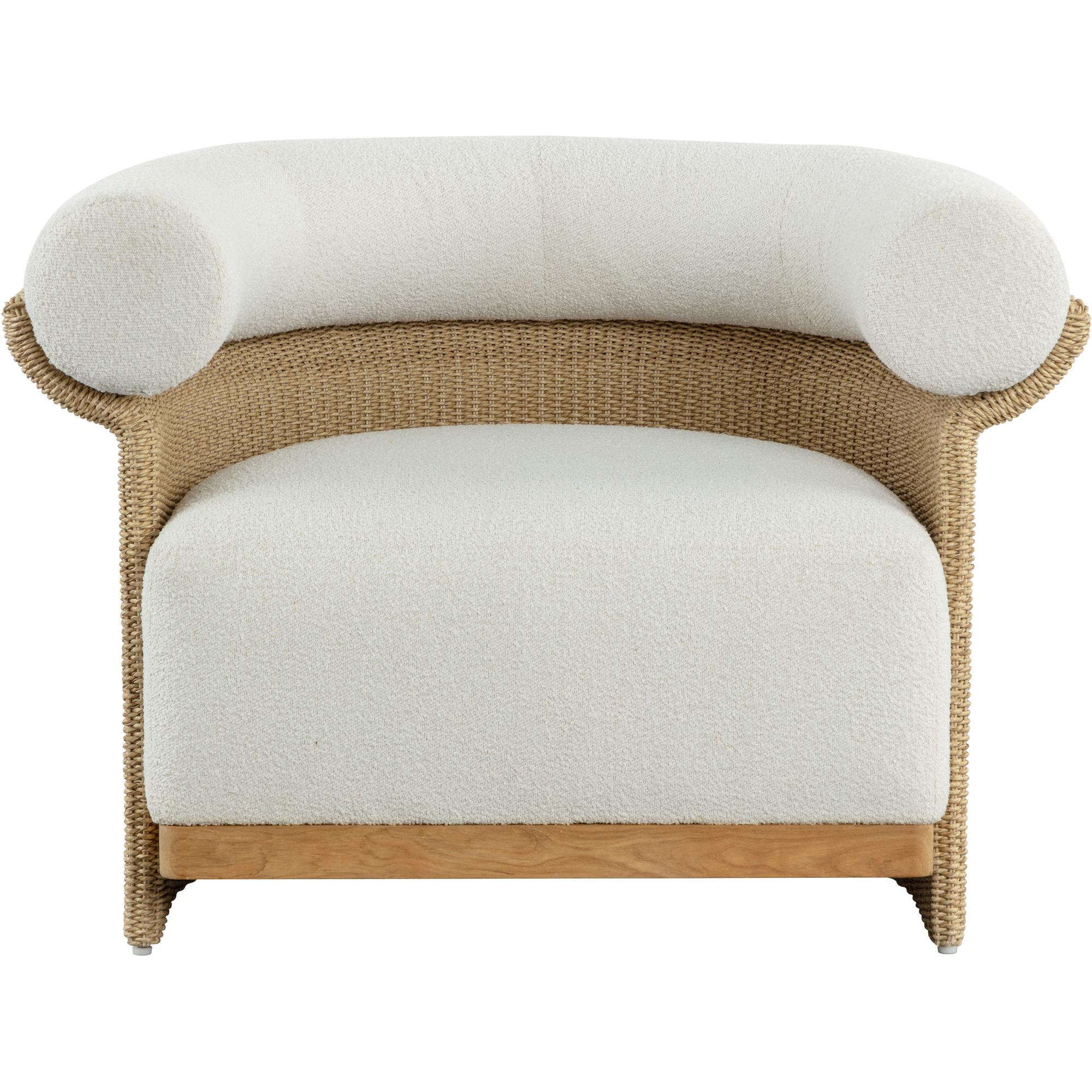 Artisan-crafted with shapely curves, the Asos Lounge Chair sits just right. Twisted all-weather wicker is weaved around a powder-coated aluminum frame designed to withstand the elements. Added comfort is found in the bolster back and seat cushion upholstered in louis cream boucle performance fabric. A teak wood seat base finishes the look. Suitable for indoor and covered outdoor spaces.