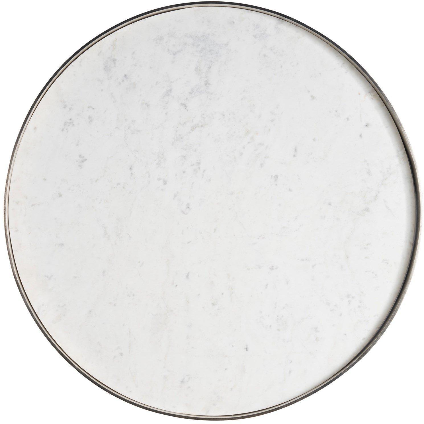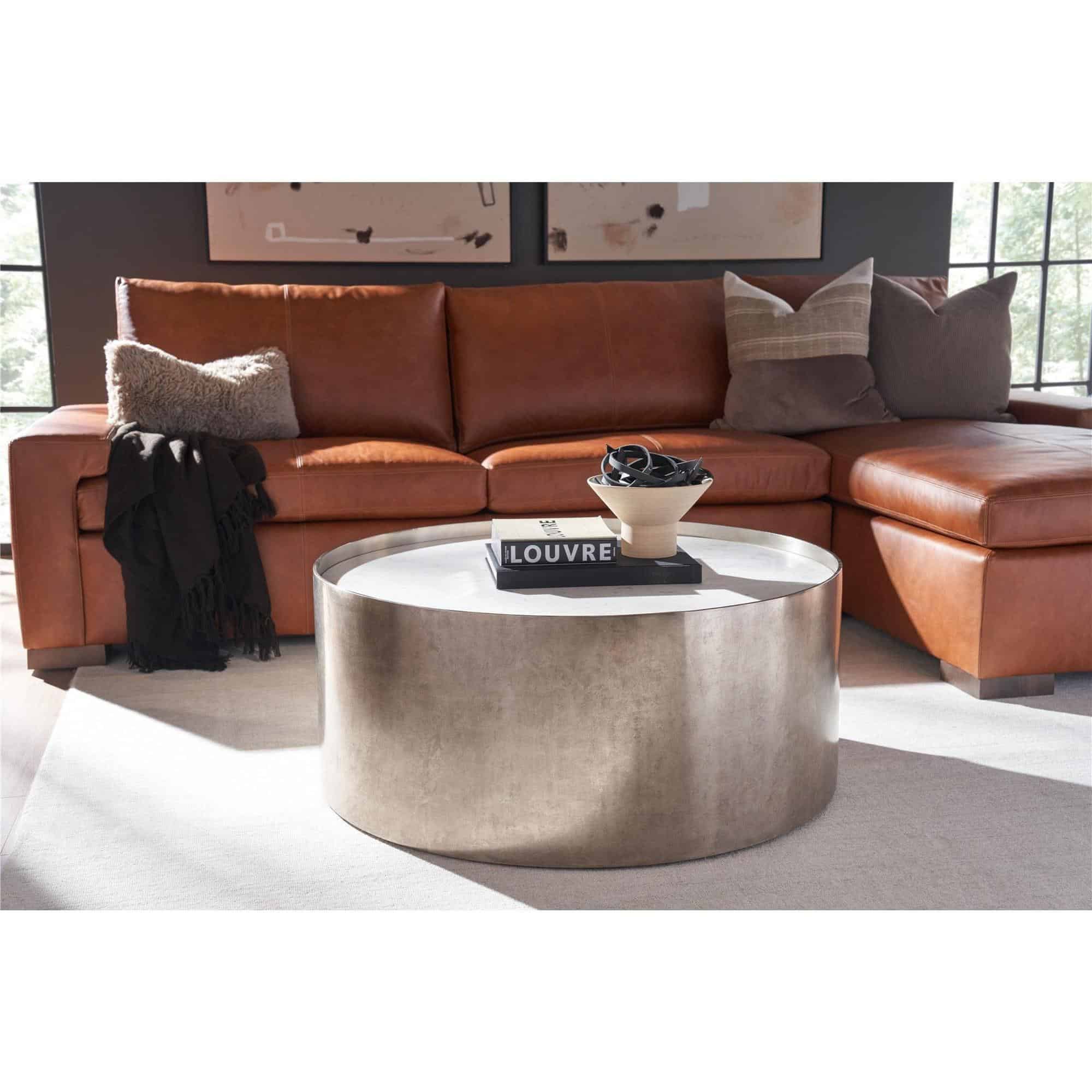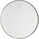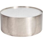 The Aspen Cocktail Table radiates a sophisticated allure, featuring a lustrous White Banswara top nestled within a sleek antique nickel frame. Its rounded form and gleaming surfaces introduce a modern opulence, channeling the essence of contemporary luxury and polished style.