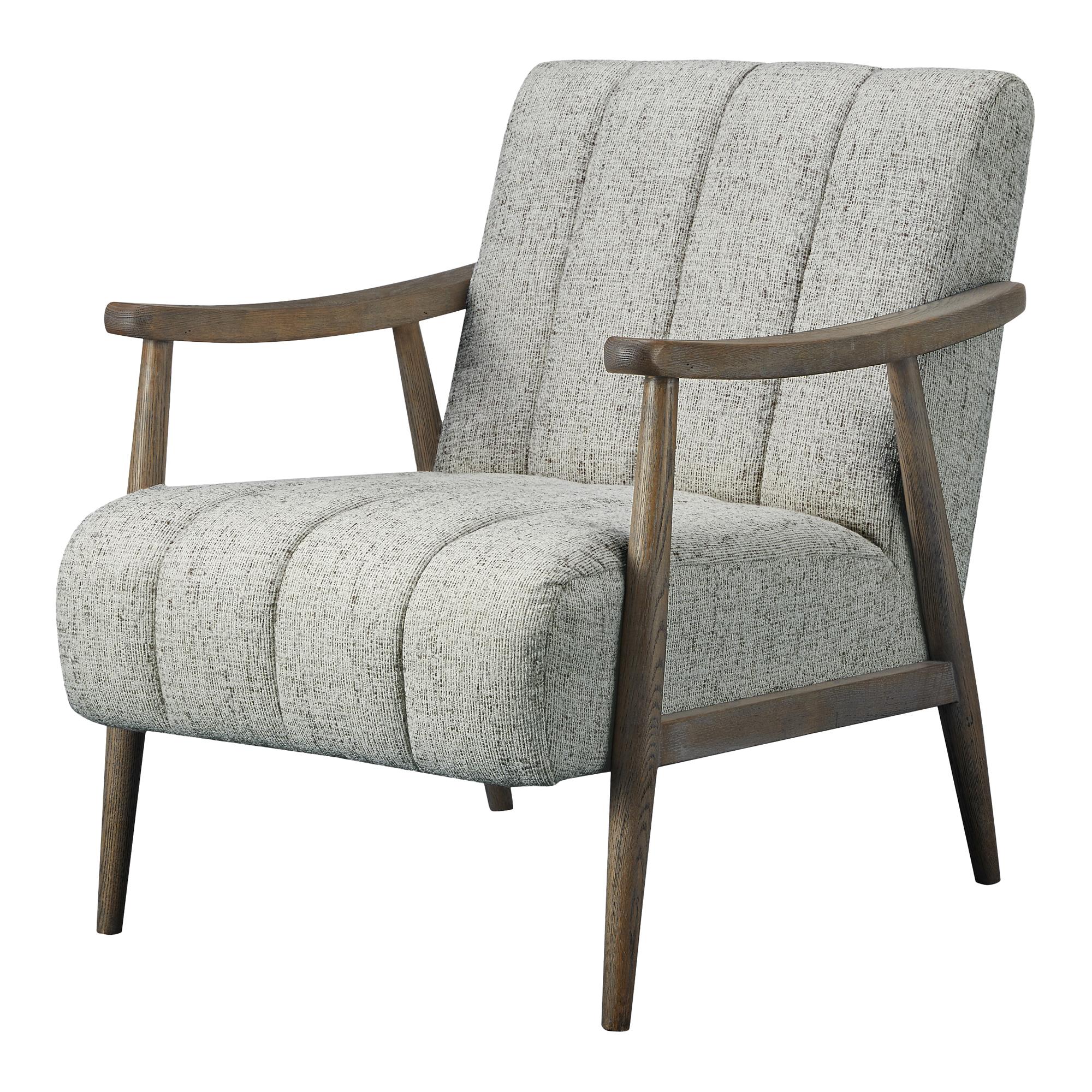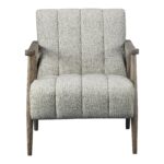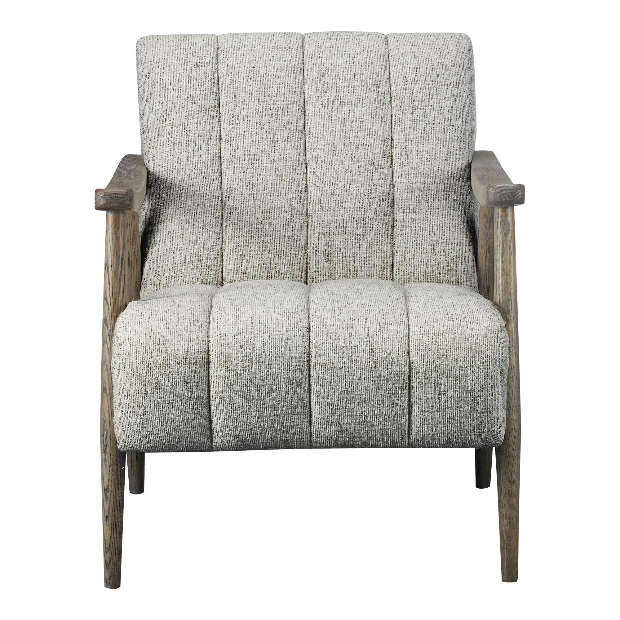 The Aster accent chair brings Mid-century inspiration and a rustic charm with a solid oak frame in an aged brown finish. Its channel detailing and textured upholstery in neutral tones add depth and visual appeal, while its timeless silhouette and meticulous craftsmanship add warmth to any space.