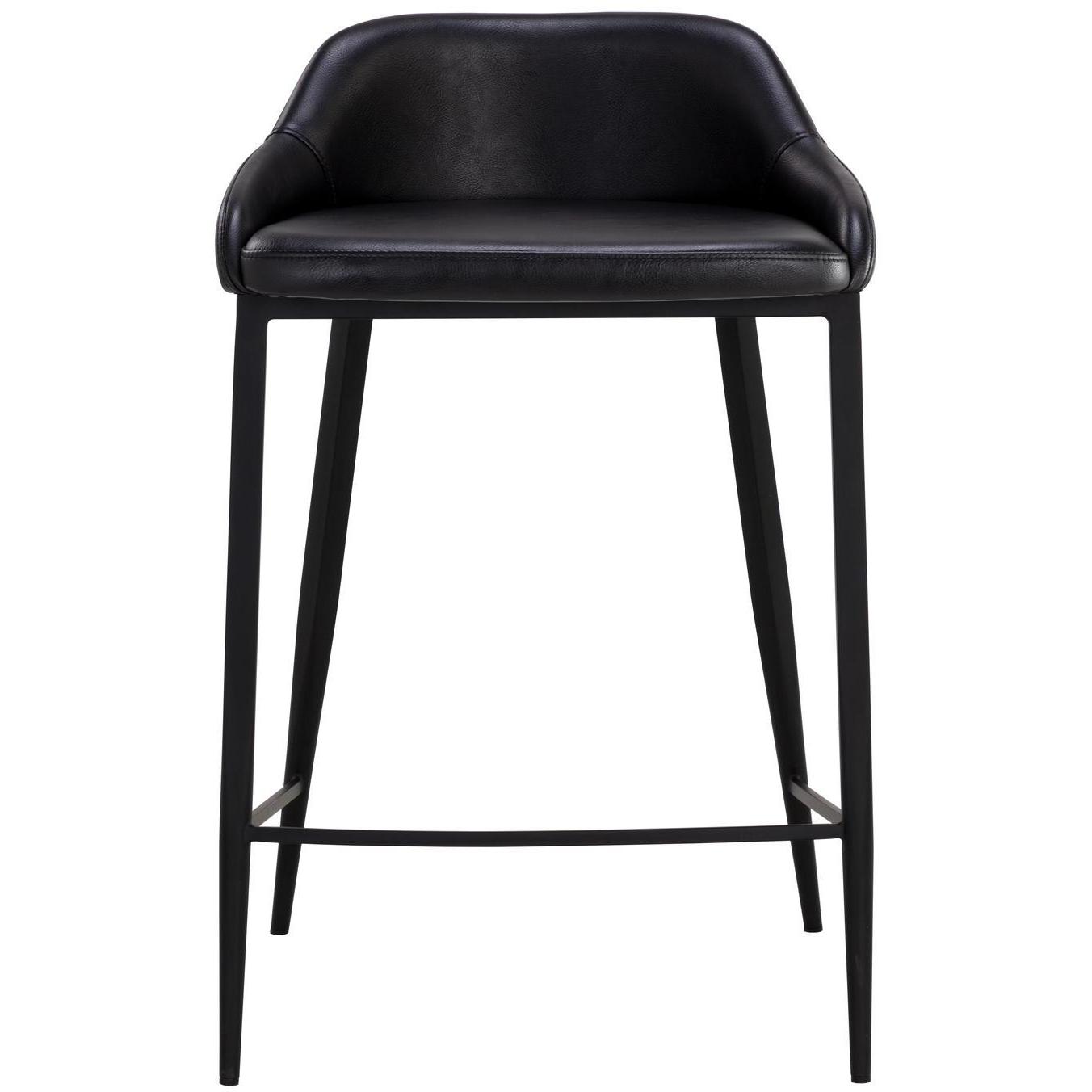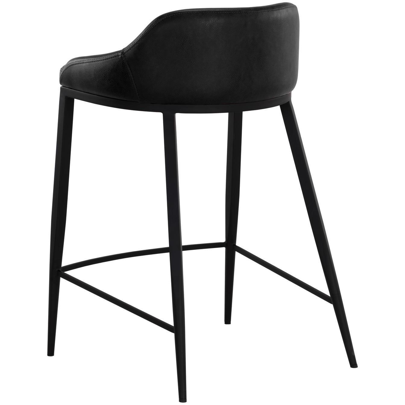 The Astra Counter Stool is distinguished by its strong modern silhouette and sleek black powder coated iron legs. Smooth nightfall black faux leather wraps around a comfortable low back seat. Handle With Care: This design has been crafted with faux leather. Faux leather is manufactured to reflect the natural characteristics of leather; as such, colour variations, markings, wrinkles, grooves, and light scratches are appreciated characteristics. No two pieces will be alike.