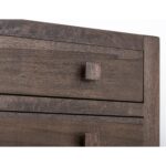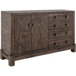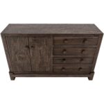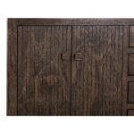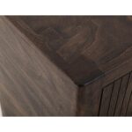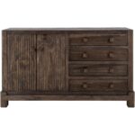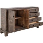 Bring the beauty of nature indoors with the Dark Atenas Console. This piece seamlessly combines style and functionality. Crafted from sustainable mango wood and engineered melina wood, it features a multi-step lacquer finish that provides a smooth and polished appearance, making it not only aesthetically pleasing but also easy to maintain. The dark brown finish highlights the unique grain patterns of the wood, ensuring that each console is one of a kind. The slatted doors and side panels are made from engineered melina wood, adding visual texture while providing structural stability. Additionally, it features four spacious drawers made of solid wood. The simple wood-squared pulls on the drawers blend seamlessly with the overall modern rustic design. Standing on sturdy legs, this console offers stability and a touch of rustic charm, ideal for enhancing any room decor.