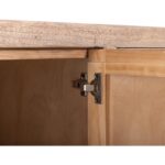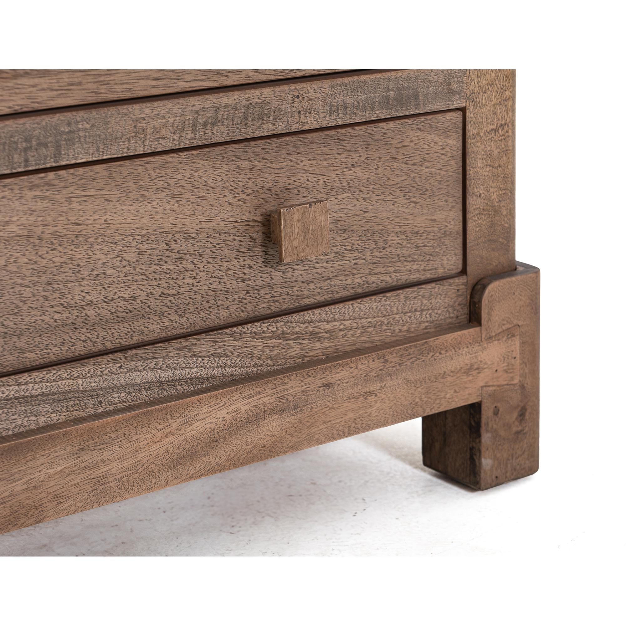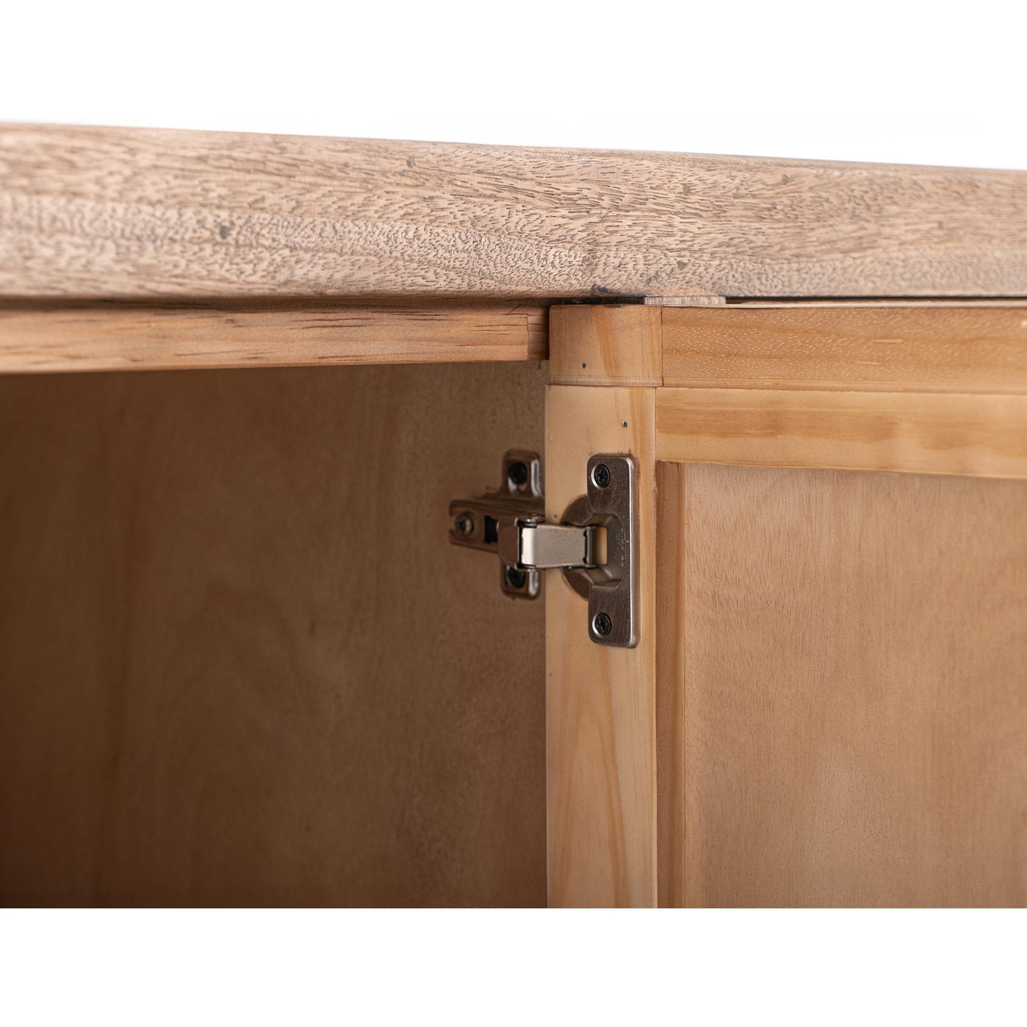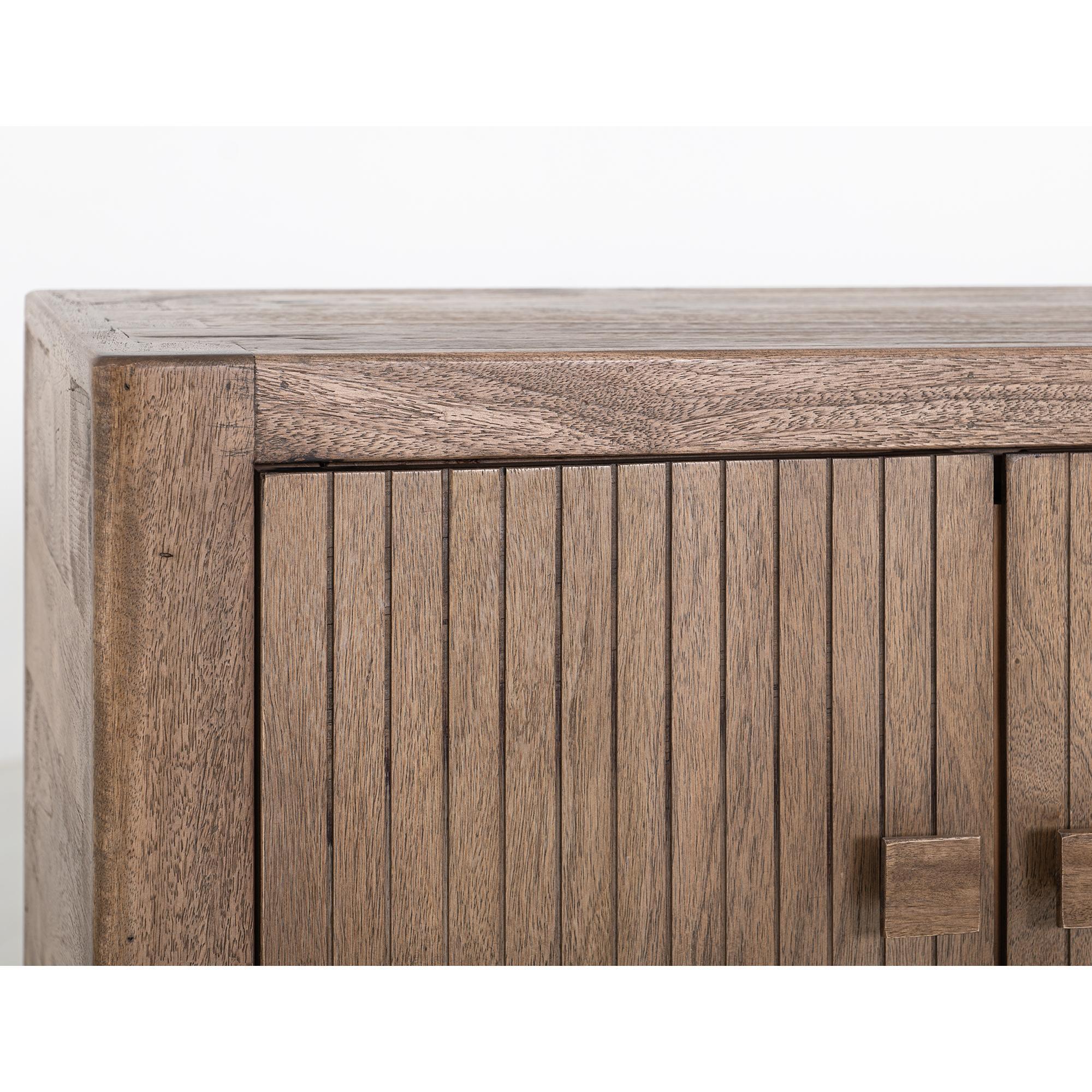 Bring the beauty of nature indoors with the Atenas Console. This piece seamlessly combines style and functionality. Crafted from sustainable mango wood and engineered melina wood, it features a multi-step lacquer finish that provides a smooth and polished appearance, making it not only aesthetically pleasing but also easy to maintain. The natural brown finish highlights the unique grain patterns of the wood, ensuring that each console is one of a kind. The slatted doors and side panels are made from engineered melina wood, adding visual texture while providing structural stability. Additionally, it features four spacious drawers made of solid wood. The simple wood-squared pulls on the drawers blend seamlessly with the overall modern rustic design. Standing on sturdy legs, this console offers stability and a touch of rustic charm, ideal for enhancing any room decor.