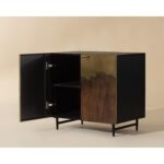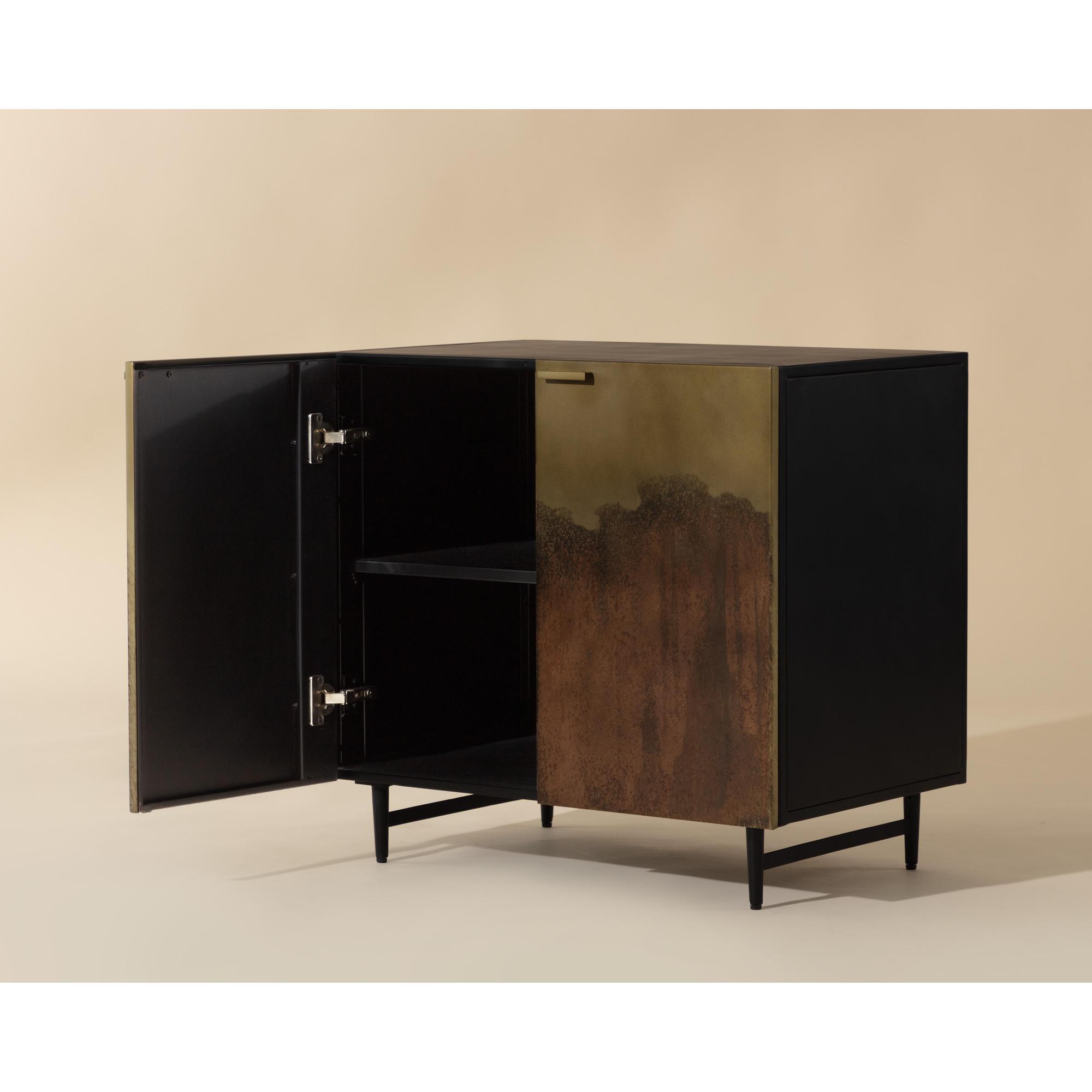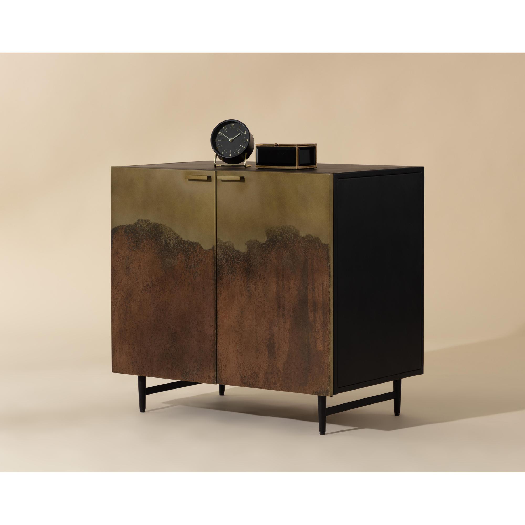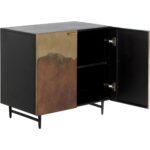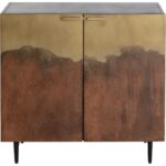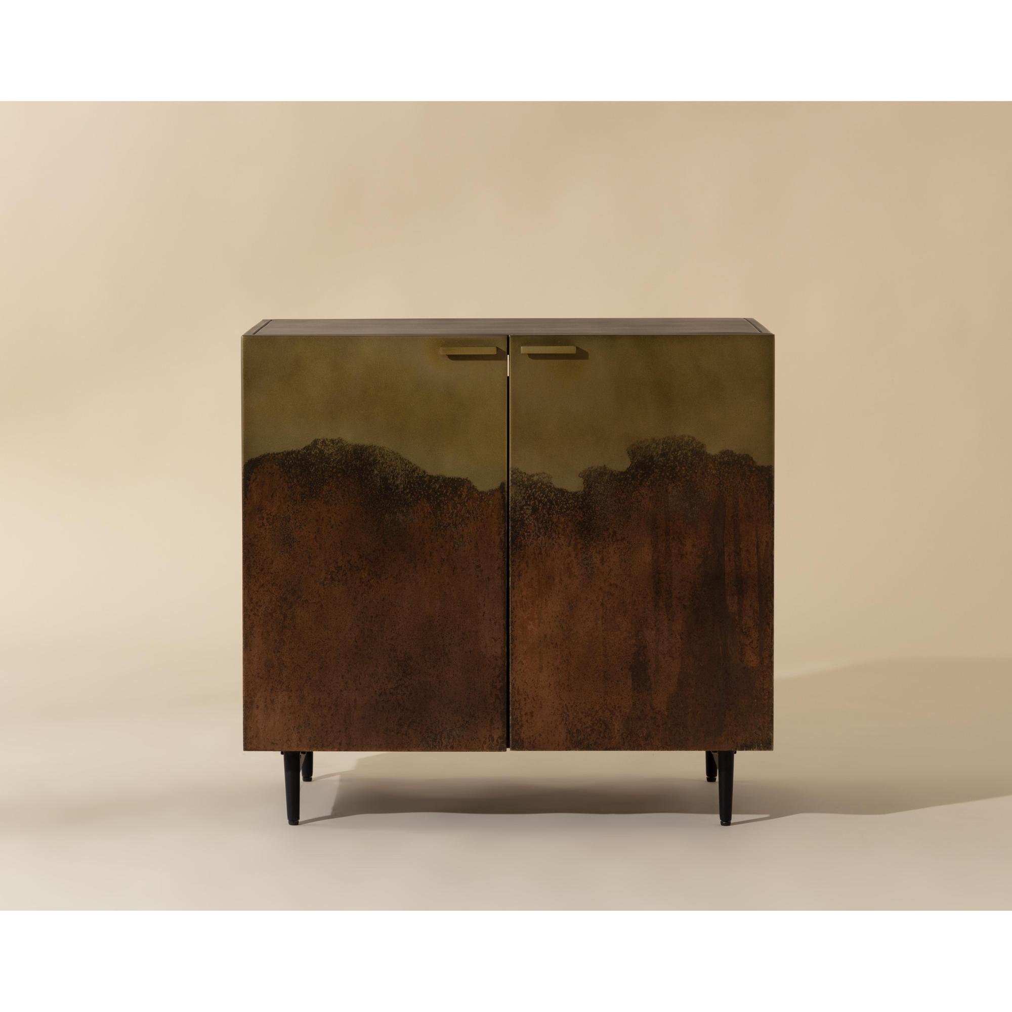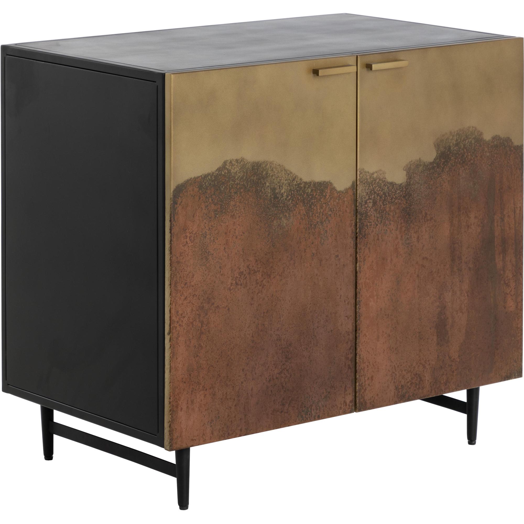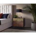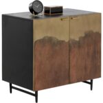 Inspired by global travels, the Auburn Nightstand exudes an exotic vibrance. Characterized by a unique antique brass ombre patina on the front doors. This piece features a cord management opening at the back, allowing it to transform into a small media unit when paired in multiples. Made in India. With refined craftsmanship, this design was brought to life by skilled local artisans. By nature, these materials develop unique imperfections such as markings and colour variations for a truly one-of-a-kind piece.
