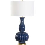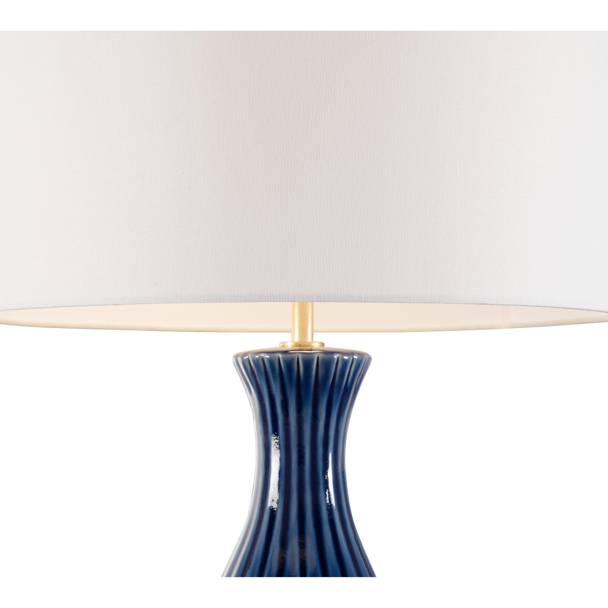 The timeless ceramic shape with blue matte finish and white shade of the Augusta Lamp creates understated luxury appeal and versatile styling.