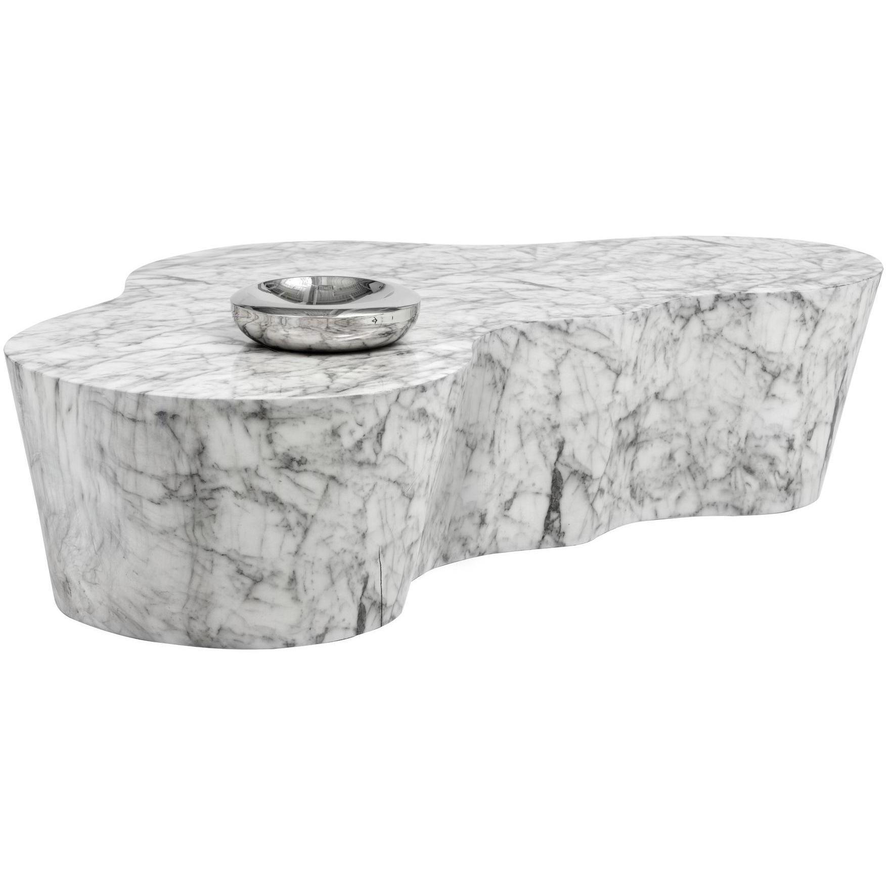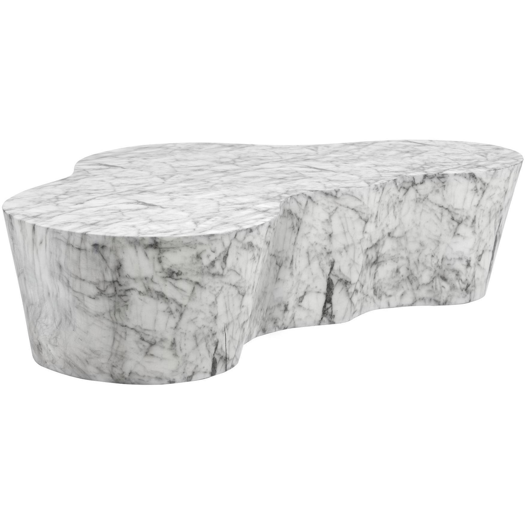 A contemporary and alluring coffee table. Sculpted from concrete and overlaid with a marble-look finish. The shapely design is eye-catching and unique for placement in residential and contract settings.