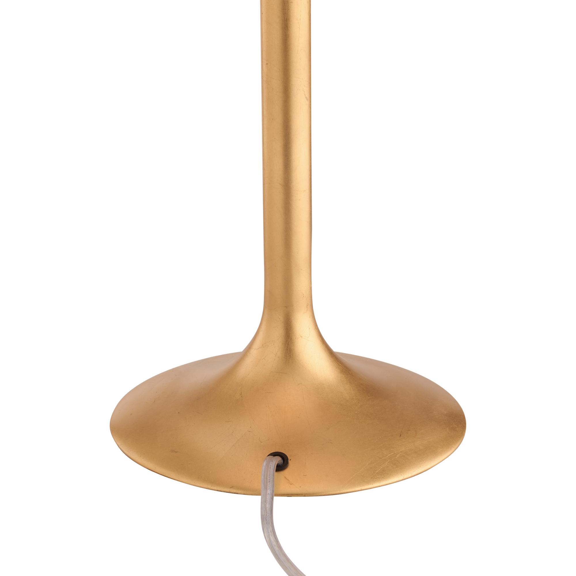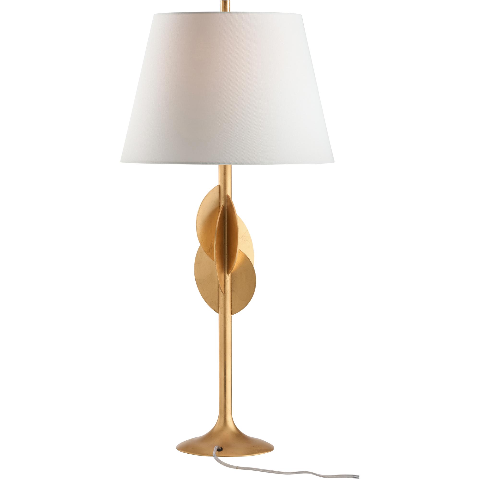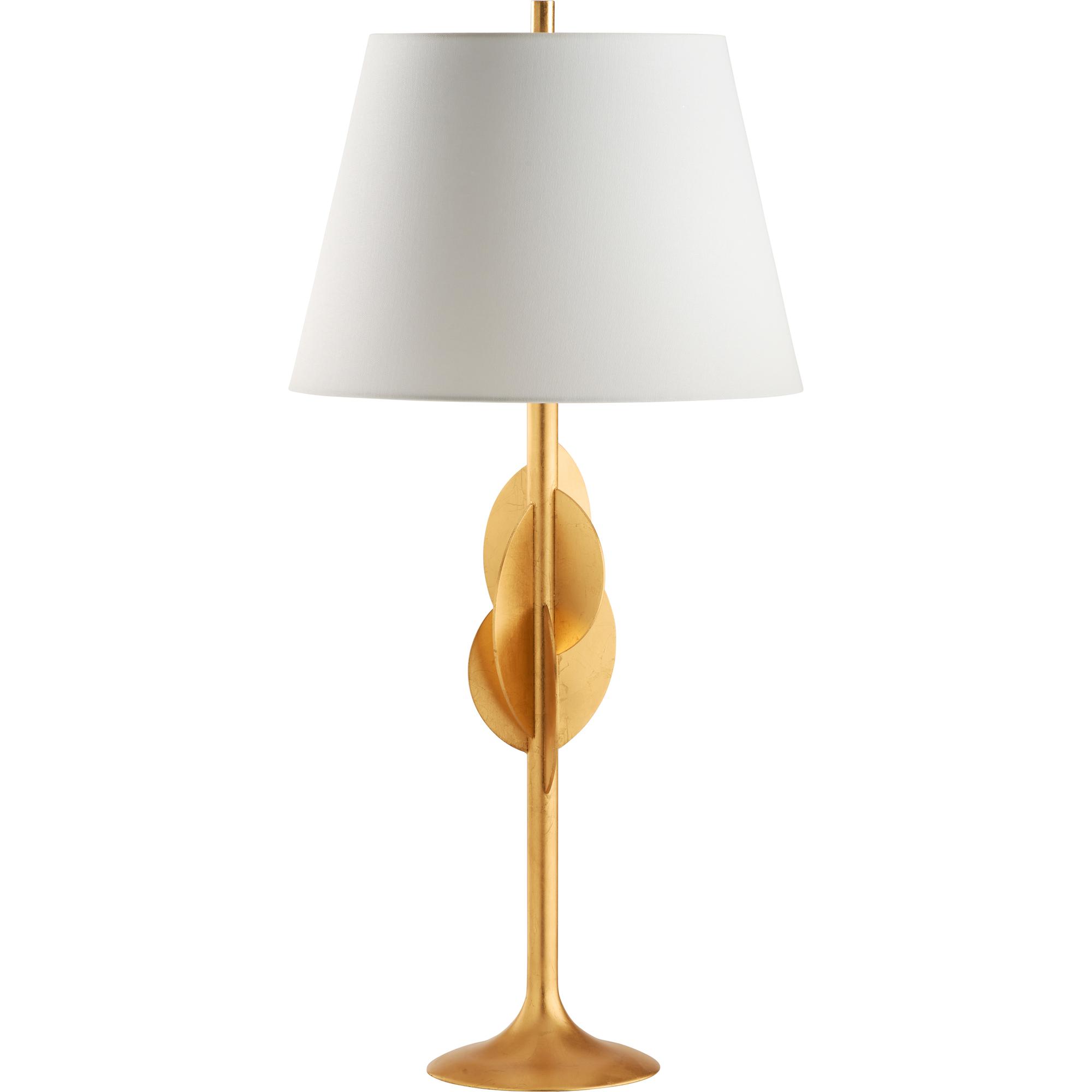 Sculptural and sleek, the Avalon Table Lamp features a gold leaf finish and layered disc accents for a bold, modern statement. A tapered shade adds balance and warmth to its striking silhouette.
