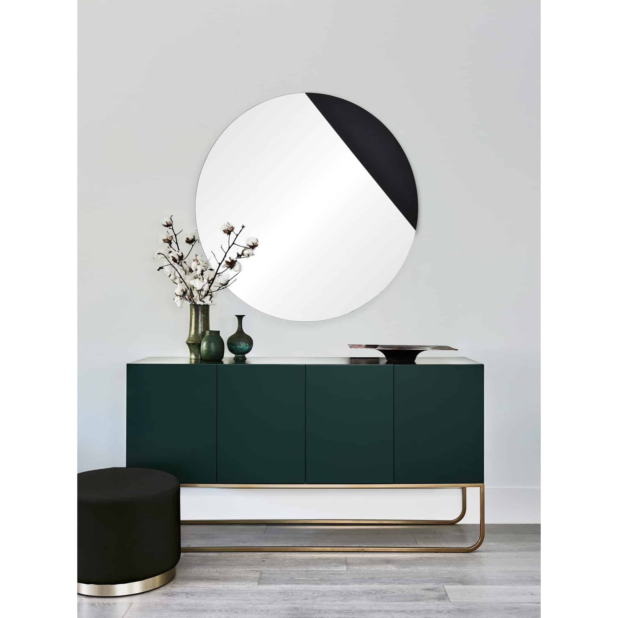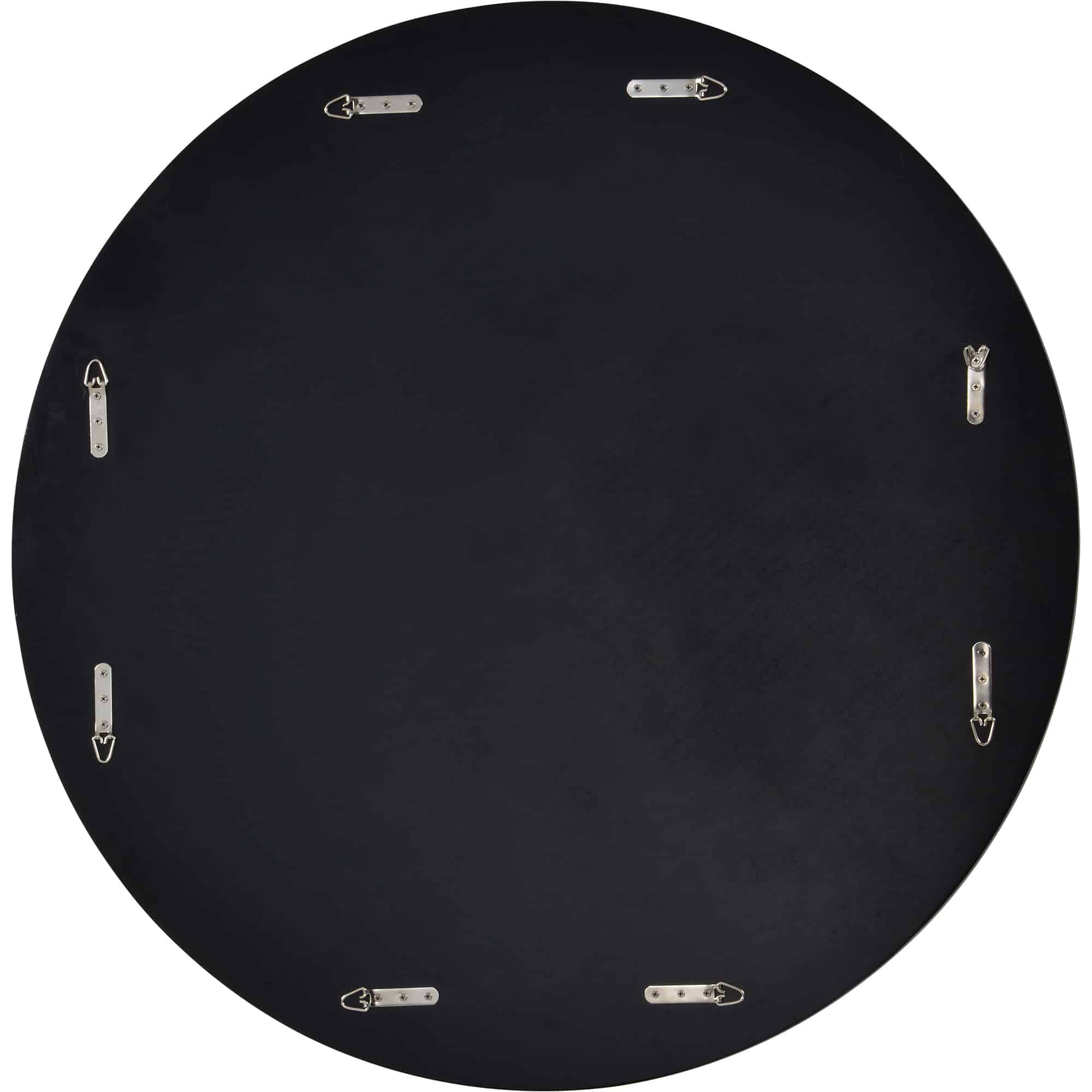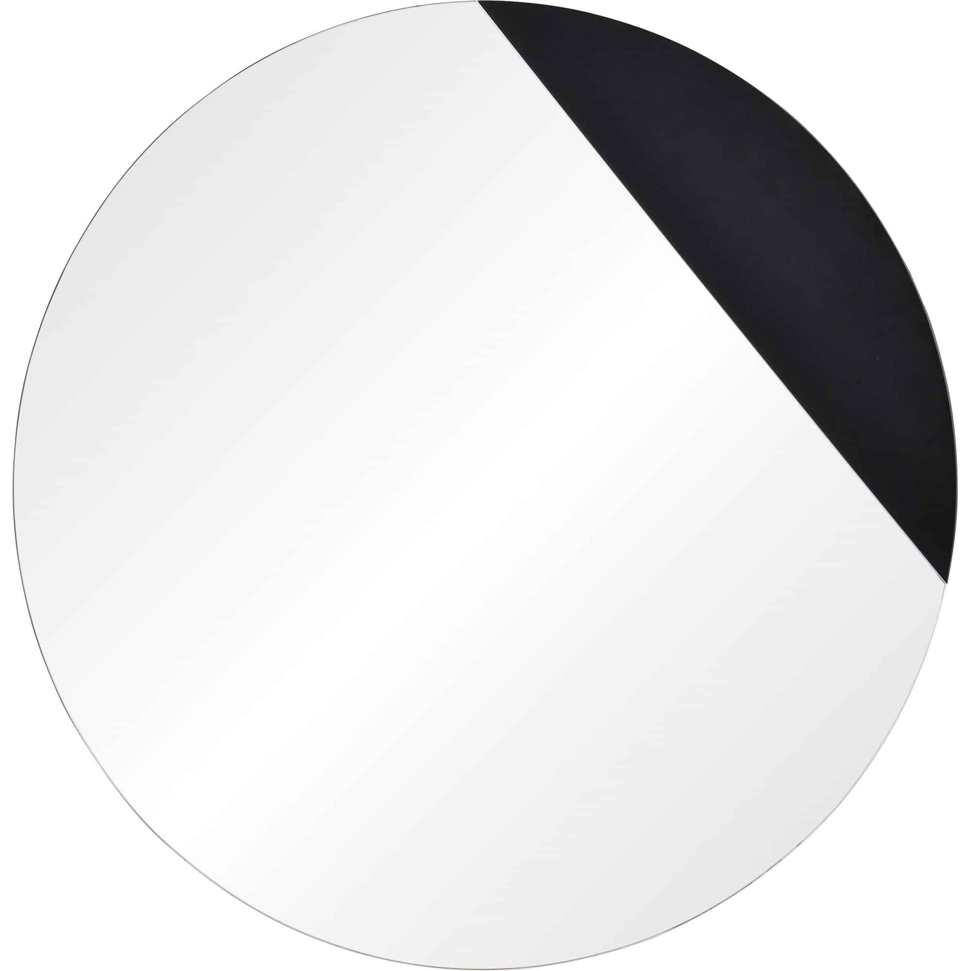 Contemporary style radiates from this unique spherical mirror. With a black veneer finished wood element, this piece makes a bold statement through its minimal design. Ideal for the modern home, it is perfectly suited to hang above a vanity or entryway table.