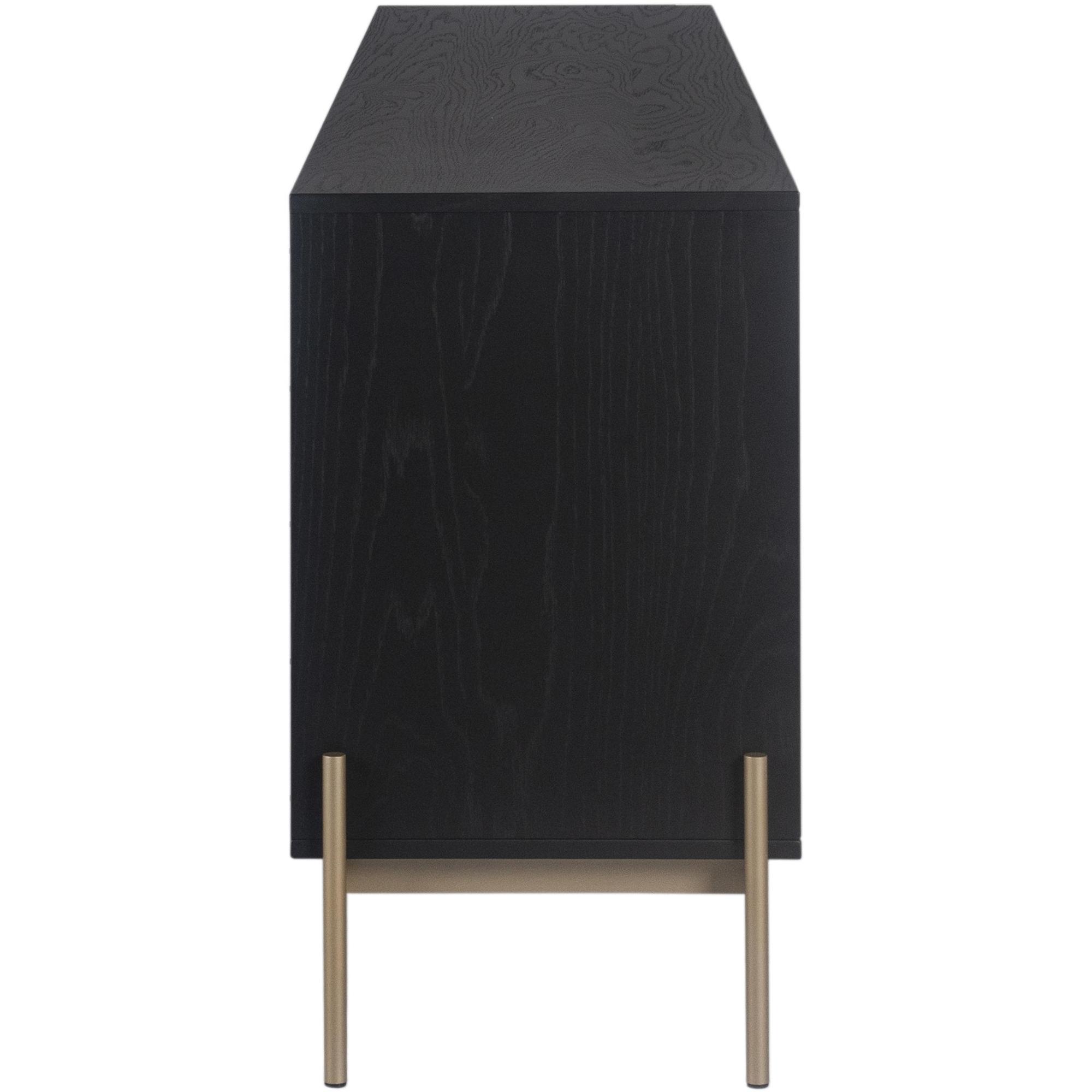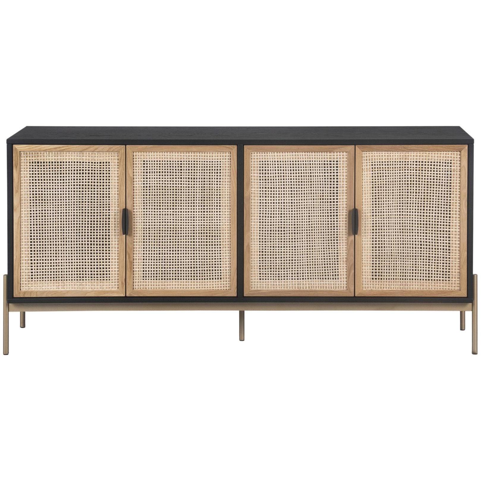 Create a space influenced by global travels with this stylish sideboard crafted in Indonesia. Features four natural rattan cabinets contrasted with a black oak wood frame. Gold iron feet and matte black steel handles complete the design.