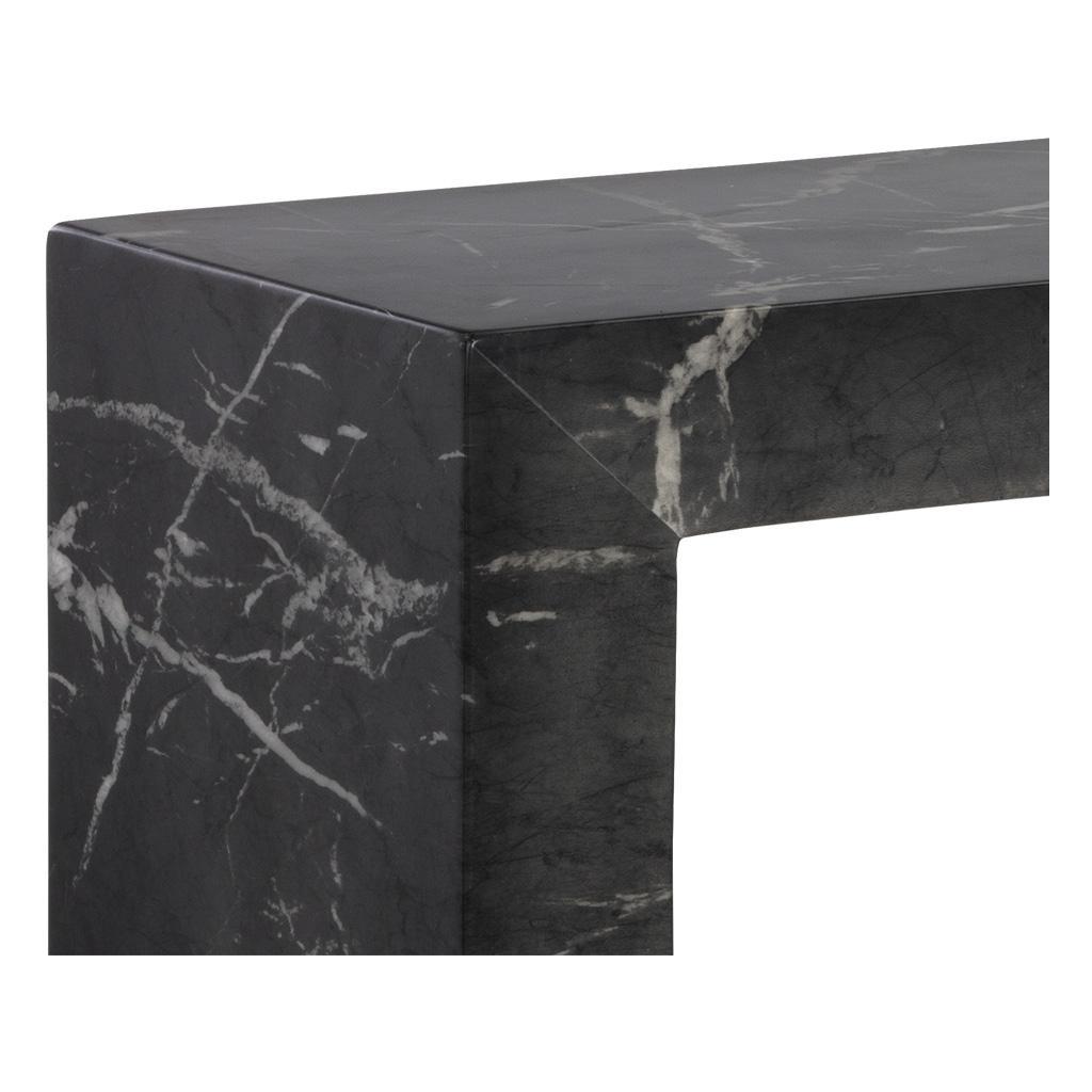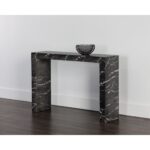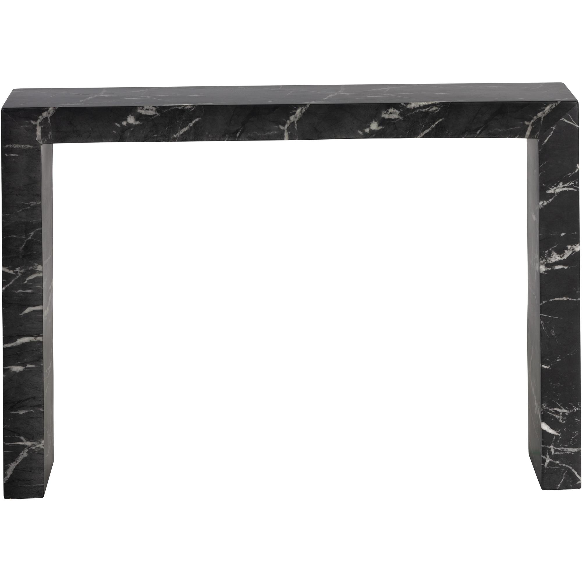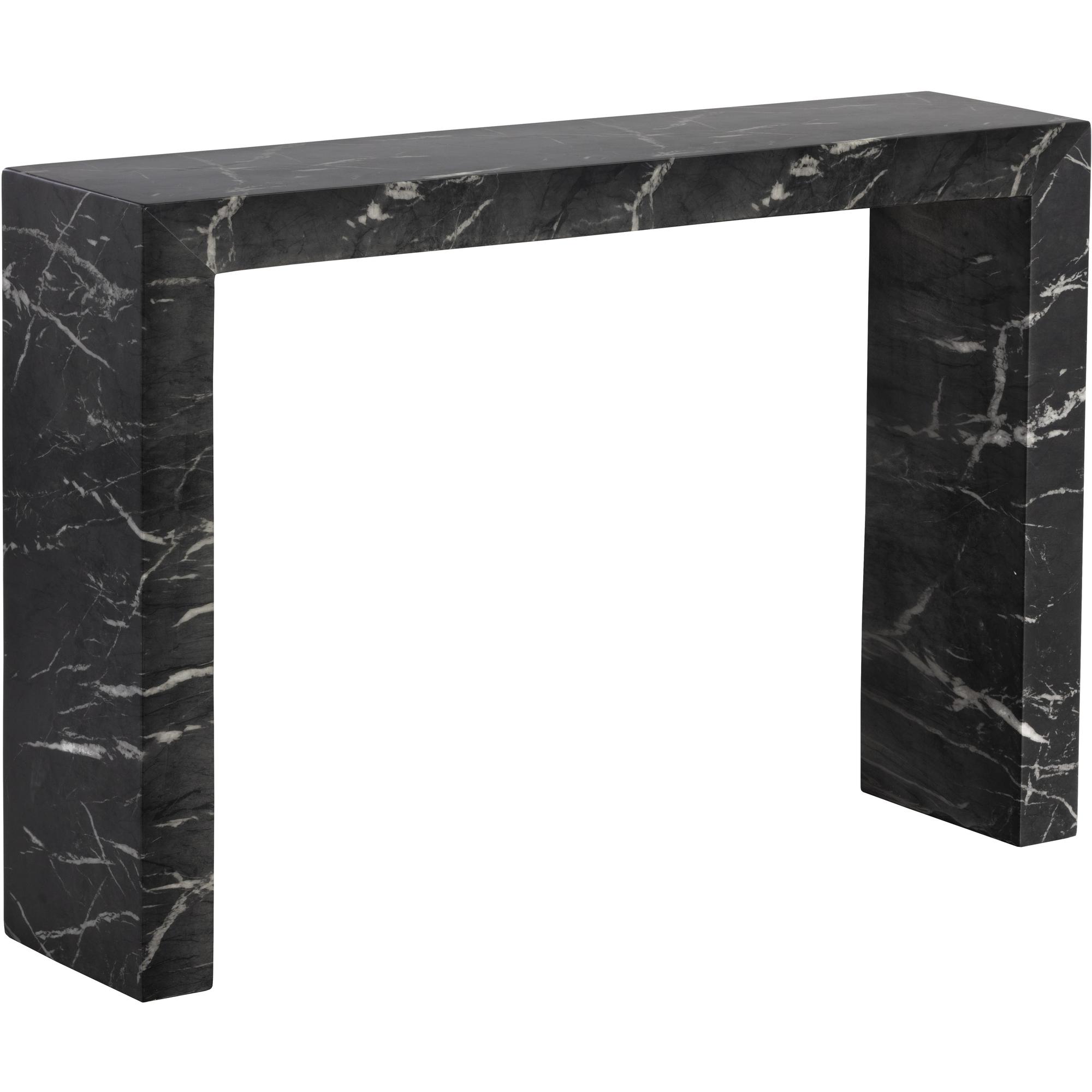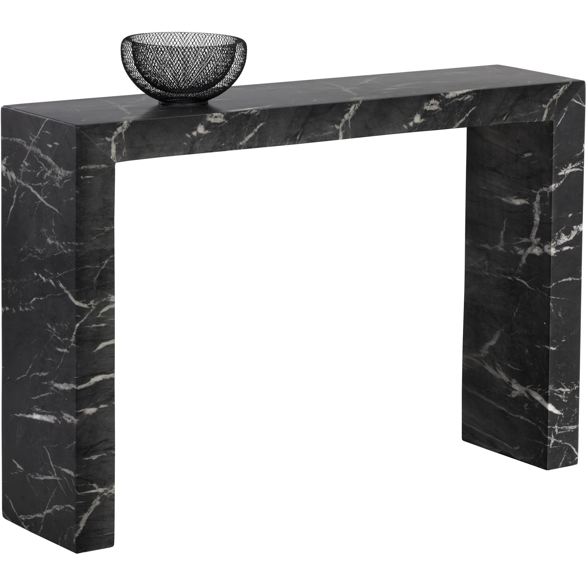 This console table makes a bold statement with its clean lines and concrete construction in a black marble look finish. Ideal for small spaces with its narrow depth.