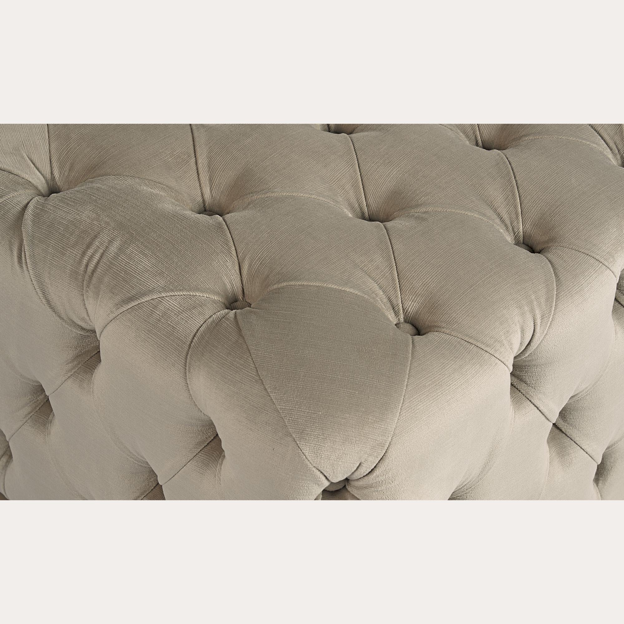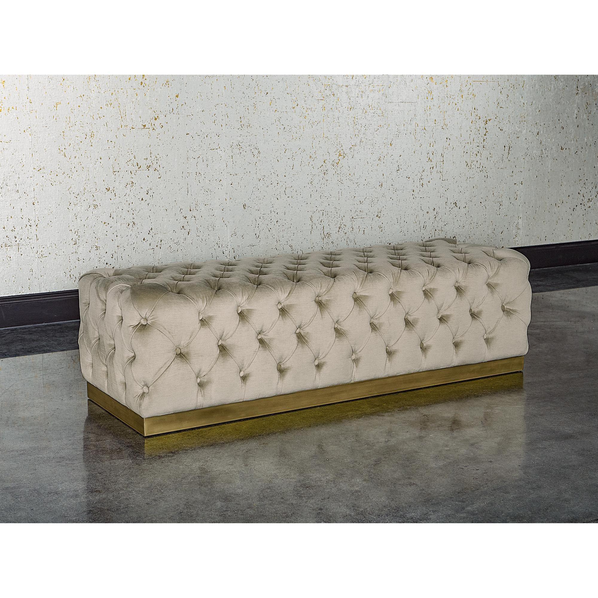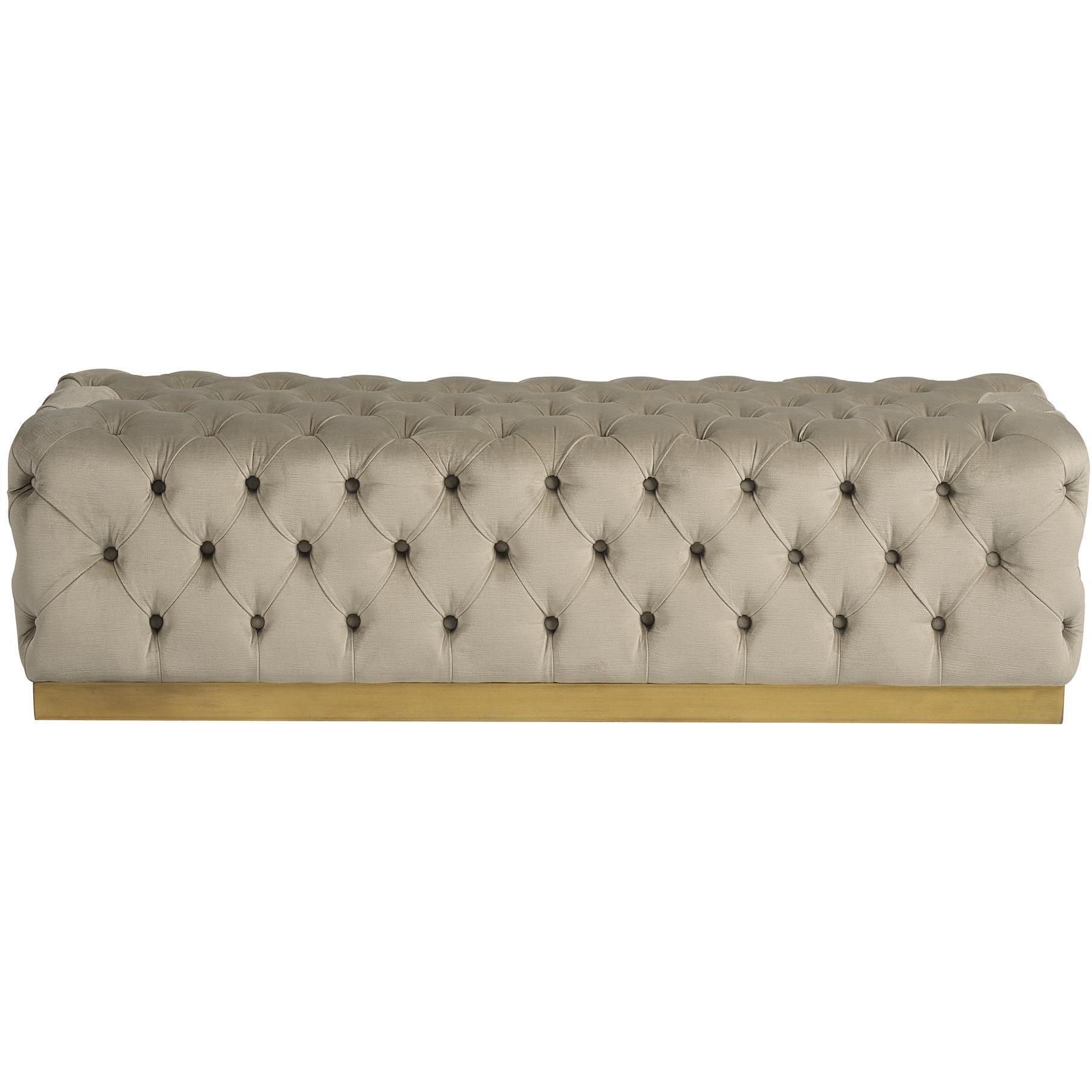 This classic bench incorporates feminine form and flair. Designed with deep tufting in luxurious piccolo prosecco performance fabric and finished with a powder-coated burnished brass steel base. Offers glamourous style as a coffee table or as extra seating. Performance fabric is moisture repellent, durable and easy to clean.
