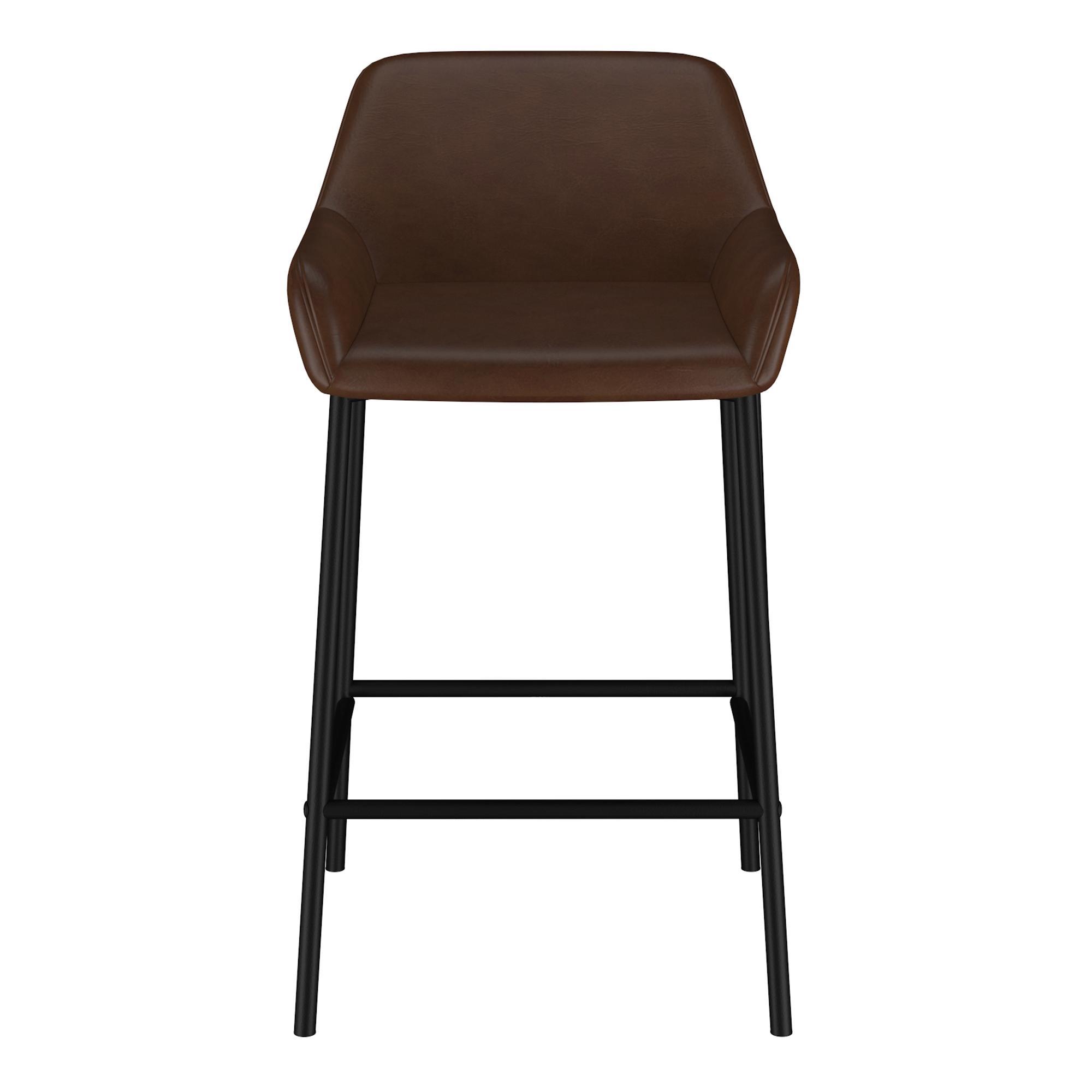 Contemporary counter height stool perfect for casual or formal seating at a kitchen island or a rec room bar. The cushioned seat and back will provide hours of comfort. The sturdy metal frame is finished in a matte black metal which allows for an easy match with any decor. The vintage faux leather upholstery looks elegant, is on trend, and is easy to wipe clean.