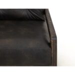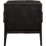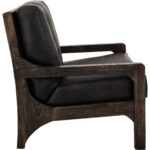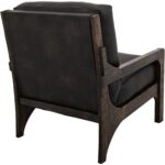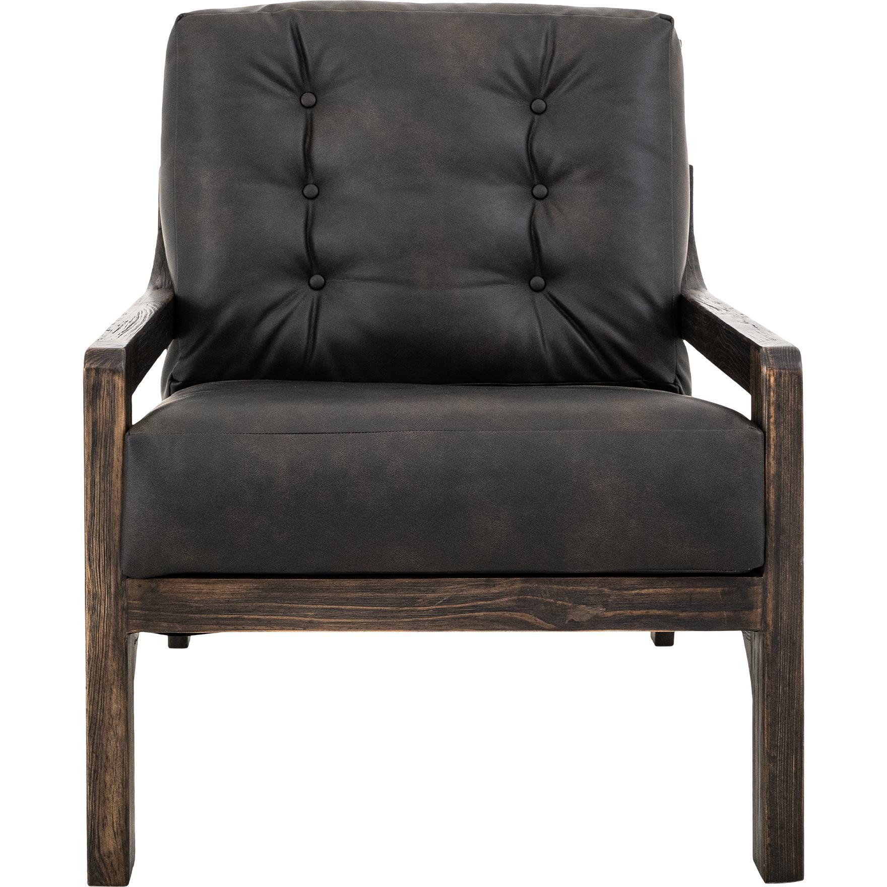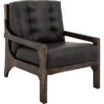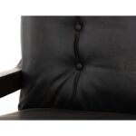 The Balam armchair features a wooden frame with a dark finish, offering a blend of modern style and timeless charm. The seat and backrest are upholstered in black faux leather, accented with elegant button tufting for added sophistication. With its thick cushioning and sturdy structure, this armchair combines comfort and durability. Its refined design is perfect for lounging in style.