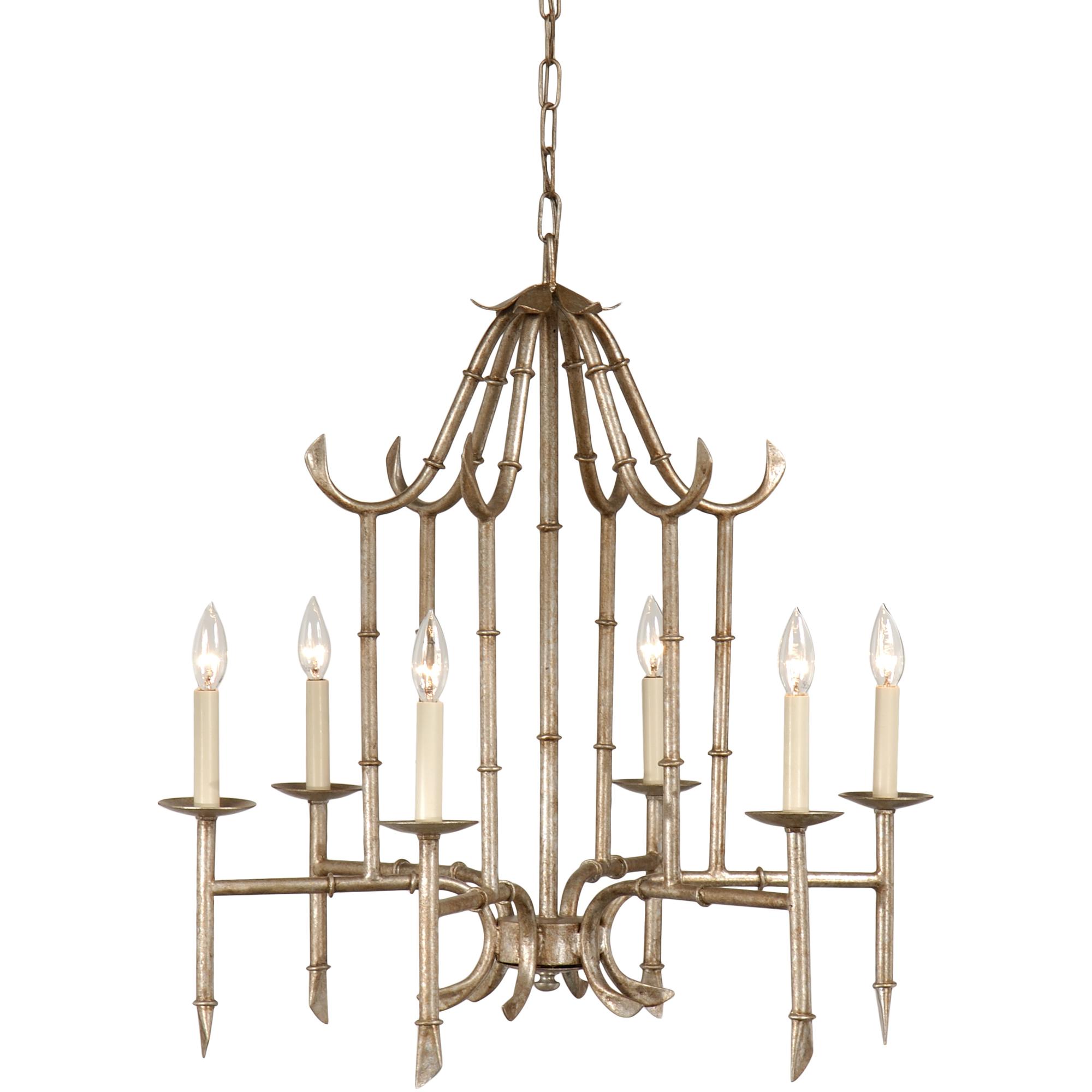 Antique silver with antique patina-6 lights. Comes ready to hang with 5″ canopy and 76″ of chain.