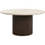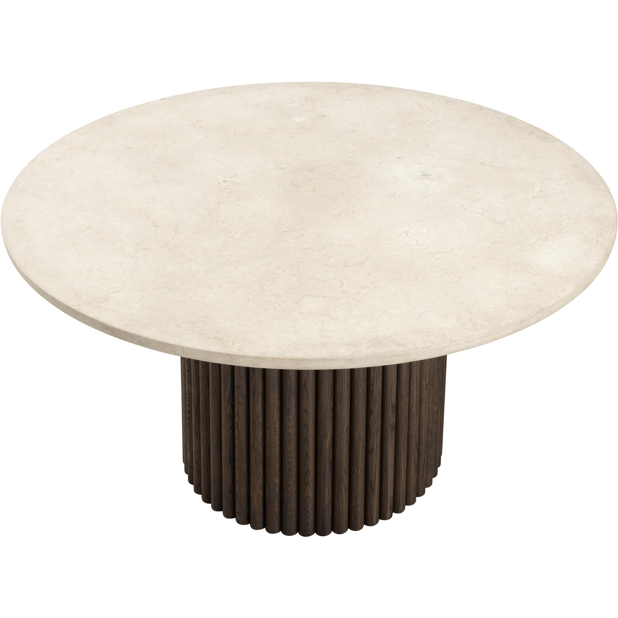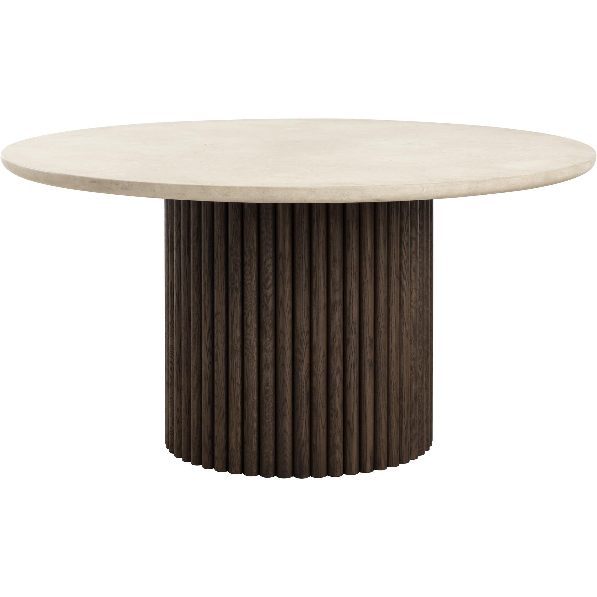 The Banyan Dining Table is a standout with rounded curves and sculpted edges. Crafted to perfection with a cream marble top and a fluted solid oak wood base, this dining table is a modern masterpiece.