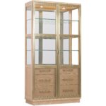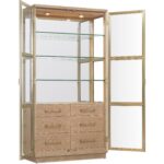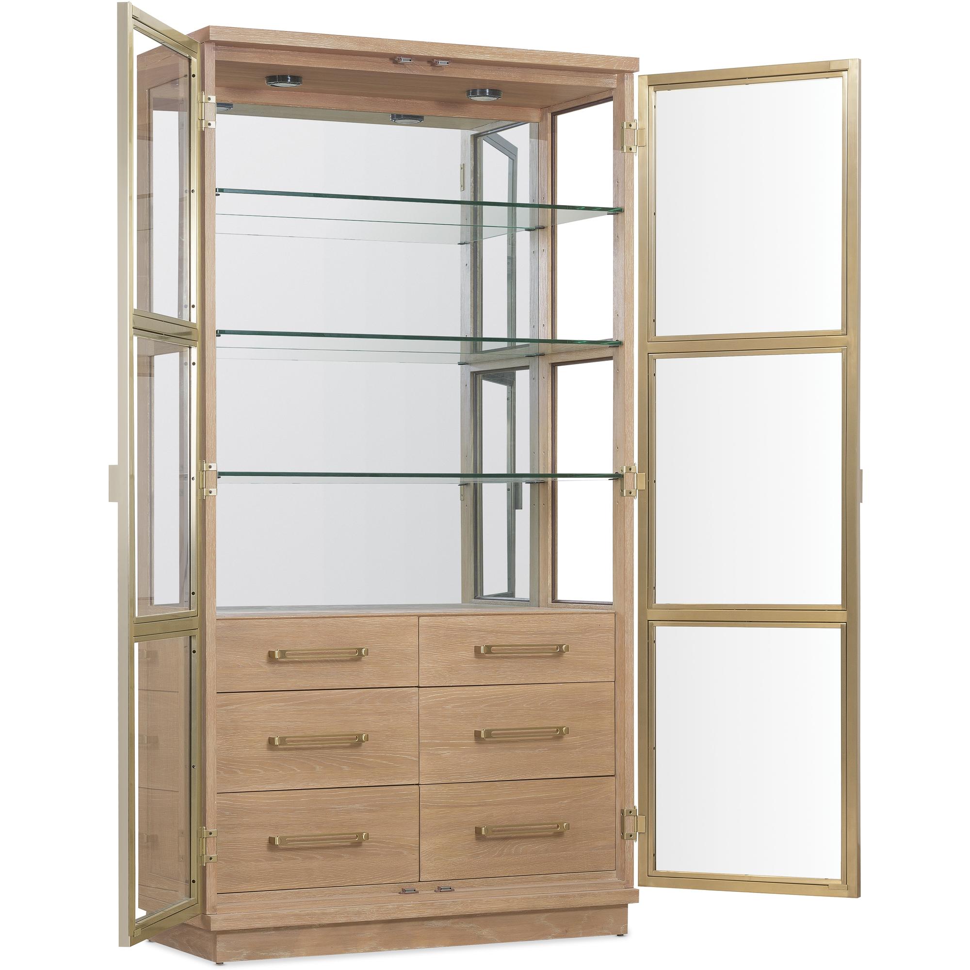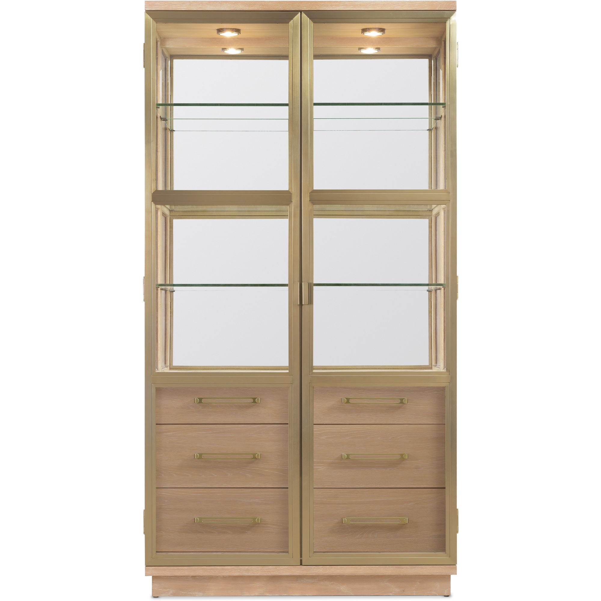 Features: Touch-activated LED lights in top Metal-framed glass doors in Brushed Brass finish Open glass sides Three adjustable glass shelves Six drawers Mirrored back panel Plinth base