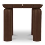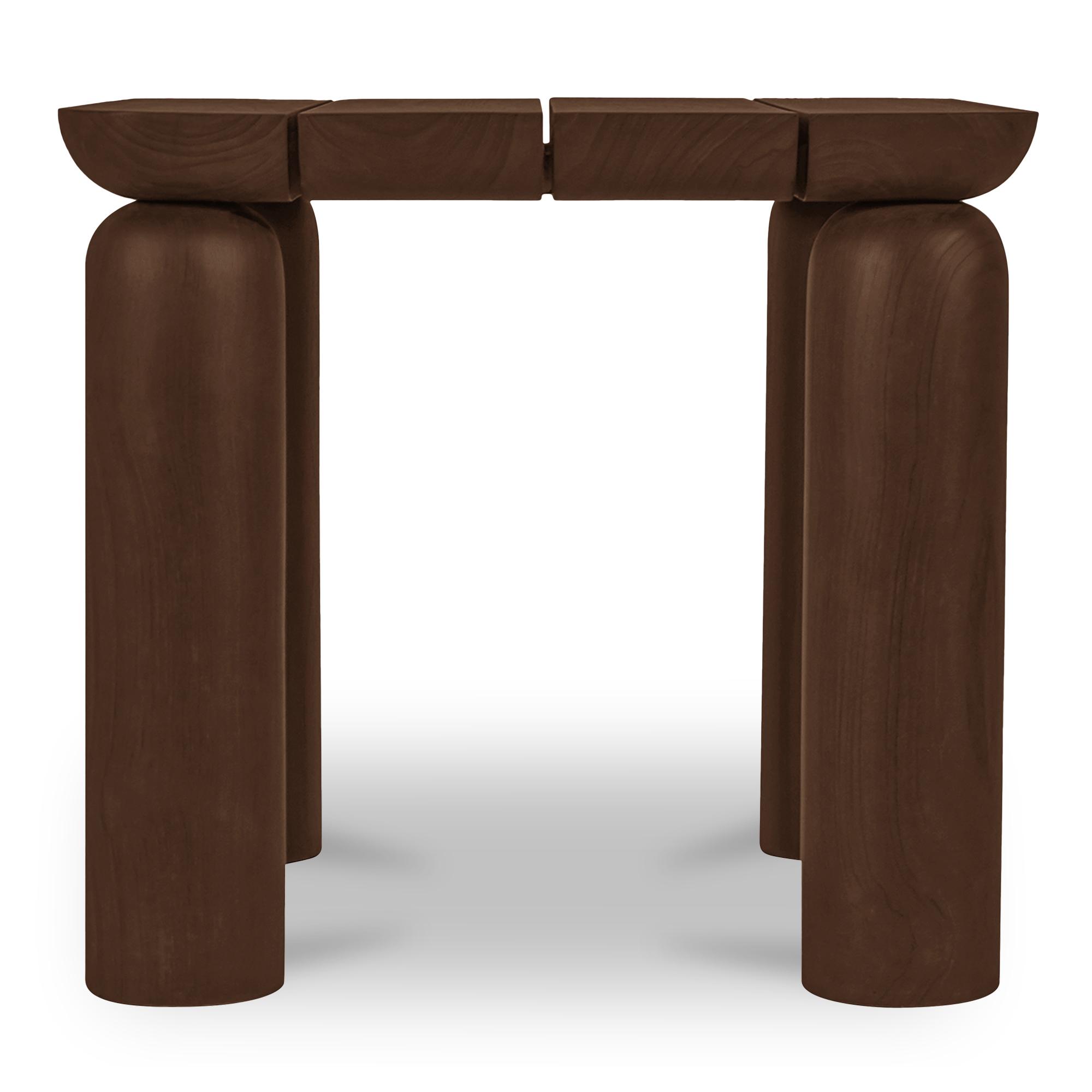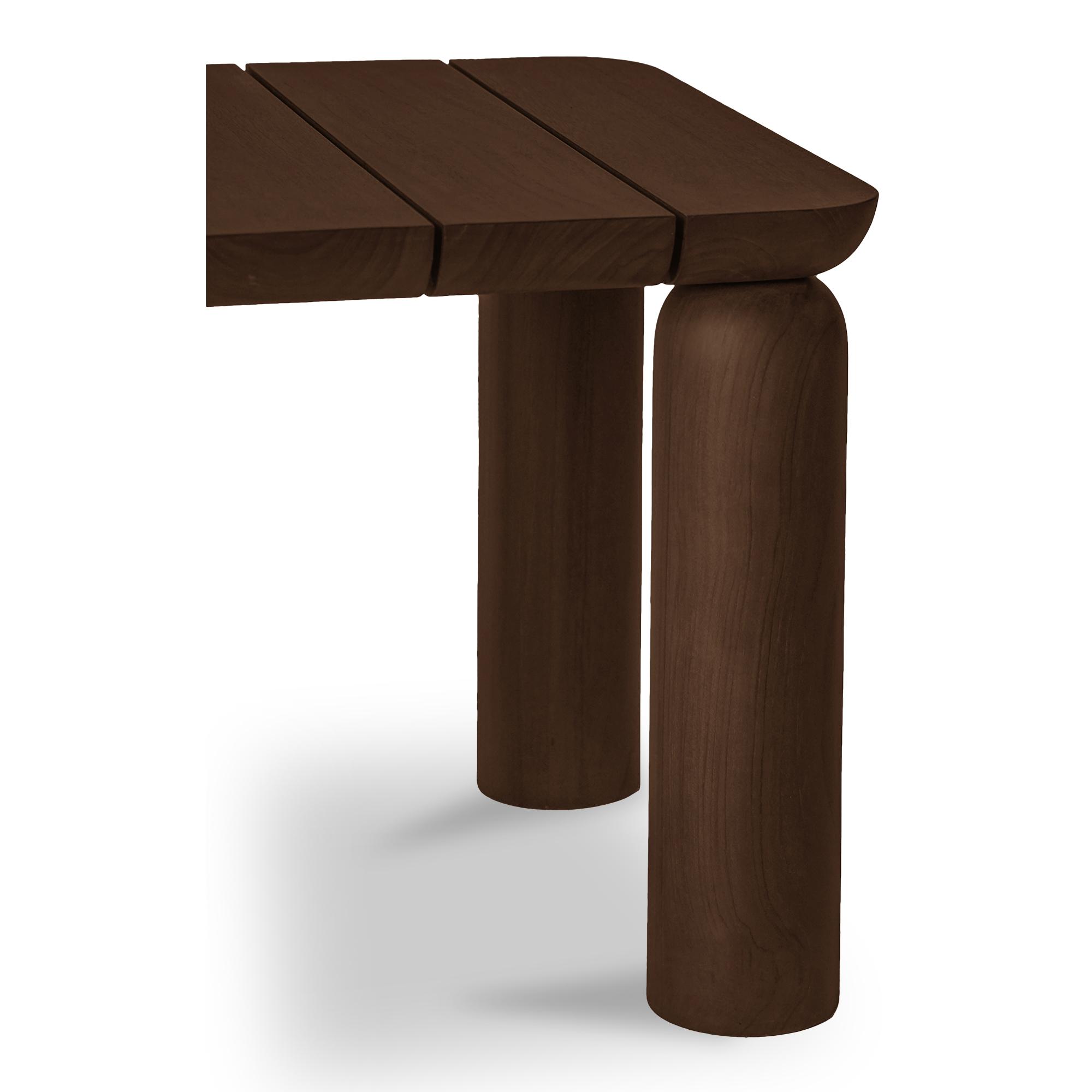 Durable and weather-resistant, the Barclay outdoor side table adds a playful touch to the outdoor space without compromising on elegance. This solid teak side table features a slatted top and round cylindrical legs in a toasted brown finish. Its unique design features a floating effect where the sloped top piece interacts with the legs, creating visual interest.