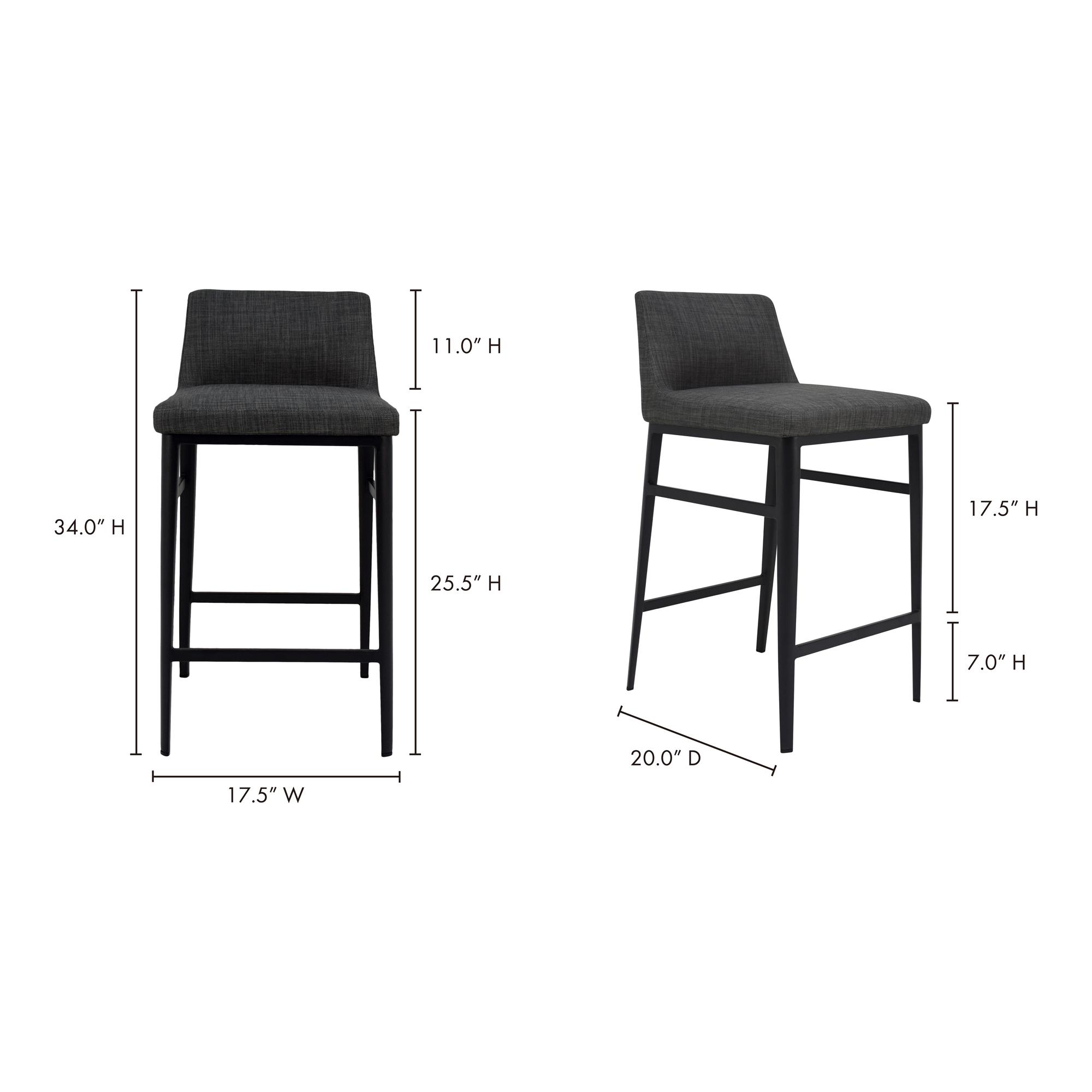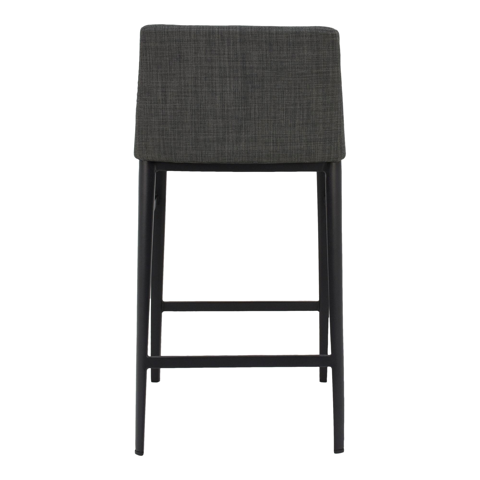 Modern and minimalist, the Baron counter stool’s low-backed design and sleek profile add visual appeal with a compact aesthetic, fitting seamlessly into any dining or kitchen area. Fabric upholstery, powder-coated steel base, and footrest deliver a plush and comfortable seating experience with class and convenience.