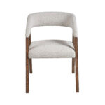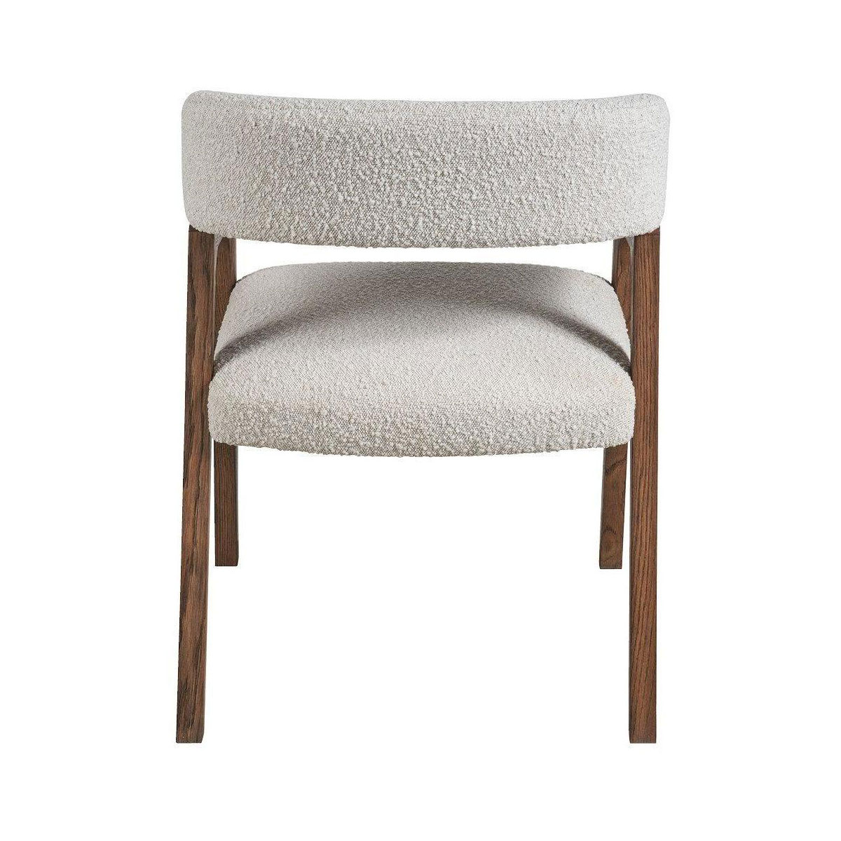 Crafted with a luxurious Medium Brown Oak finish, the Barrel Back Dining Chair features sleek, clean lines and an open back design, upholstered in sophisticated Oris Snow fabric. Its contemporary silhouette and cool, inviting aesthetic make it a perfect blend of comfort and style for any modern dining space.