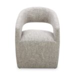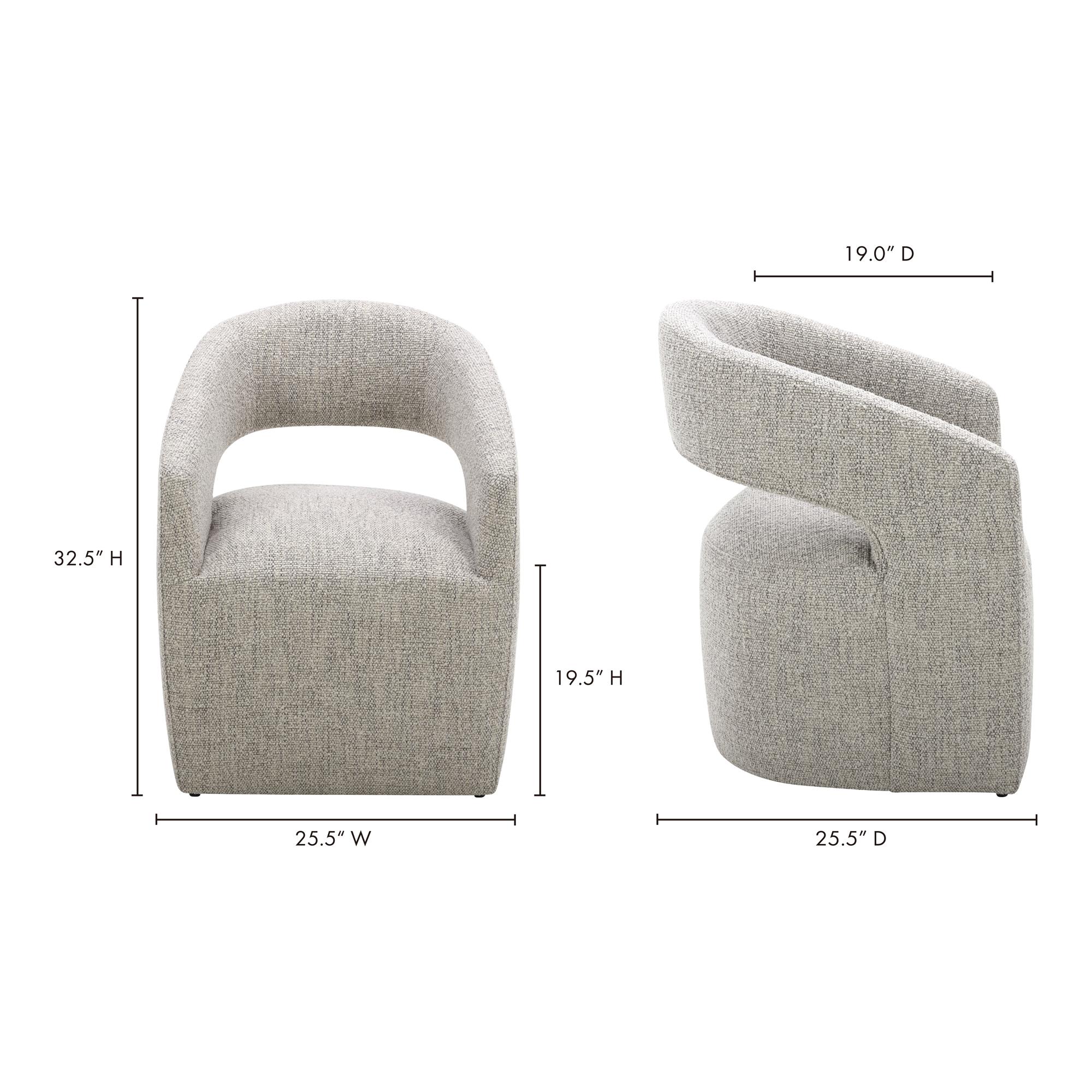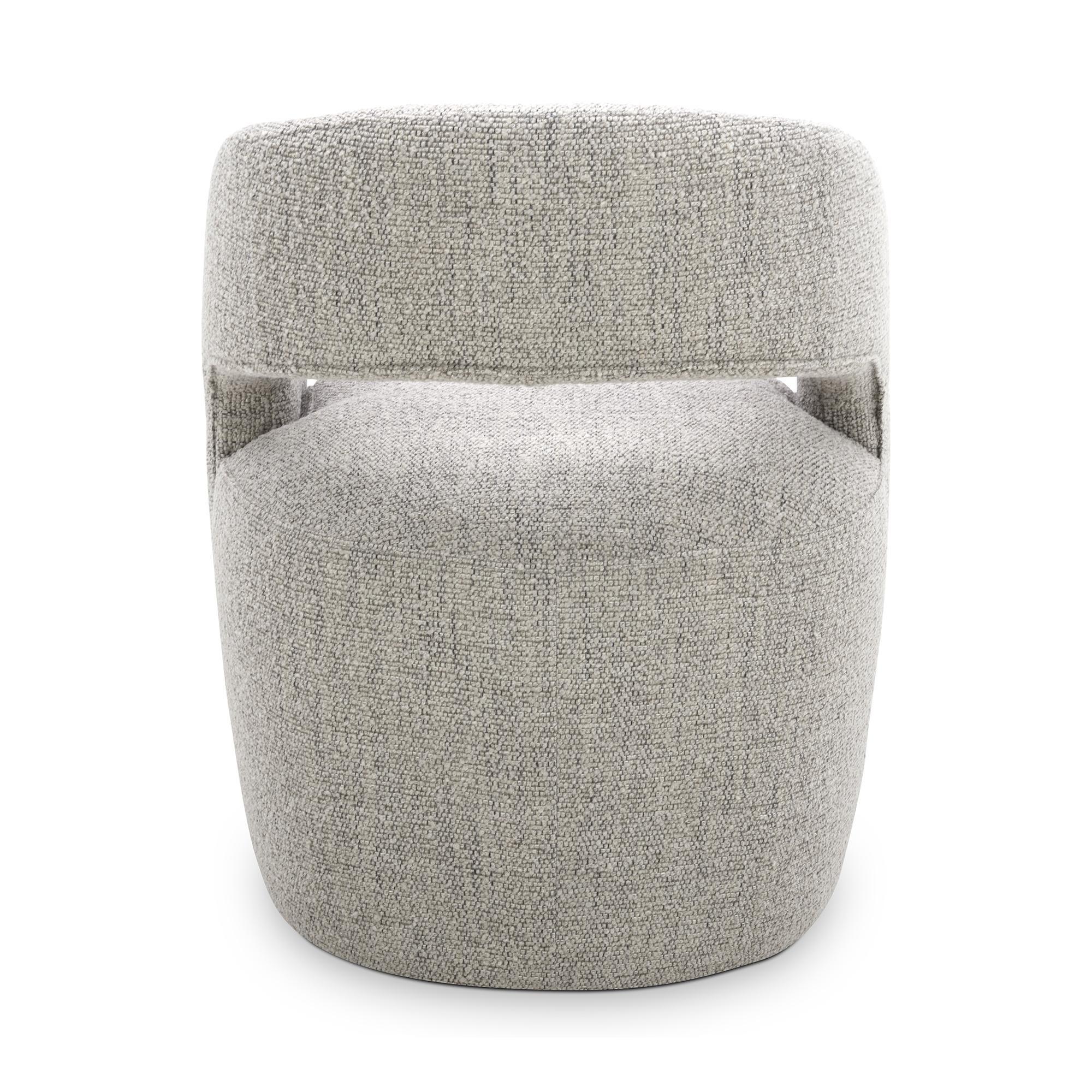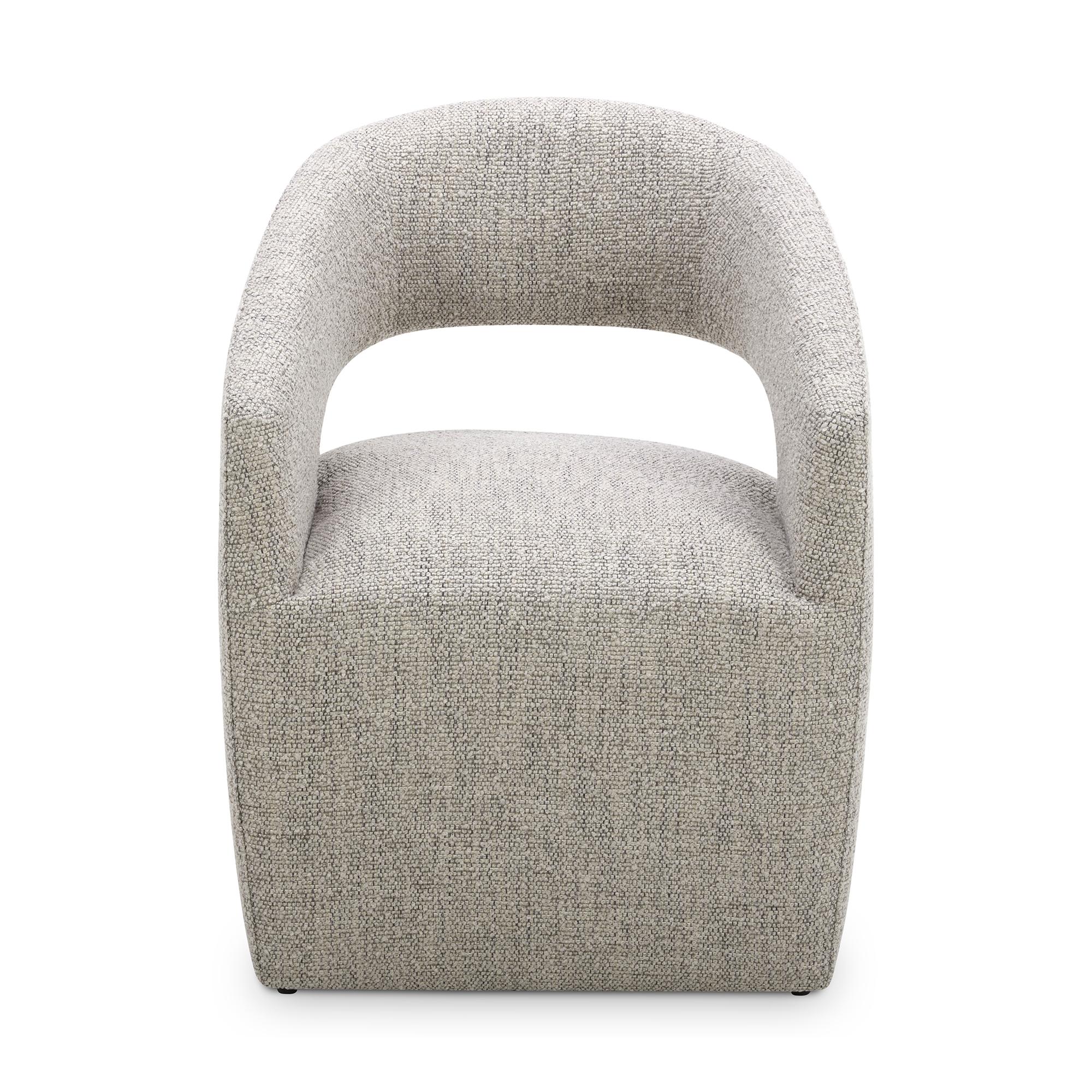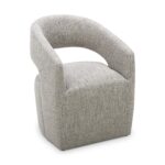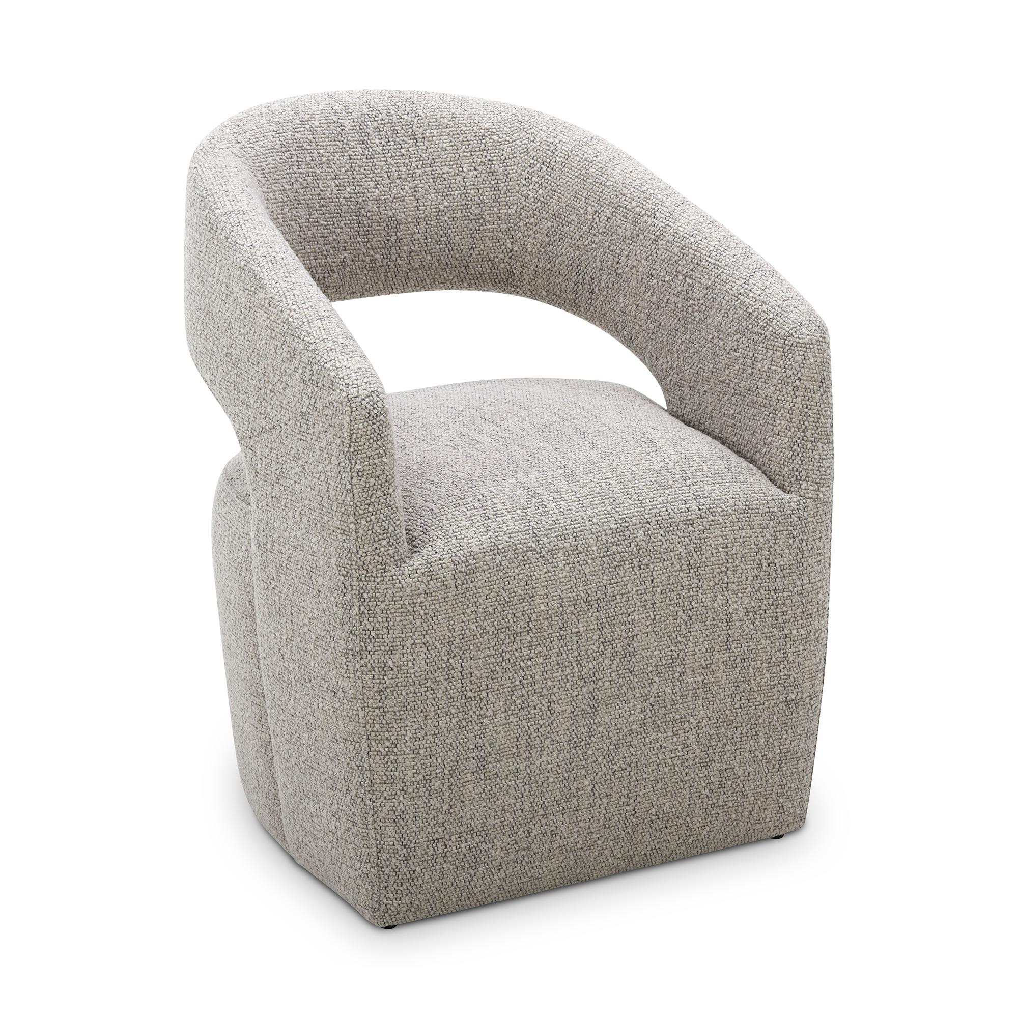 Dinner’s ready, and Barrow is rolling in. A curved barrel back wraps you in living-room comfort, so lingering feels like part of the plan. Upholstered in Gray Storm NeverFear™ performance boucle, it brings texture with an easy-care mindset. Inside, a solid wood and plywood frame supports feathers, high-density foam, and poly-fill. Add a swivel base and hidden casters, and every toast, refill, and chat stays effortless. Pull up, then glide back without leaving a mark.