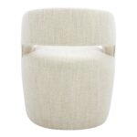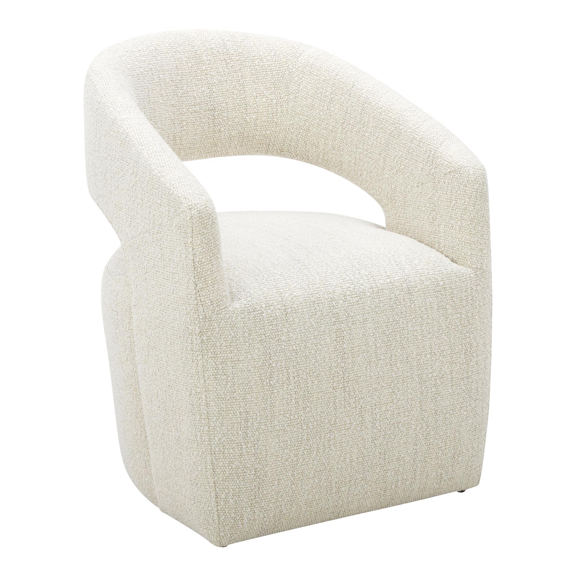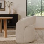 Dinner’s ready, and Barrow is rolling in. A curved barrel back wraps you in living-room comfort, so lingering feels like part of the plan. Upholstered in White Mist NeverFear™ performance boucle, it brings texture with an easy-care mindset. Inside, a solid wood and plywood frame supports feathers, high-density foam, and poly-fill. Add a swivel base and hidden casters, and every toast, refill, and chat stays effortless. Pull up, then glide back without leaving a mark.